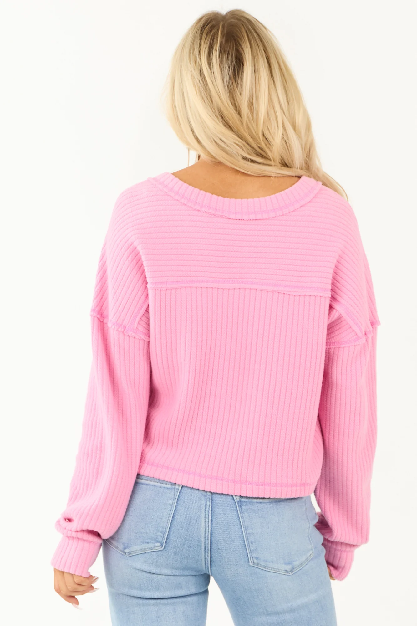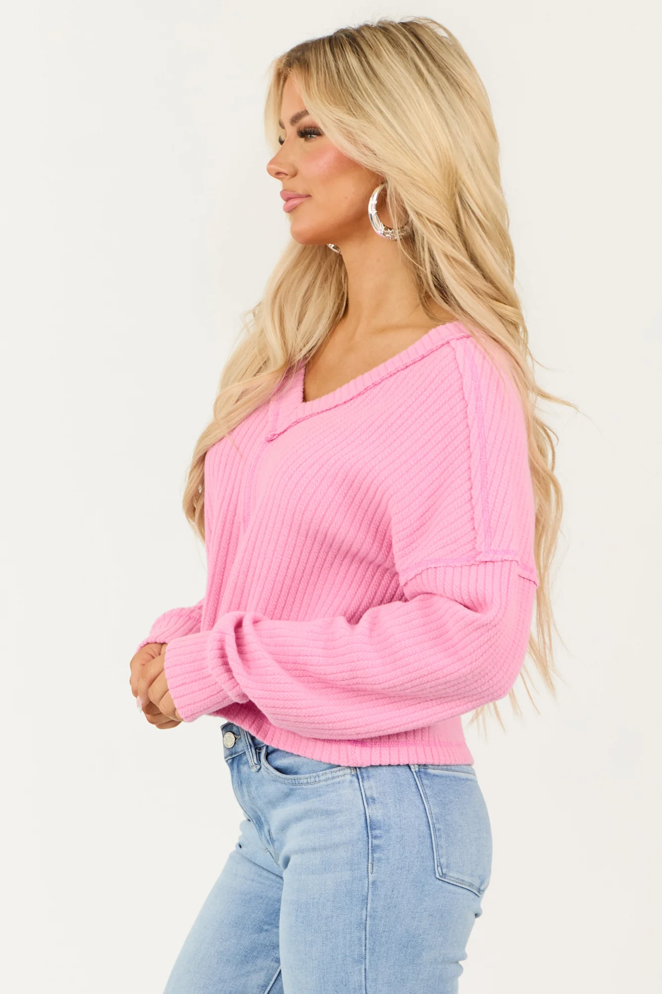 Step up your fashion game with our Pink V Neck Ribbed Knit Sweater. Made from a stretchy textured knit, this sweater features drop shoulder construction and long sleeves for a trendy look. The banded trim adds a touch of style while the sweater remains comfortable with its unlined design. Crafted from 68% Polyester, 29% Cotton, and 3% Spandex, this sweater is perfect for everyday wear. Machine wash cold with like colors, line dry, and iron on low heat for care. Achieve the best results with dry cleaning. Available in sizes S, M, and L. Model is wearing a size Small. Model’s Profile: Size 1, Height 57″, Bust 34″, Waist 26″