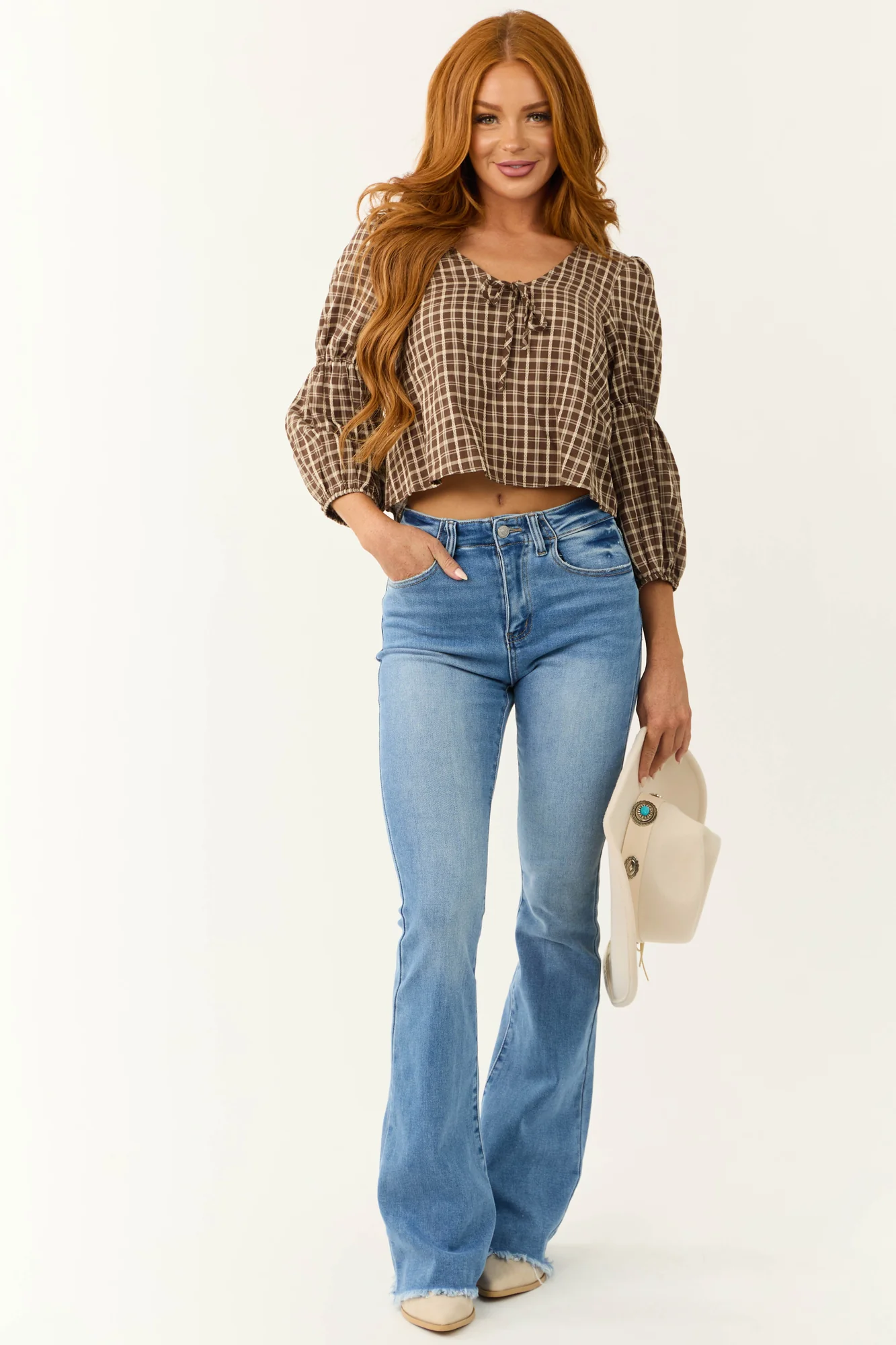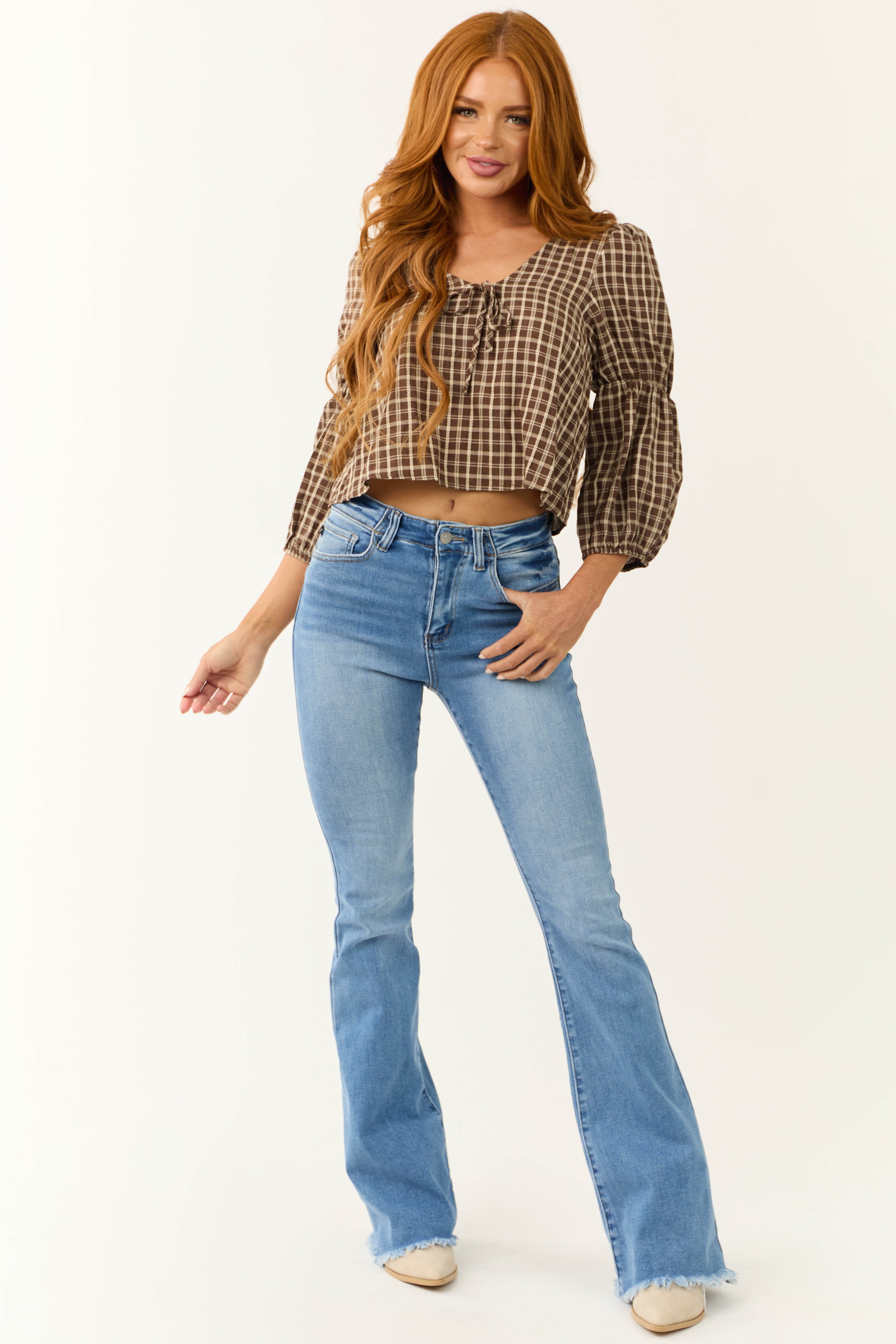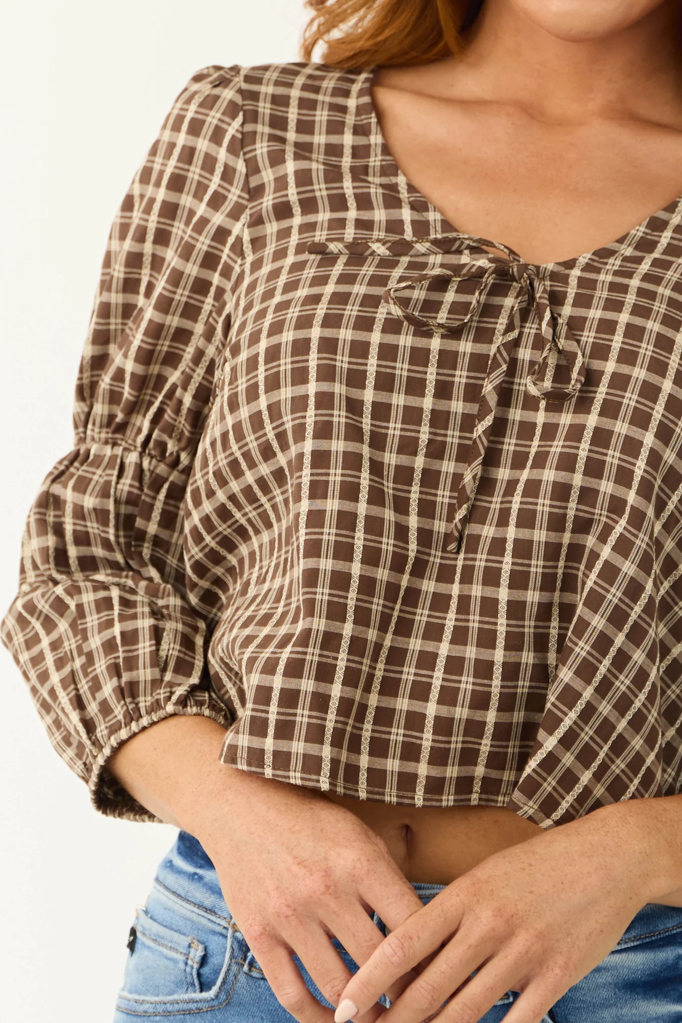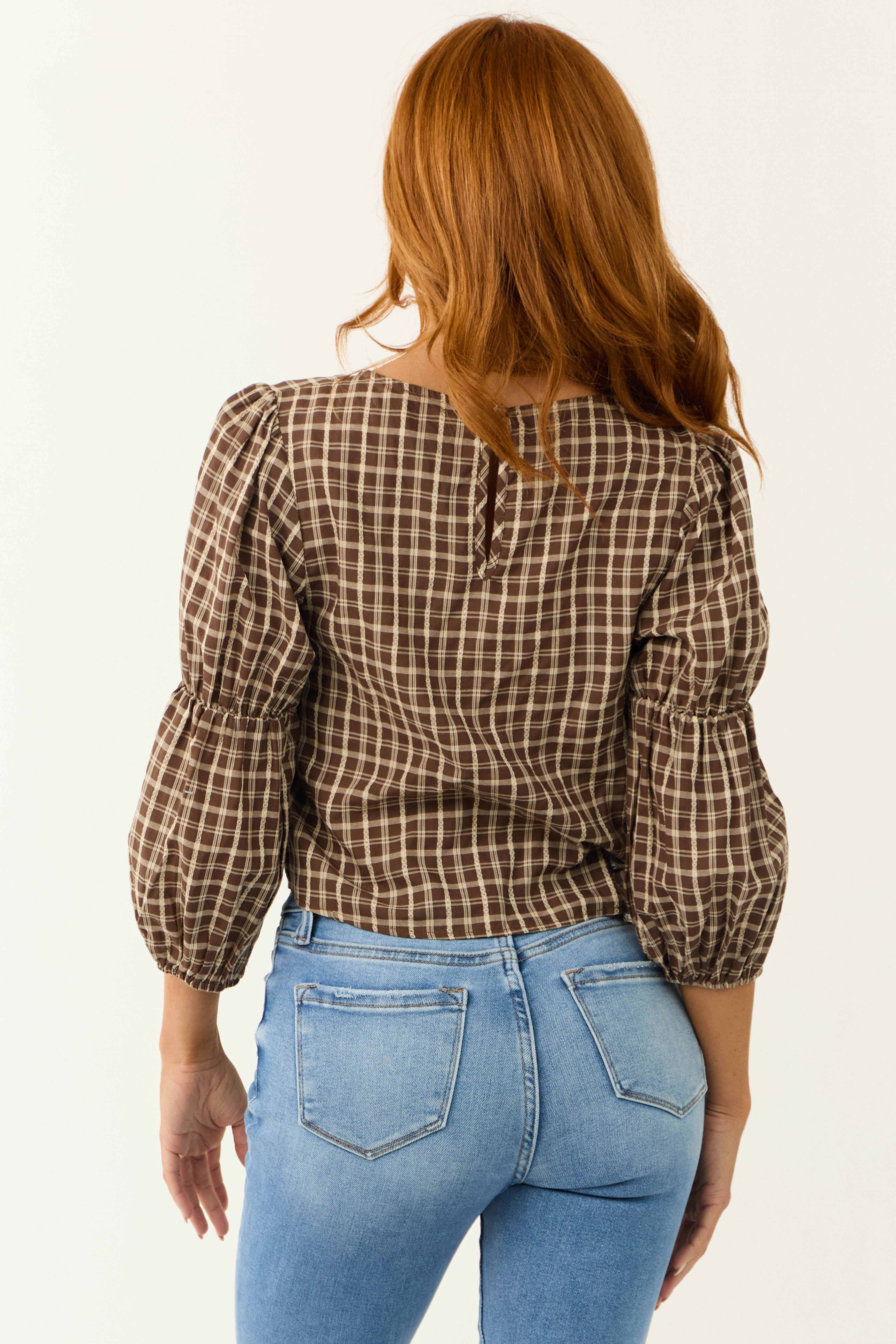 Stay stylish and comfortable with our Plaid 3/4 Sleeve Walnut Cotton Top. Made from non-stretchy woven cotton in a cream shade, this top features a V neckline, 3/4 sleeves with elastic cuffs, and a keyhole back with a button closure. The charming bow detail on the front adds a trendy touch. Perfect for any occasion, whether its daytime or fall season. Hand wash cold for the best care. Available in sizes S, M, and L.