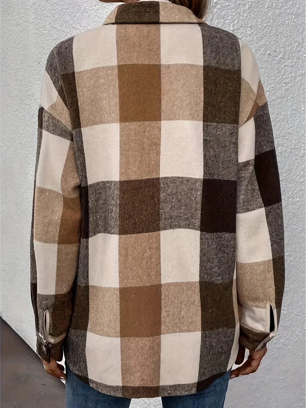 Discover the stylish versatility of our Plaid Collared Neck Shacket with a unique curved hem design. Crafted from 95% polyester and 5% spandex, this shacket offers the perfect blend of comfort and style. Stay on-trend with this lightweight piece that transitions effortlessly from day to night. Machine washable for easy care. Elevate your wardrobe with this essential staple. Available in camel in multiple sizes.