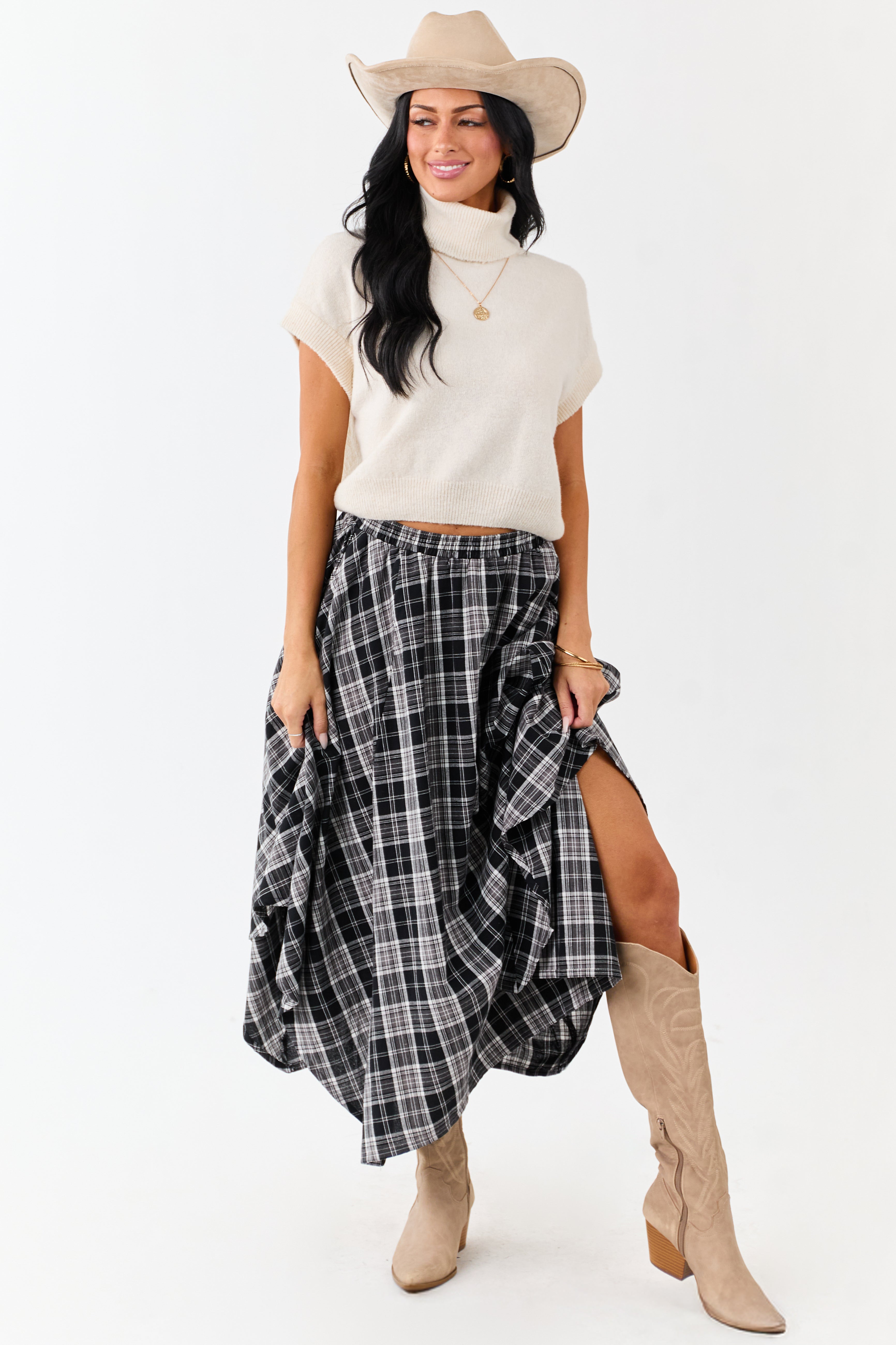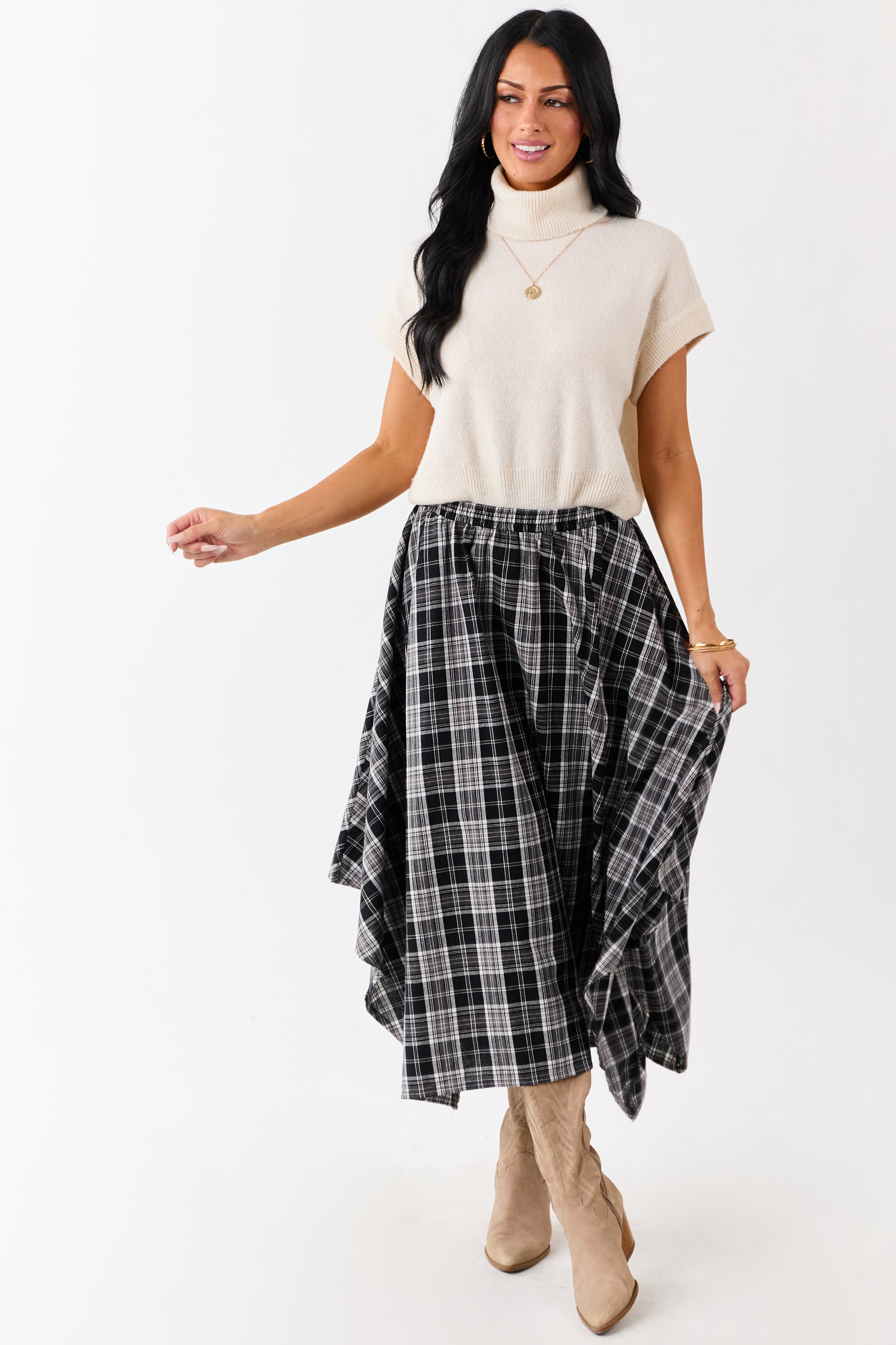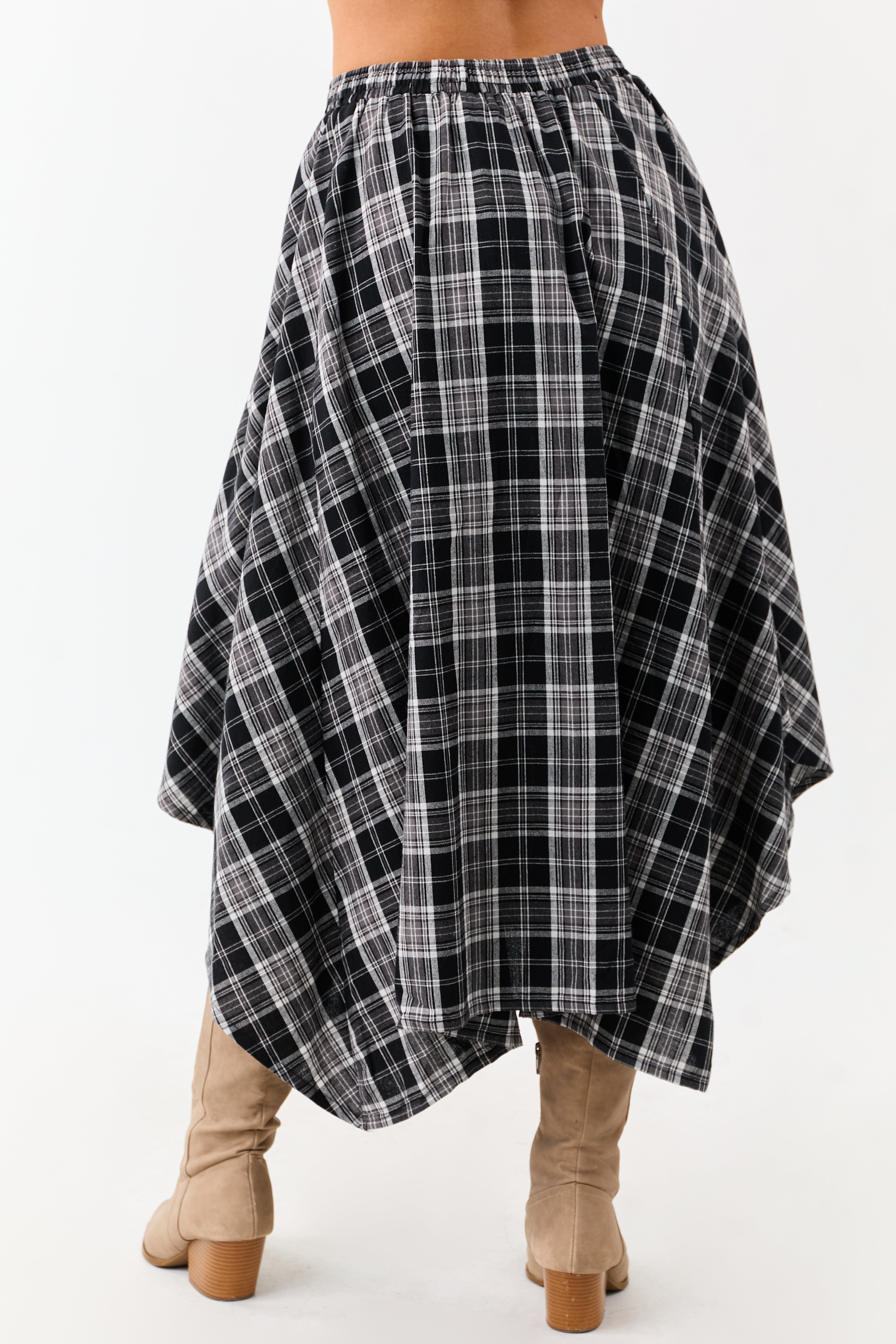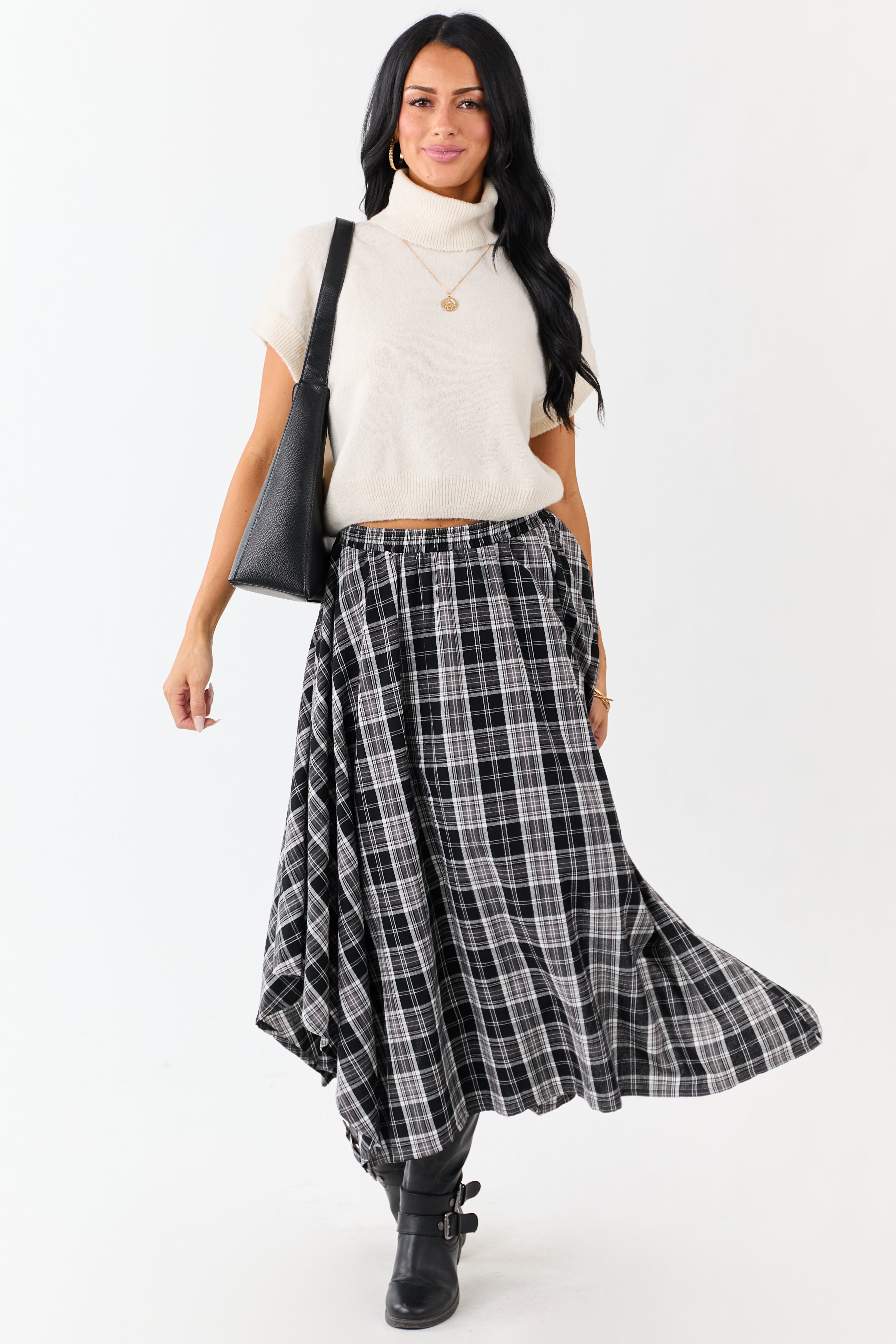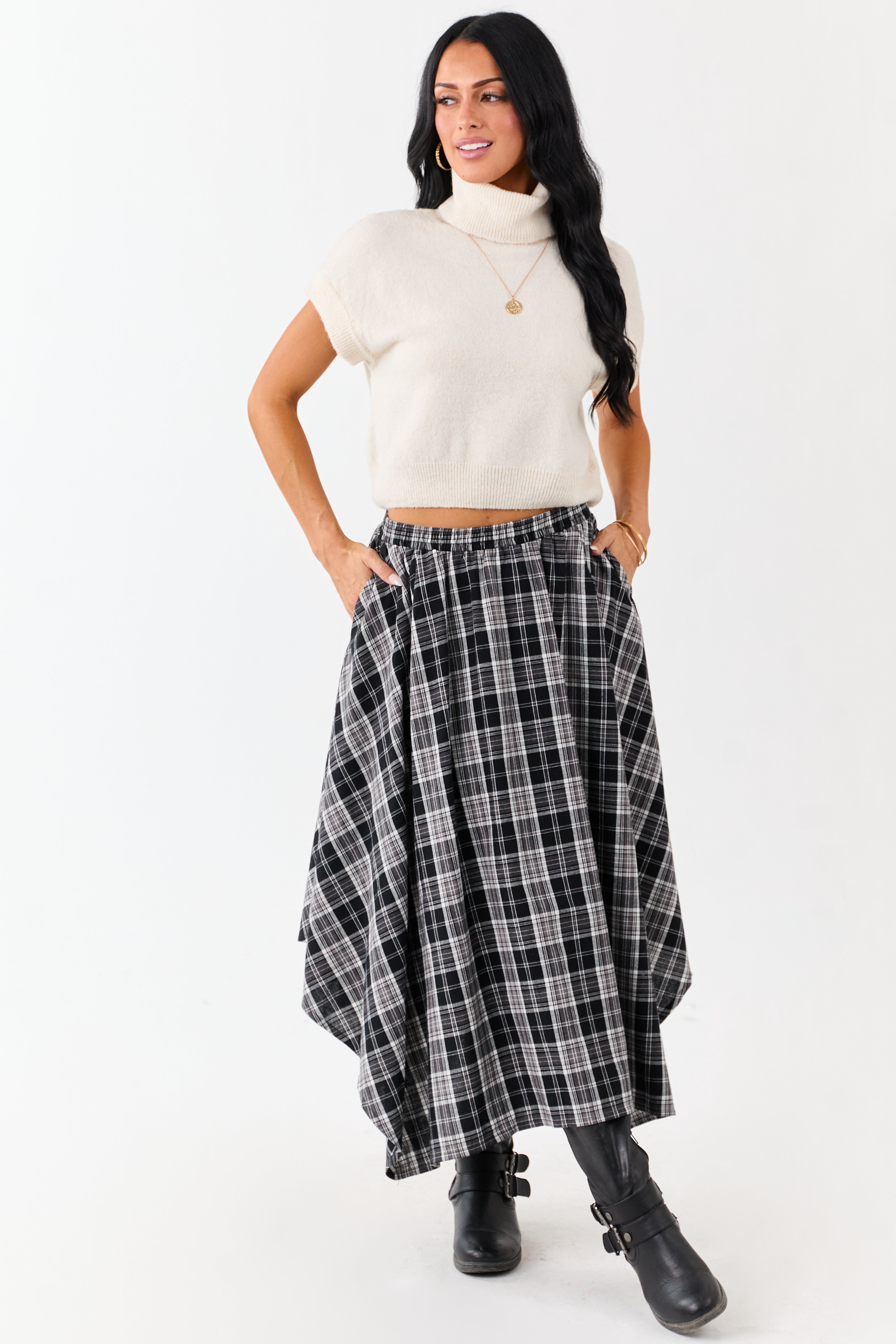 Indulge in timeless elegance with this black & off white plaid cotton midi skirt featuring a high-low side cut. Made from breathable cotton, this skirt boasts a stretchy smocked waistband, side pockets, and a comfortable fit. Unlined for a lightweight feel. Please note that each piece may vary slightly due to the cutting and sewing process. Model is 59″ and wears a size Small.