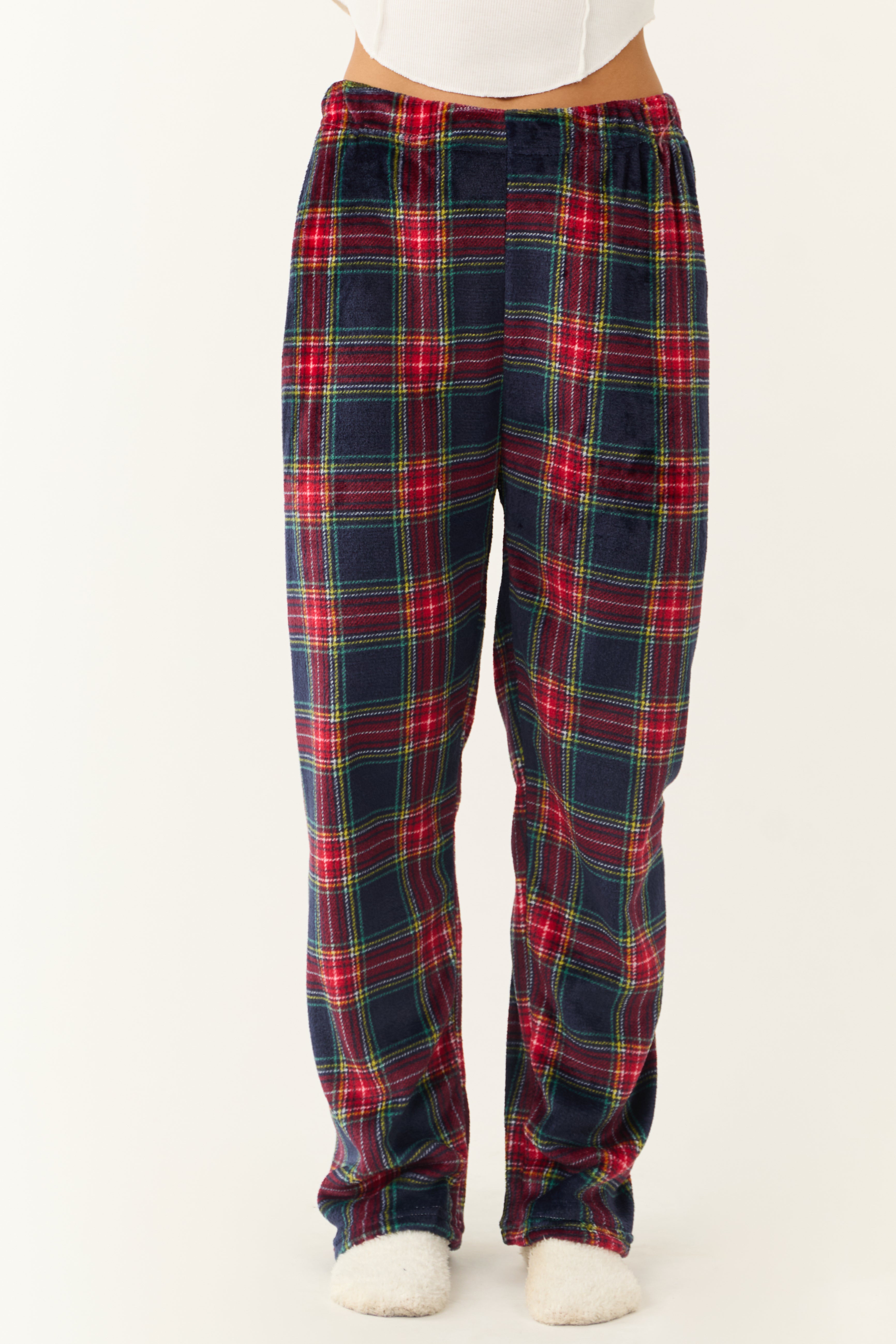 Indulge in cozy comfort with these Ruby and Navy Plaid Fleece Pajama Pants . The non-stretchy woven fabric features shades of Ruby, Navy, Jade Green, White, and Canary Yellow. Designed with an elastic waist for extra room, a straight leg cut, and a high-rise fit, these pants offer both style and comfort. Perfect for lounging or sleeping, these pants are sure to become your go-to winter staple. Please note that due to the unique printing and cutting process, each piece may vary slightly. Hand wash cold and hang dry for best care.