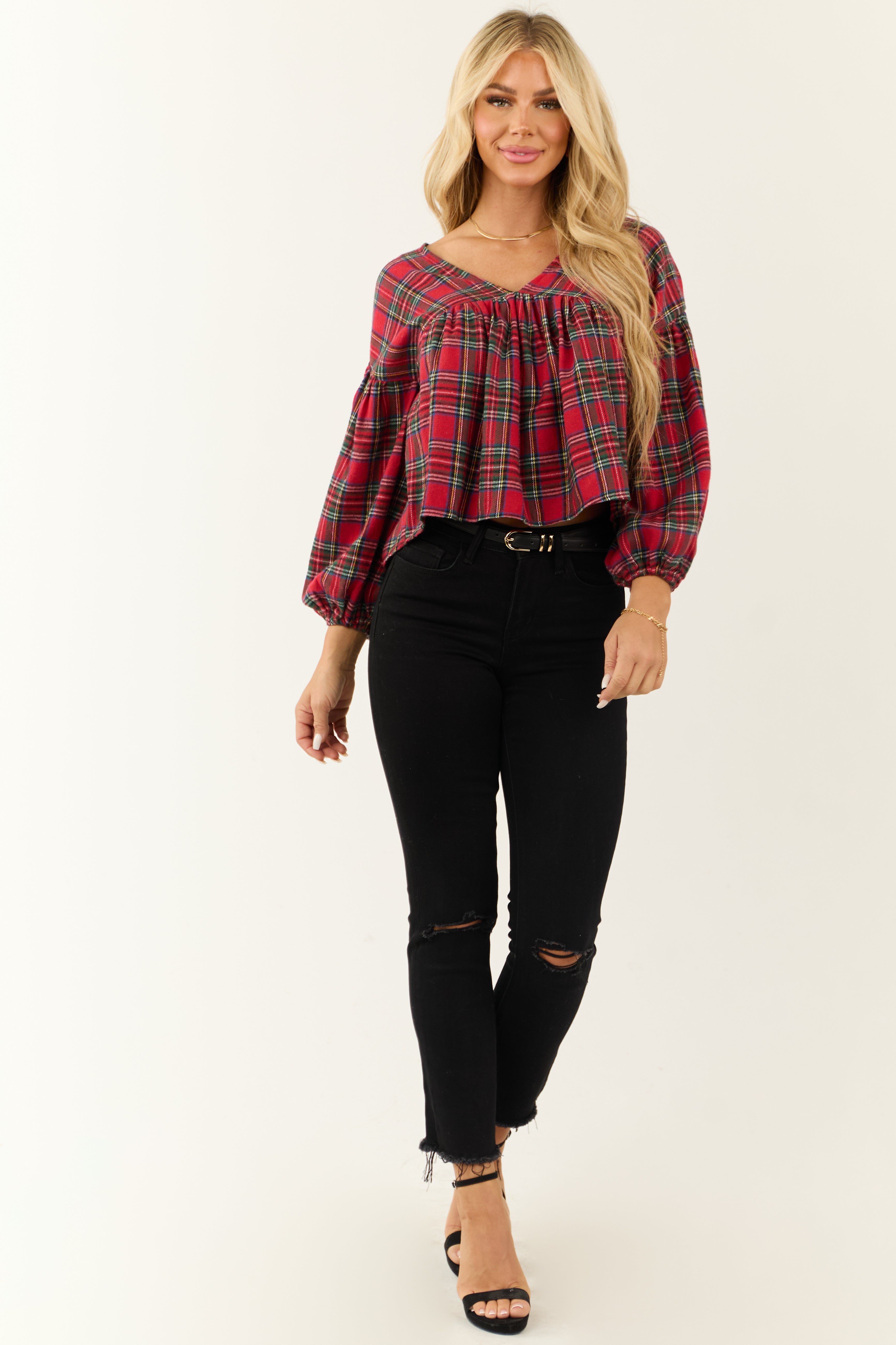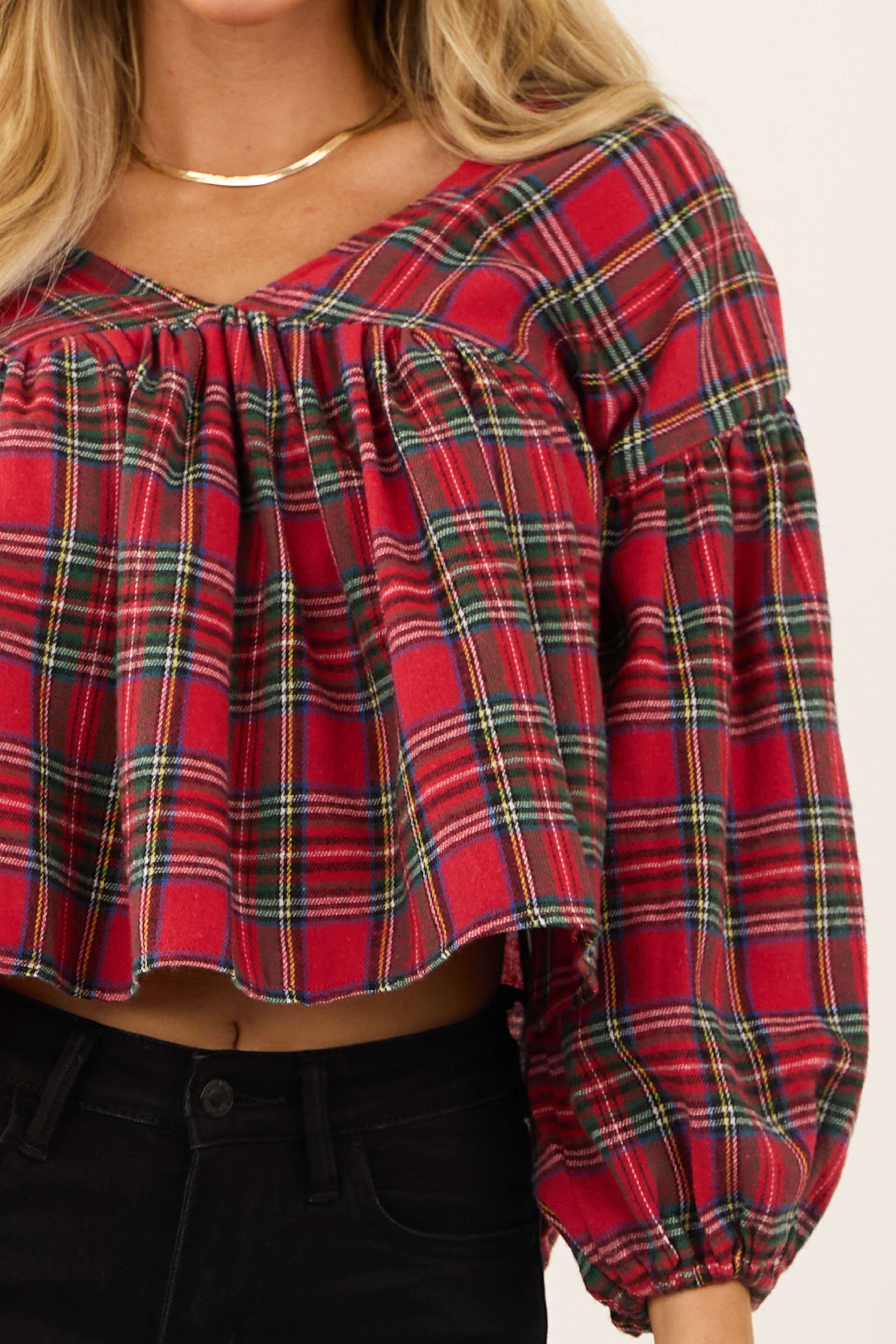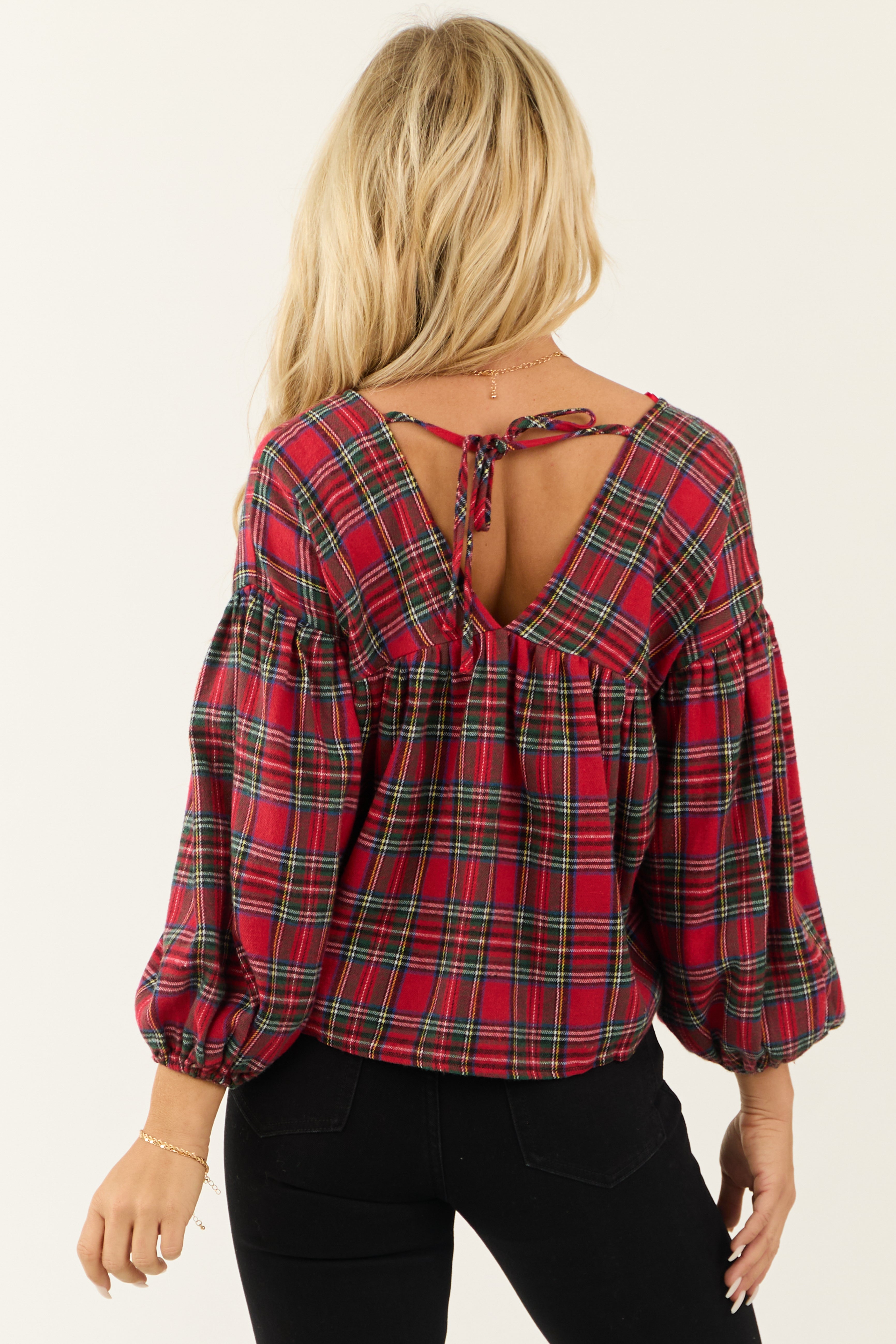 Experience ultimate comfort and style with our Plaid Tie Back Long Sleeve Top in Lipstick Red. Crafted from a non-stretchy woven fabric in shades of Lipstick Red, Off White, Forest Green, Cobalt, and Lemon, this top features a drop shoulder design, V neck, and elastic cuffs. The long balloon sleeves and pleated yoke add a chic touch. This unlined top is made of 65% Polyester and 35% Cotton. Care instructions: Hand wash cold, do not bleach, do not tumble dry, hang dry. Available in sizes S, M, and L.