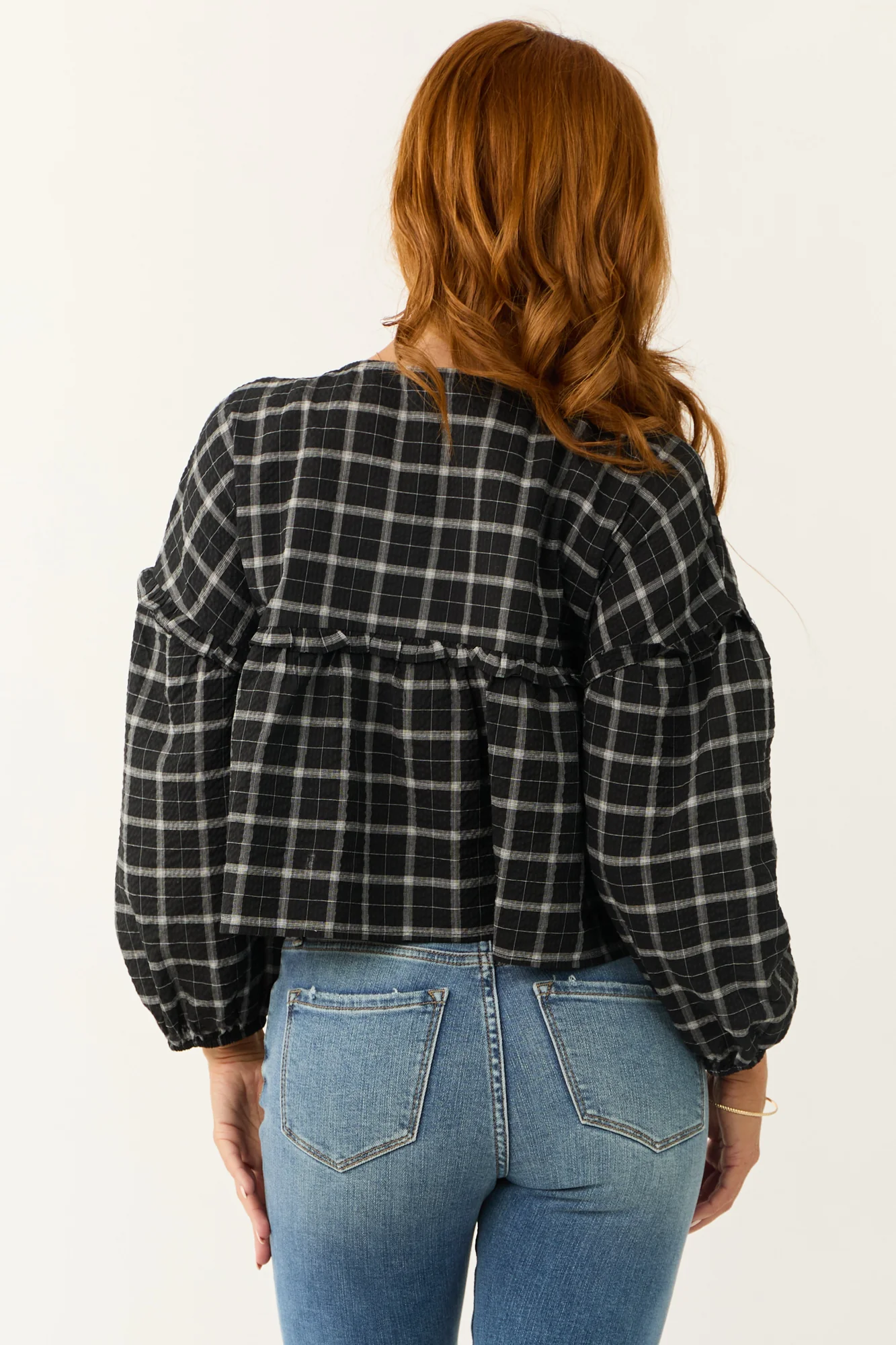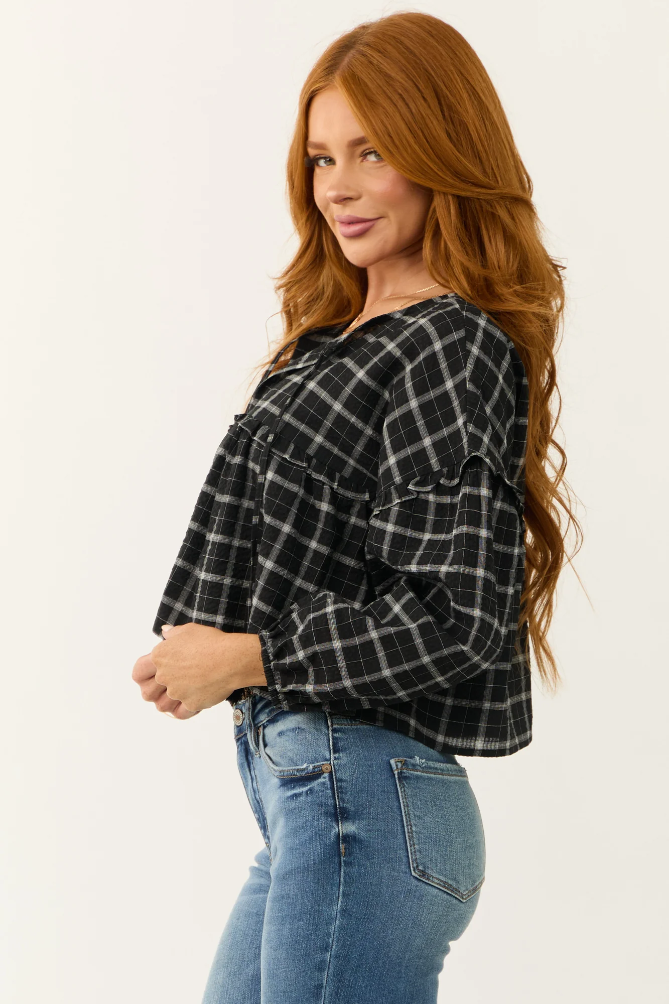 Stay stylish and comfortable in this Plaid V-Neck Long Sleeve Top. Made of 100% Cotton with non-stretchy denim, featuring a drop shoulder, front tie with tassels, elastic cuffs, and frill details. This top is unlined, comes in sizes S, M, and L with a bust range from 41″ to 43″, and lengths from 19″ to 21″. Perfect for daytime wear, this top is ideal for fall and offers a unique print. Please note that due to the cutting and sewing process, each piece may vary slightly. Model is wearing a size Small. Hand wash cold, hang dry.