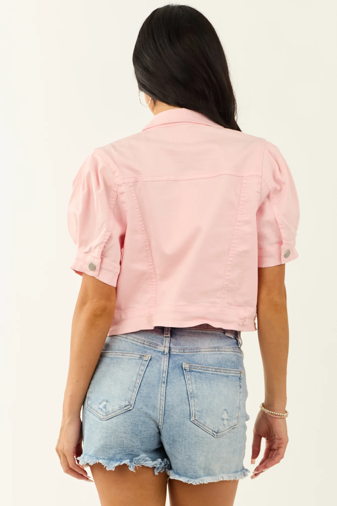 Elevate your style with this trendy Pleated Cropped Denim Jacket featuring puff sleeves and youthful flair. Made of slightly-stretchy denim with distressing details, functional chest pockets, and button cuffs. Collared and cropped for a fashionable look. Sizes: S (Bust 35″, Length 18″, Sleeve 10″), M (Bust 37.5″, Length 18.5″, Sleeve 10.5″), L (Bust 40″, Length 19″, Sleeve 11″). Self: 92% Cotton, 6% Polyester, 2% Spandex. Imported. Model is wearing size Small. Models Profile: Size 1, Height 59″, Bust 34″, Waist 26″.