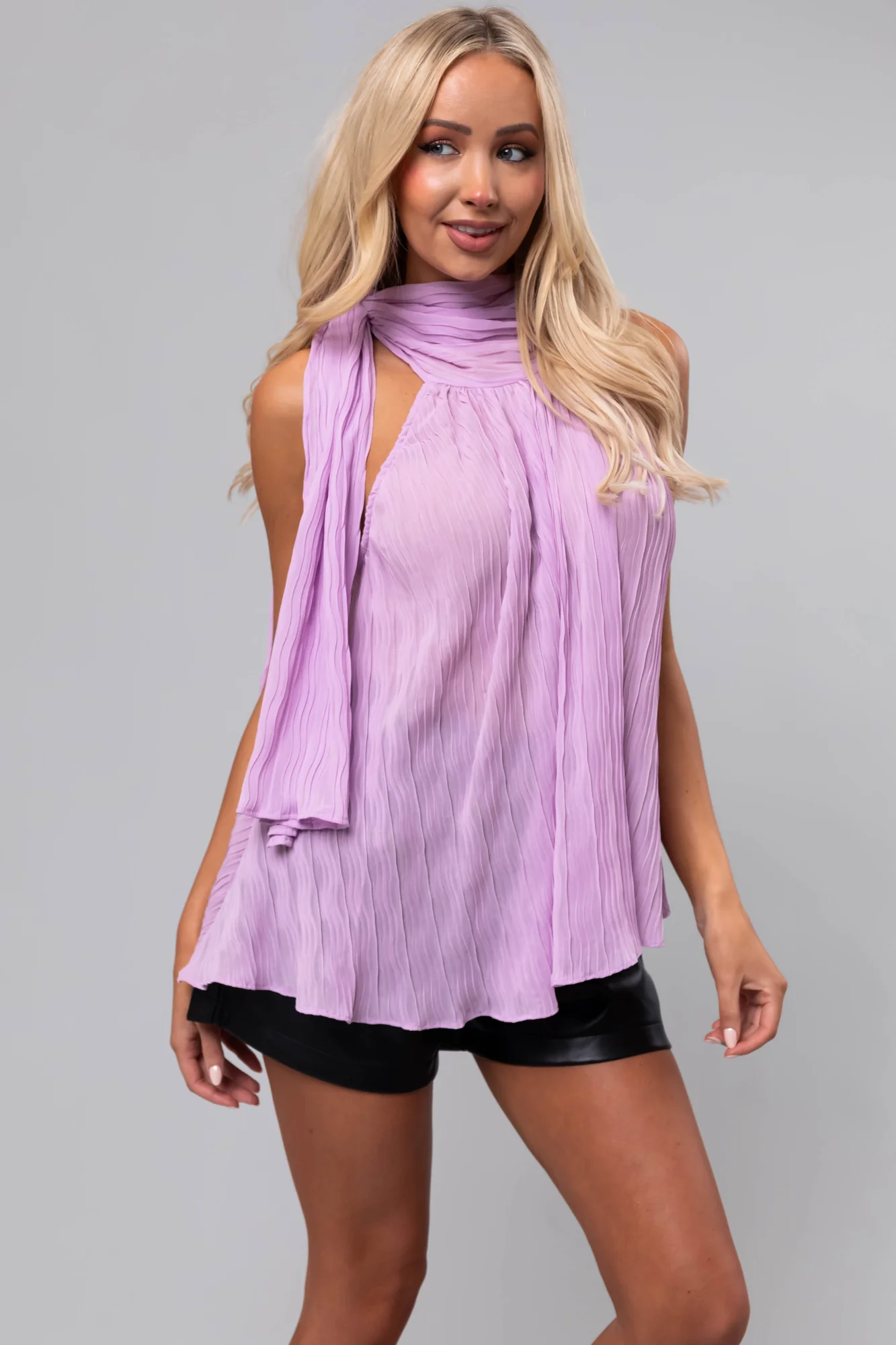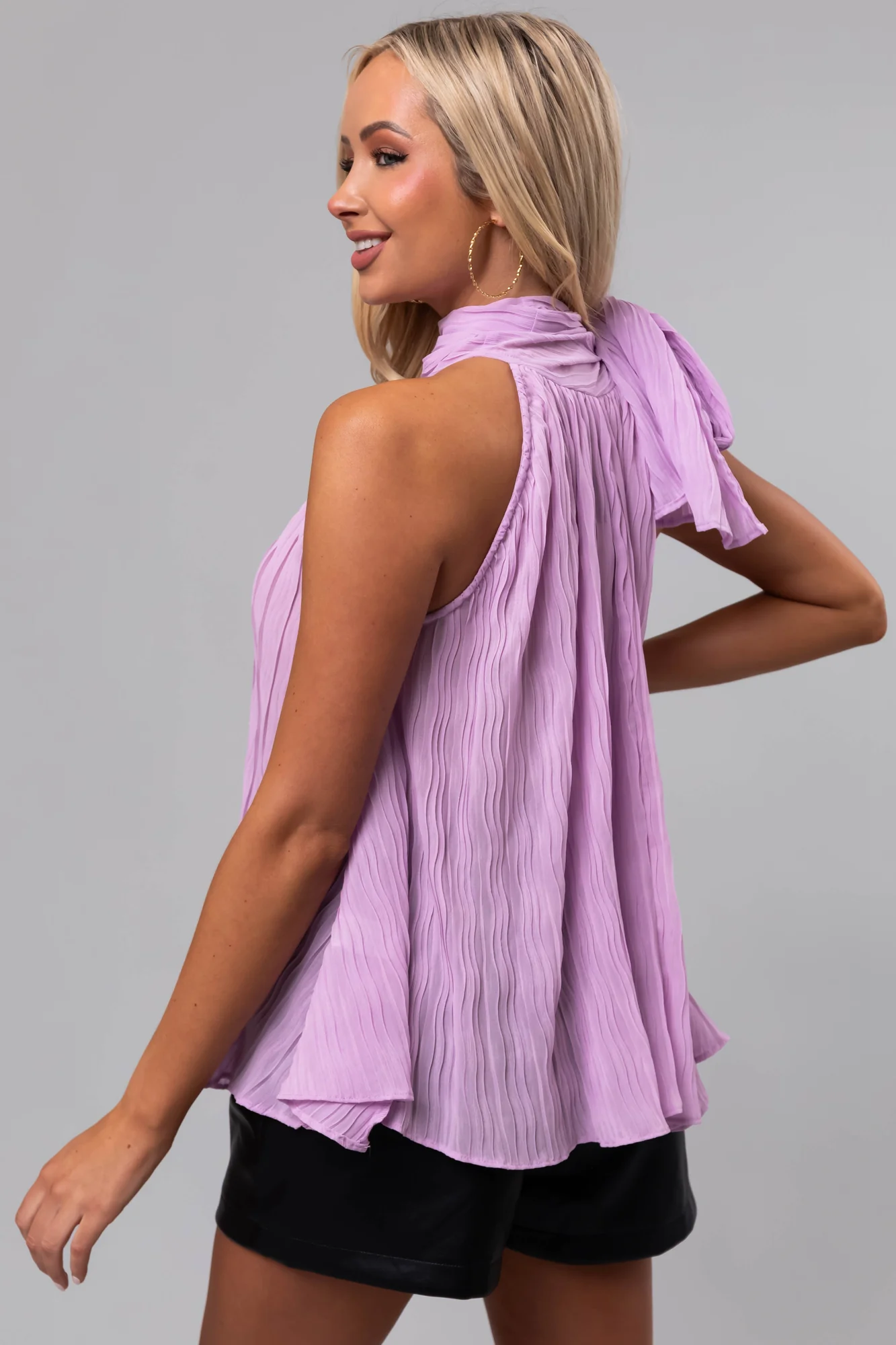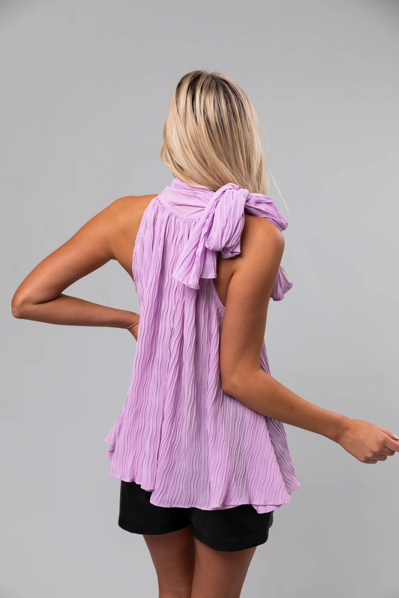 Indulge in elegance with our Lavender Sleeveless Blouse. Crafted from 100% Polyester for a luxurious feel, this blouse features a high neck tie, pleated details, and a flowy A-line fit. The lettuce trim hem adds a touch of femininity. Perfect for date nights, it comes in sizes S, M, and L with strap lengths of 6”. Enhance your wardrobe with this timeless piece. Note: Hand wash cold water separately to maintain color vibrancy. Hang to dry.