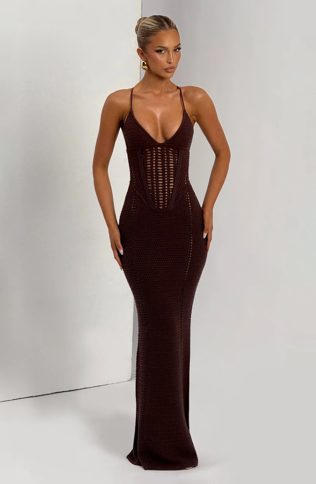 Experience effortless elegance and playful charm with our Plum Brown Crochet Knit Maxi Dress. The premium faux crochet knit fabric and boning in the bodice ensure a flattering body-hugging fit, while the eyelet and contour details add a whimsical touch. Complete with lace-up back and cross-over straps for a cinched waist. Unlined and featuring triangle-shaped cups, this maxi dress is perfect for various occasions.