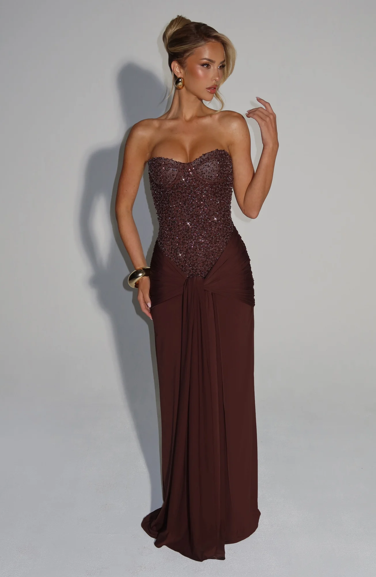 Elevate your style with the Plum Brown Embellished Maxi Dress featuring a stunning mesh bodice, underwired cups, and strapless design. The contrast slinky jersey skirt and tied gathered panels exude sophistication and elegance. This dress is perfect for formal events, weddings, proms, and parties. Stay comfortable with padded cups, boning in the bodice, and invisible zipper closure.