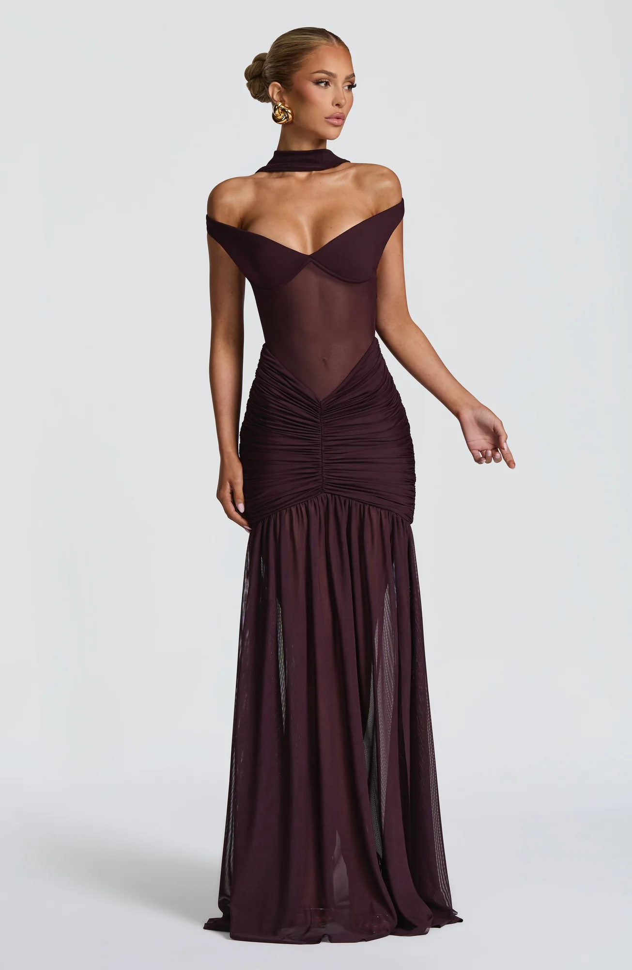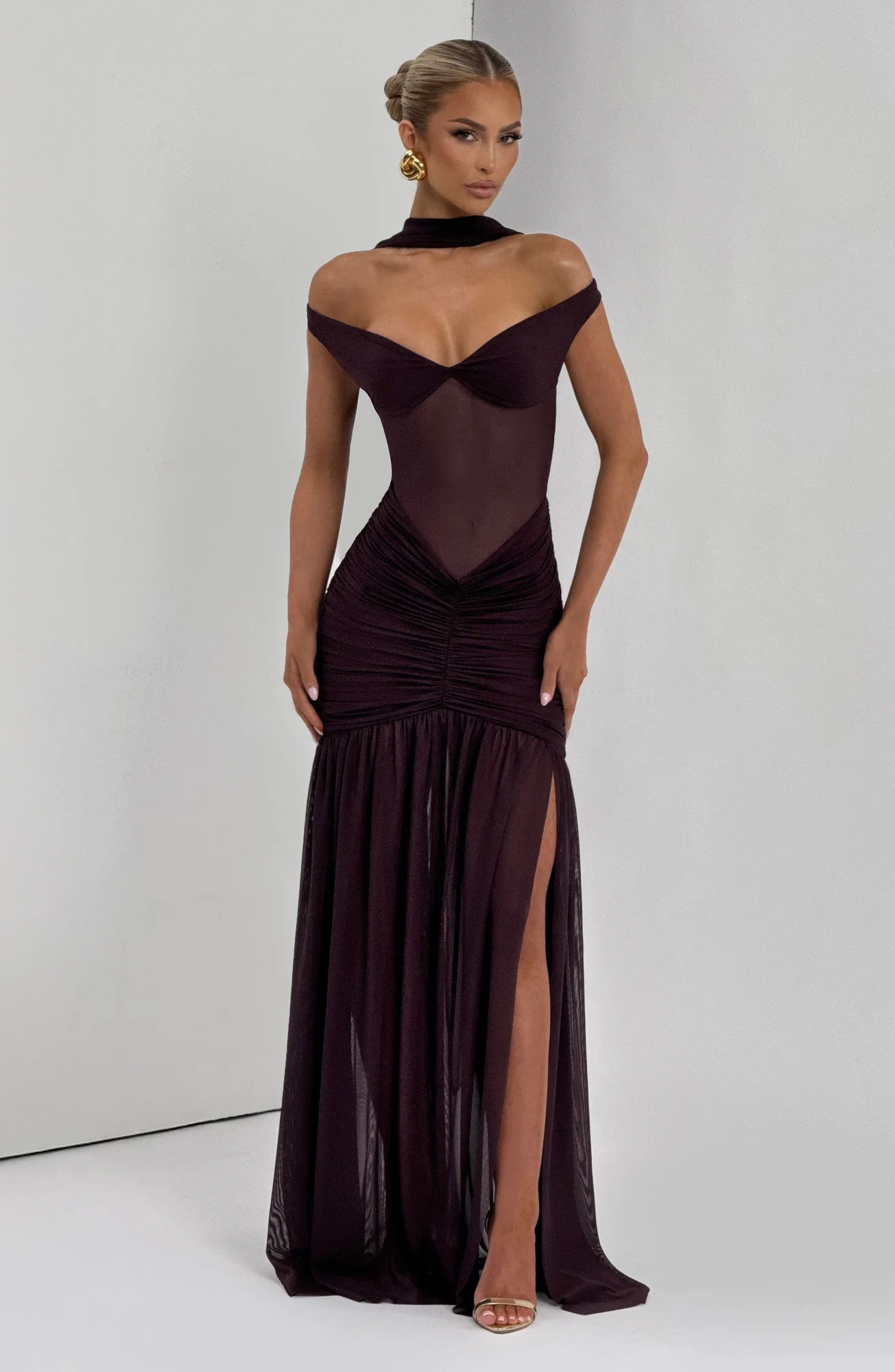 Indulge in the luxurious allure of the Plum Jersey Mesh Maxi Dress. Featuring a sweetheart bardot neckline, sheer mesh bodice, ruched hip panel, and full mesh skirt with a dramatic thigh-high split. Perfect for formal events or special occasions. Includes lined cups and skirt. Pair with the Ayla Scarf for a complete ensemble.