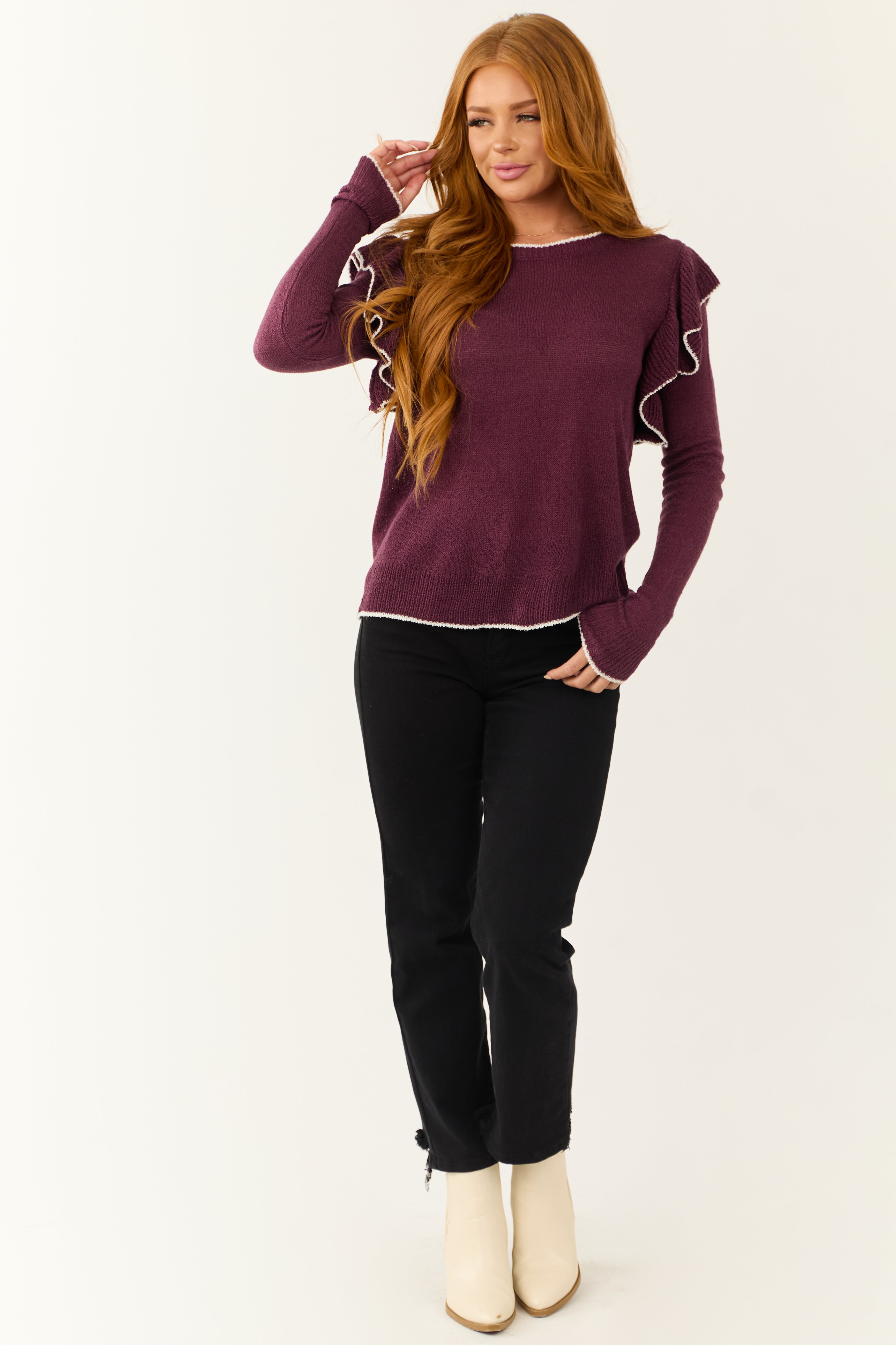 Stay cozy and stylish in this Plum Ribbed Knit Long Sleeve Top featuring a contrast off white trim. Made of high-quality 100% Acrylic material for all-day comfort. This top is stretchy and versatile, offering a flattering fit with sizes available in S, M, L, and XL. Pair it with your favorite bottoms for a chic look. Care instructions: Hand wash cold, do not bleach, hang or line dry.
