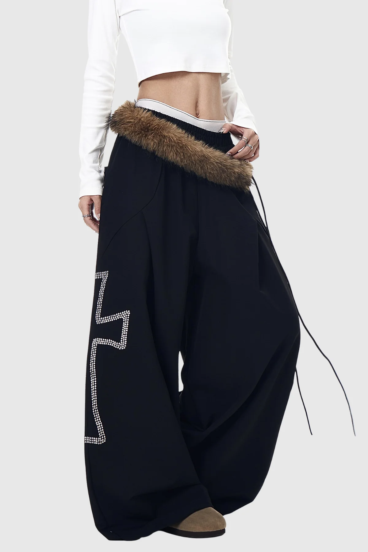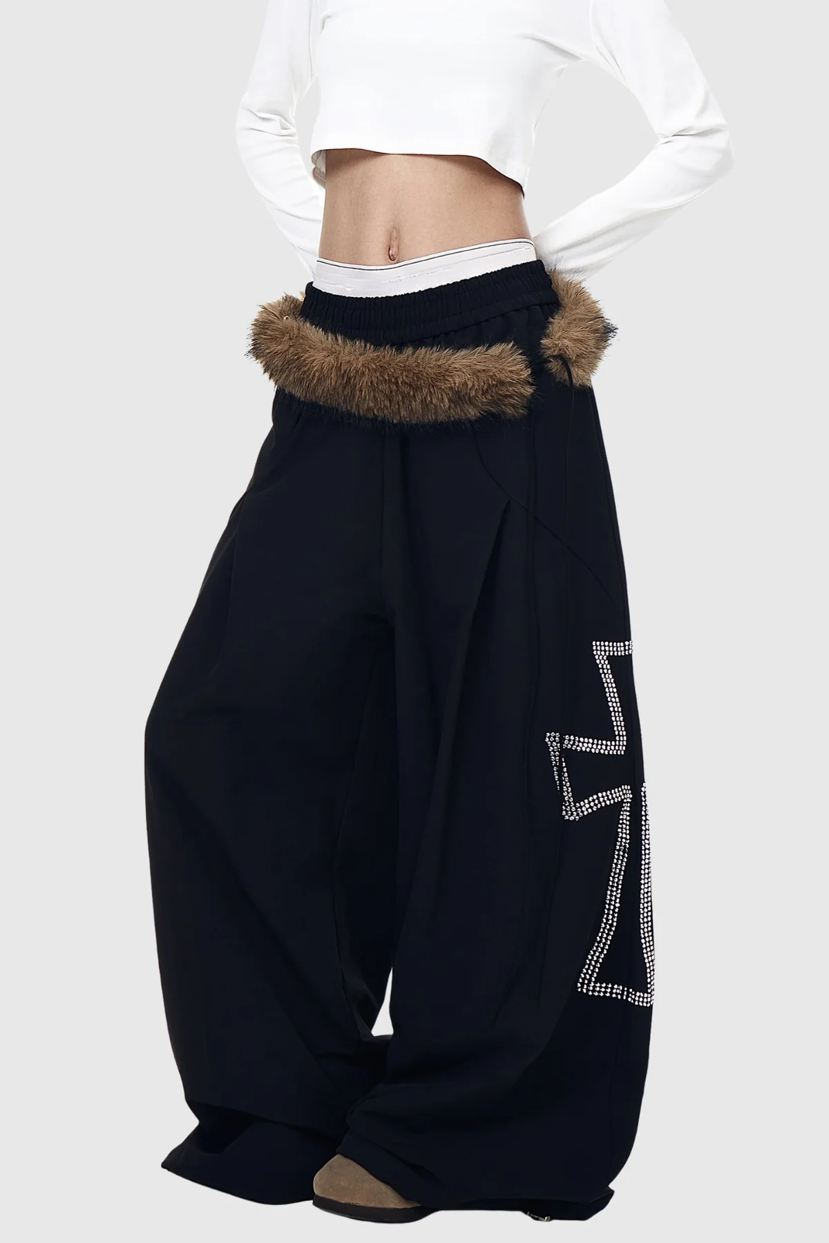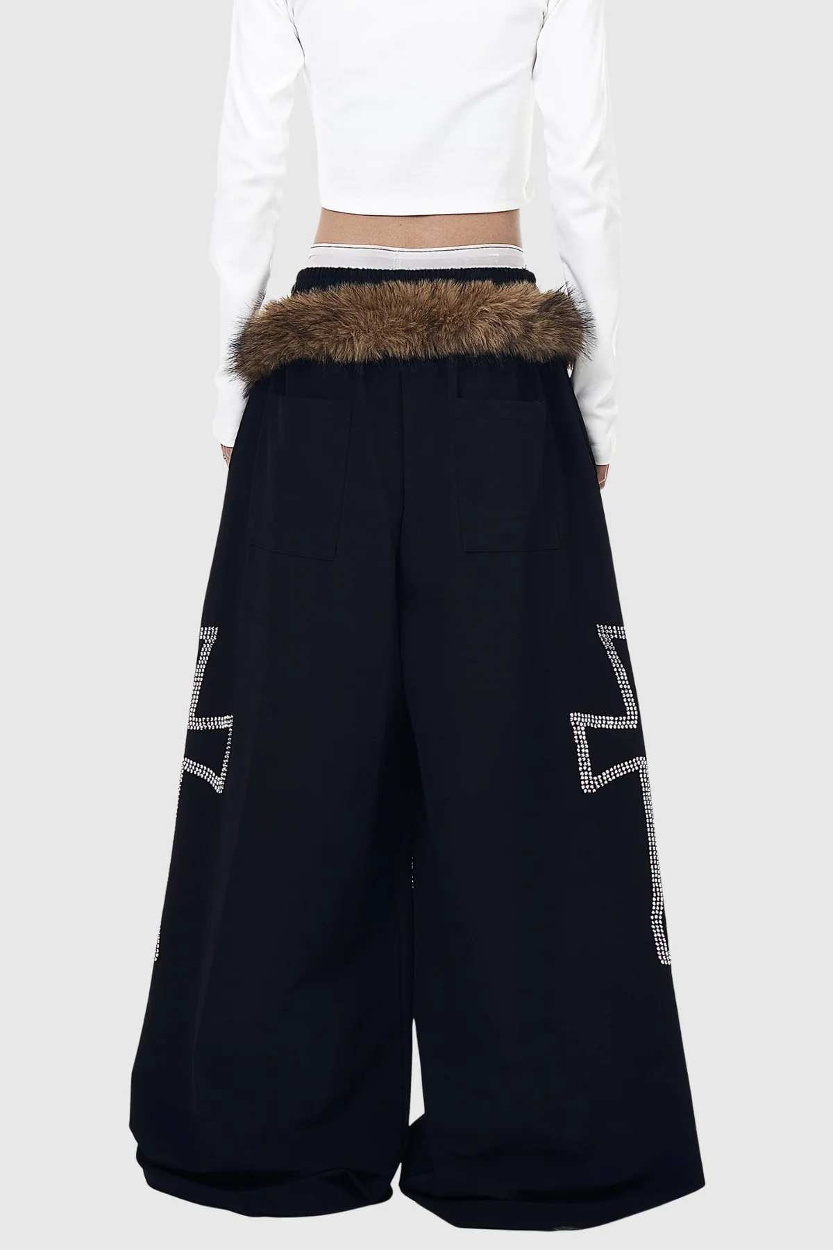 Elevate your wardrobe with the Plush Black Faux Fur Rhinestone Wide Leg Pants . Expertly crafted for bold luxury, these pants feature plush faux fur for exceptional softness and warmth. The wide-leg silhouette ensures a flattering, comfortable fit. Sparkling rhinestone details add a glamorous touch, making them perfect for stylish evening events or standout daytime looks. Combining texture, shine, and ease, these pants are a sophisticated statement piece that enhances any fashion-forward ensemble. Non-stretch fabric. Gentle machine wash recommended. Color may vary due to lighting. Luxuriate in style with these black wide leg pants.