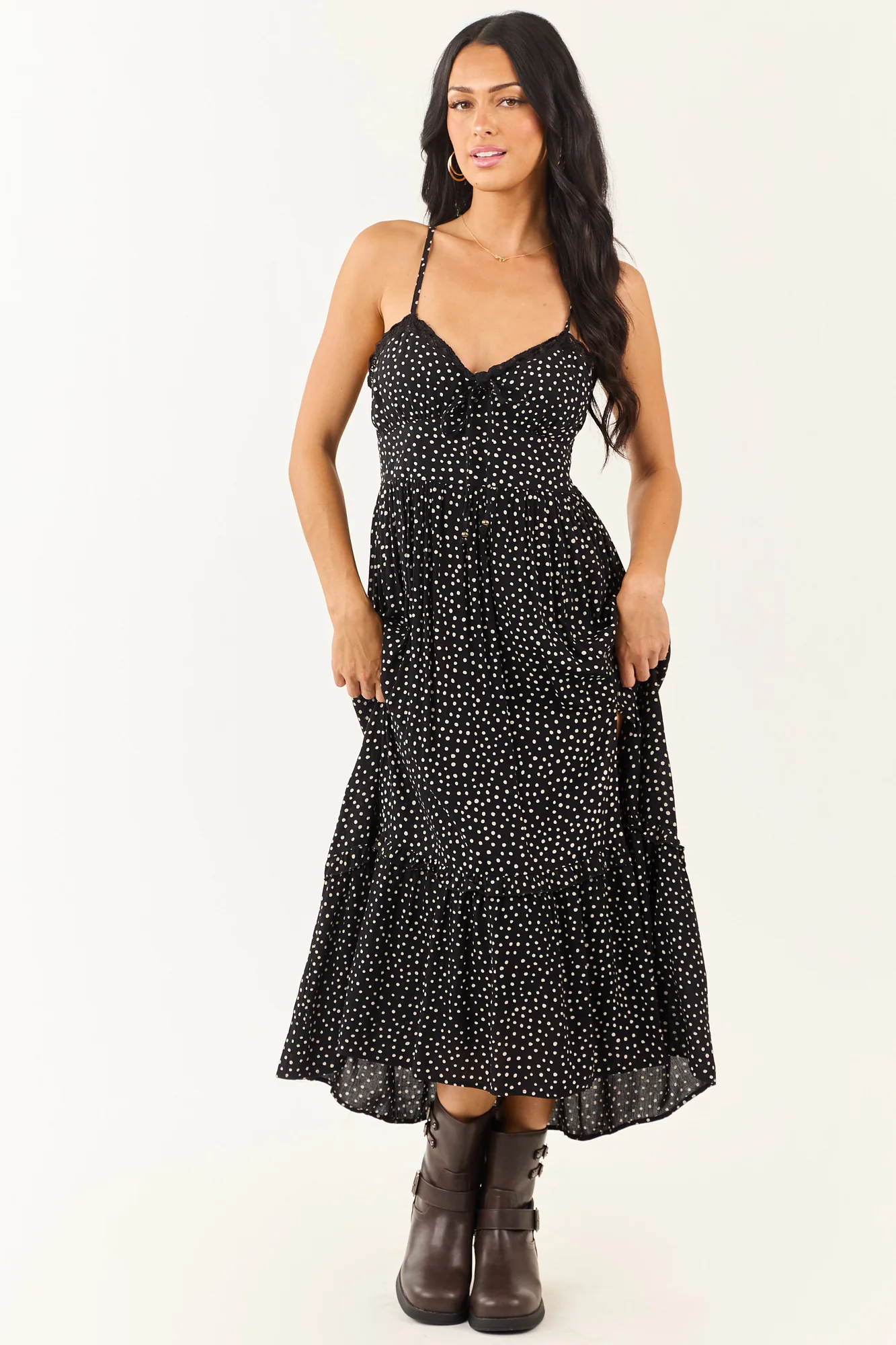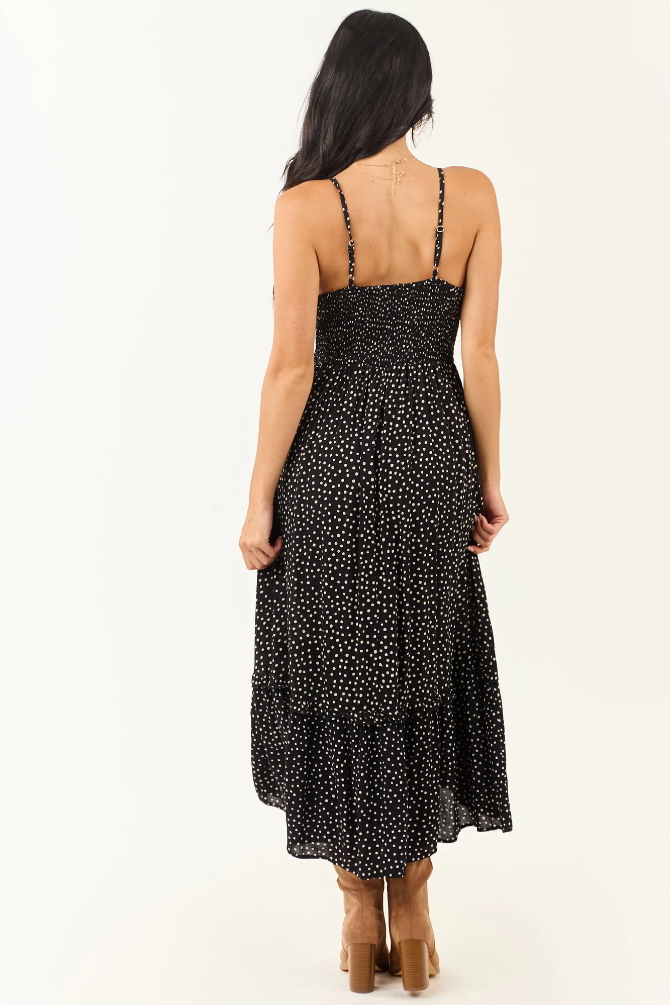 This charming Polka Dot Midi Dress features a breezy skirt, fitted bodice, adjustable spaghetti straps, and a non-cinching bust tie for a flattering fit. The black lace trim, side hem slit, and semi-sheer design add elegance to your ensemble. Crafted from 100% Rayon with a stretchy smocked back, it offers both style and comfort. Perfect for any occasion, its a wardrobe essential for fashion-forward individuals.