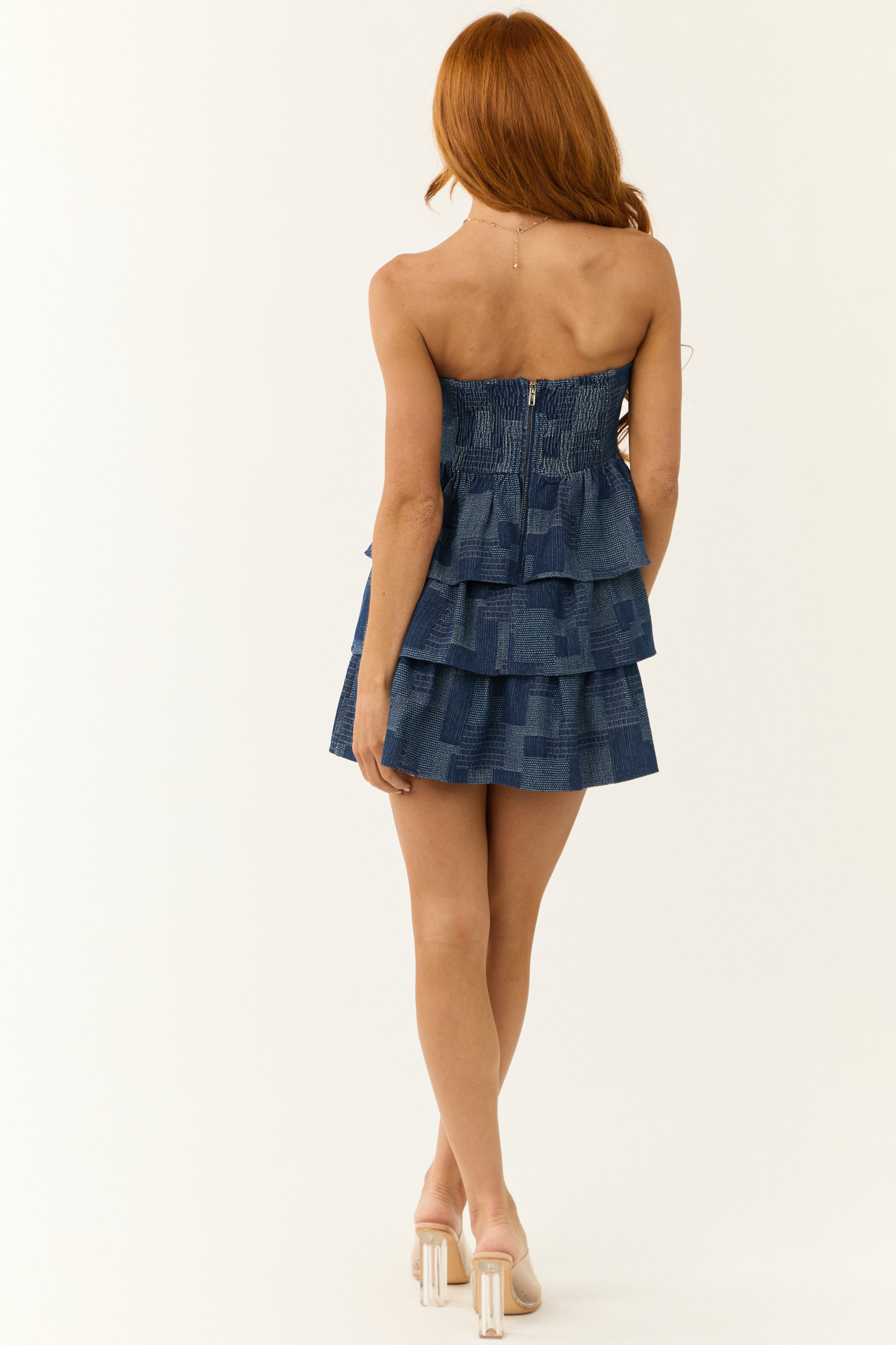 The Powder Blue Denim Strapless Ruffle Dress + Moon is a stylish wardrobe addition suitable for various occasions. Available in sizes S (2-4), M (6-8), and L (10-12), this dress features a geometric patchwork pattern, sweetheart neckline, and elastic back ruching. Made of non-stretchy denim with a self and lining composition of 97% Cotton and 3% Polyester. This dress is unlined and has a zippered back with a hook and eye closure. Length varies from 25 inches to 26 inches, catering true to size based on standard measurements. Hand wash cold and hang dry. Embrace your style with this elegant dress!