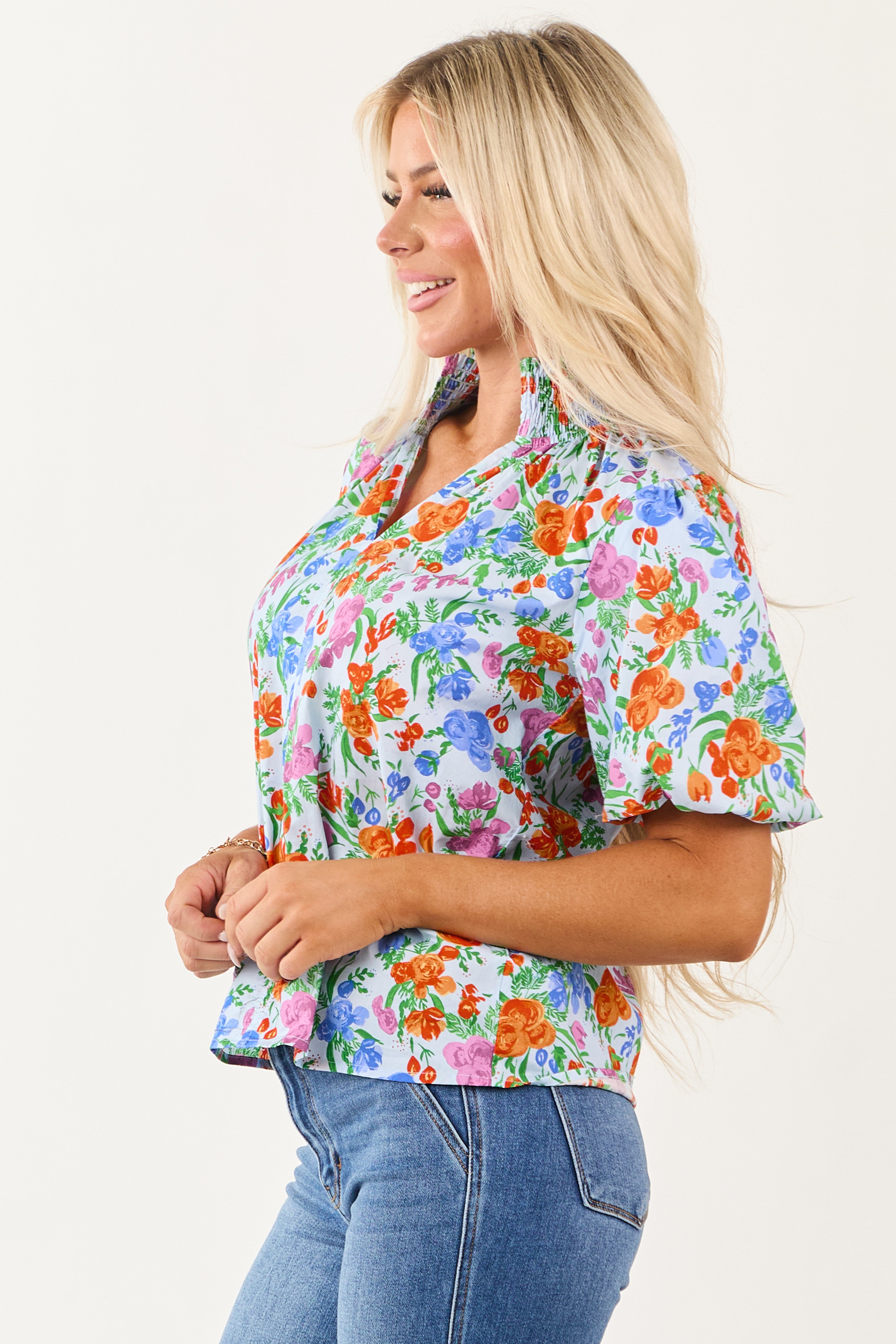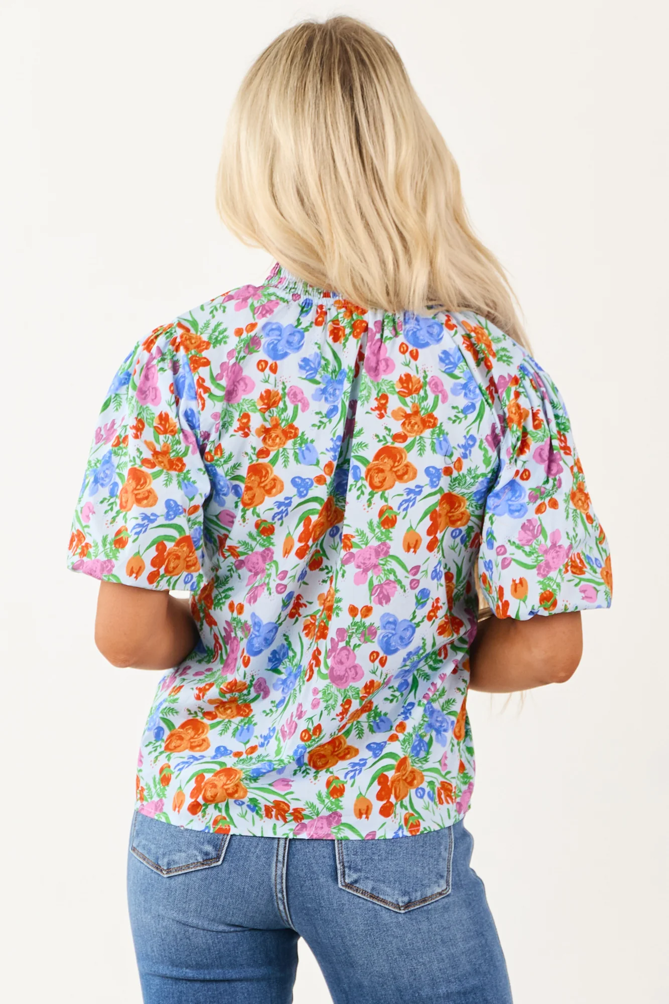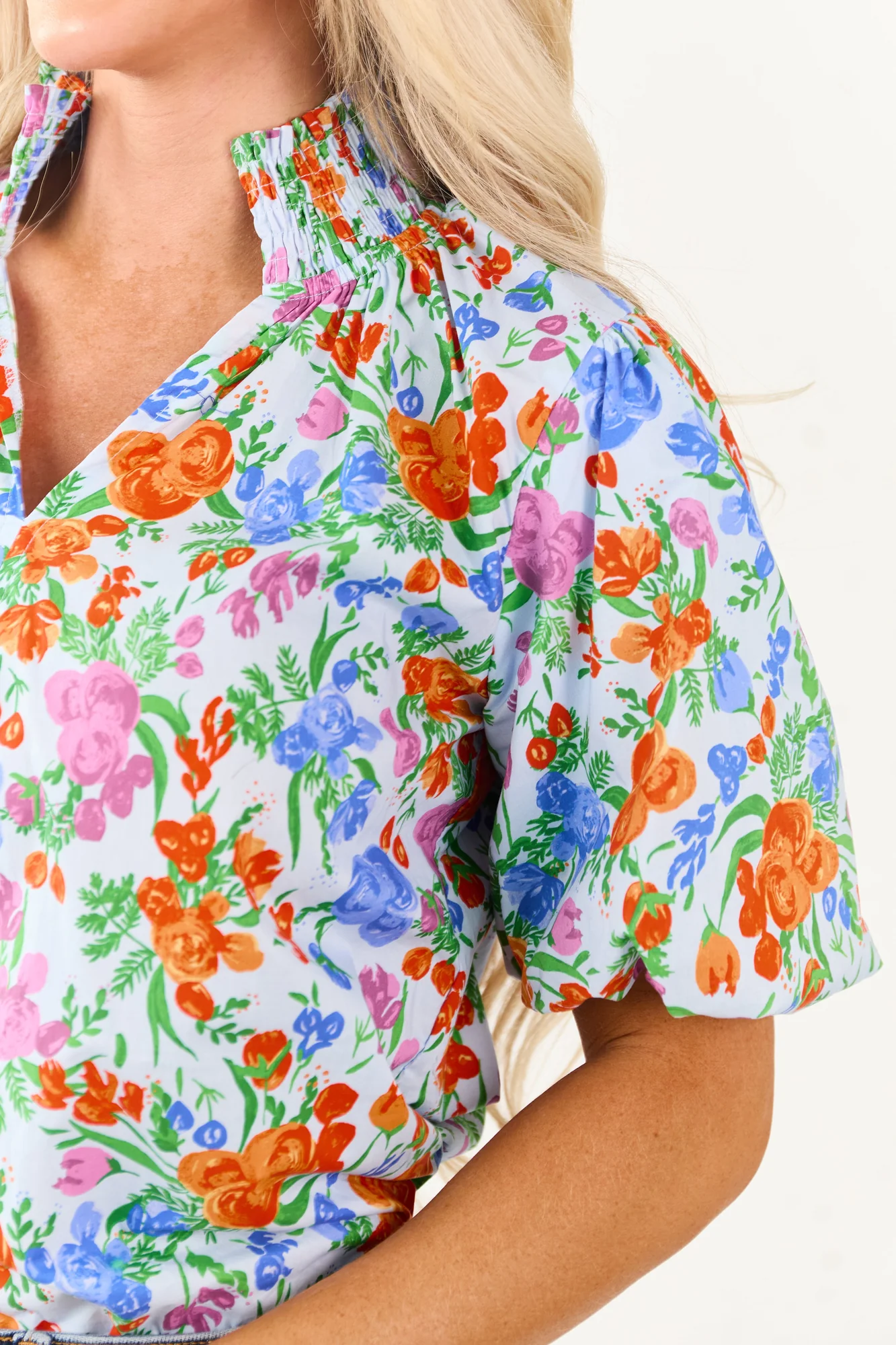 Elevate your style with this vibrant floral print top in shades of Powder Blue, Kelly Green, Royal Blue, and more. The relaxed fit, smocked collar, and elastic cuffs ensure comfort and style. Made from 100% lightweight cotton with a non-stretchy feel. Perfect for a casual day out or a summer evening. Note: Each piece is unique due to the print variations. Model is wearing a size Small.