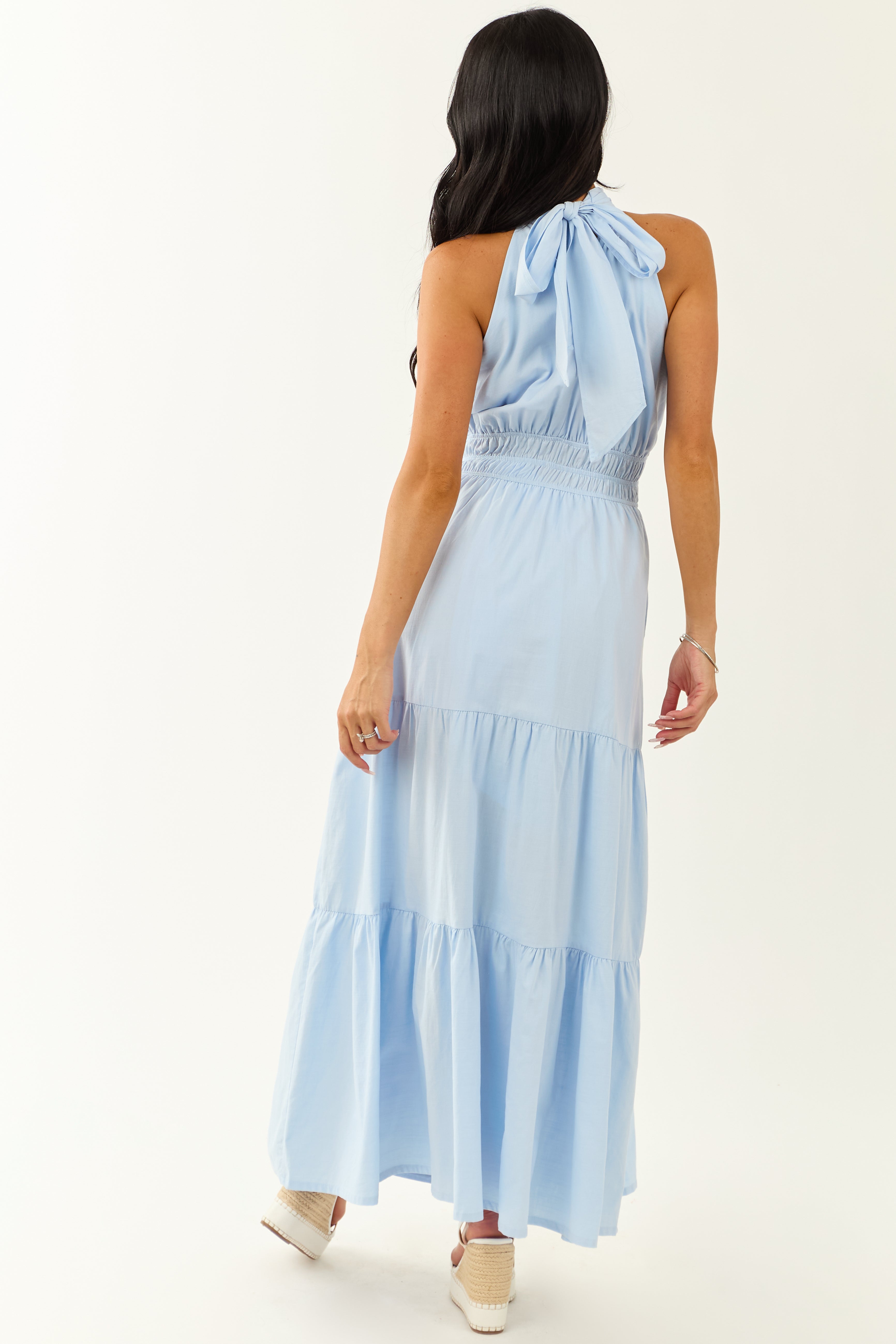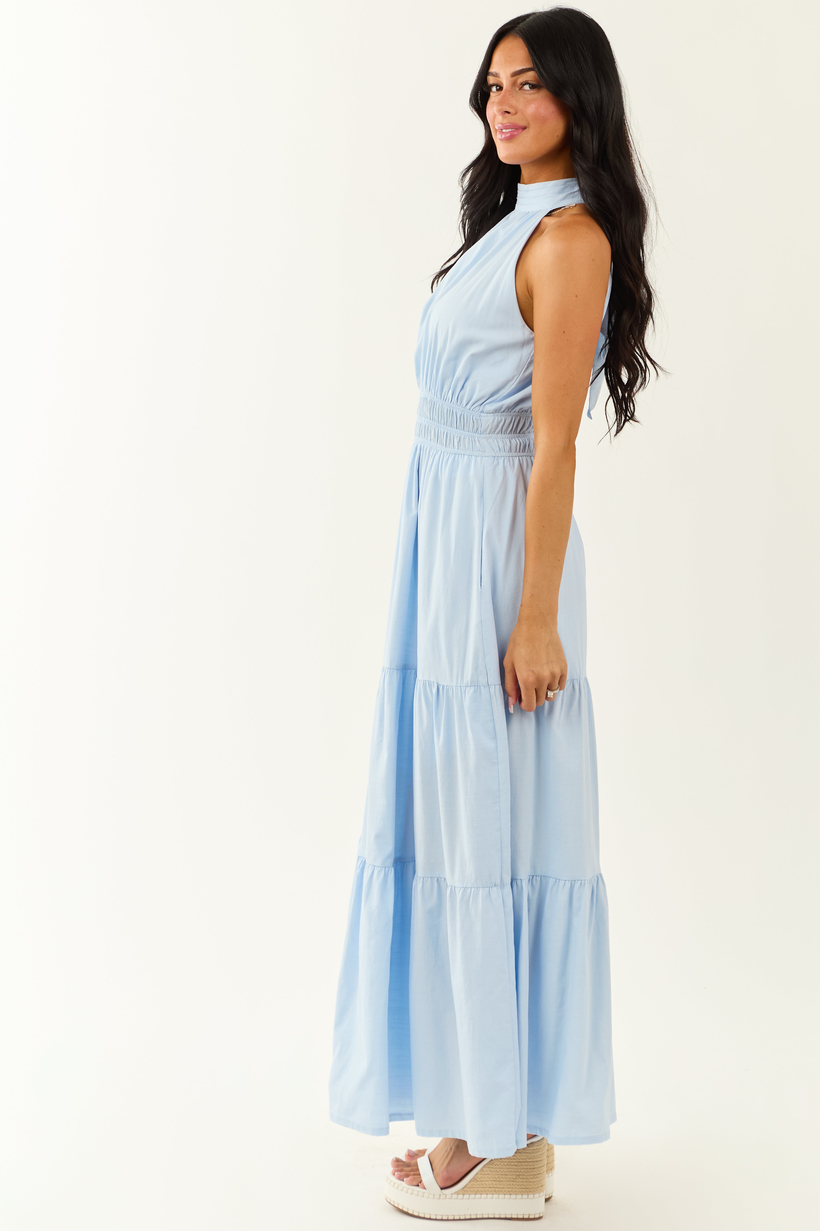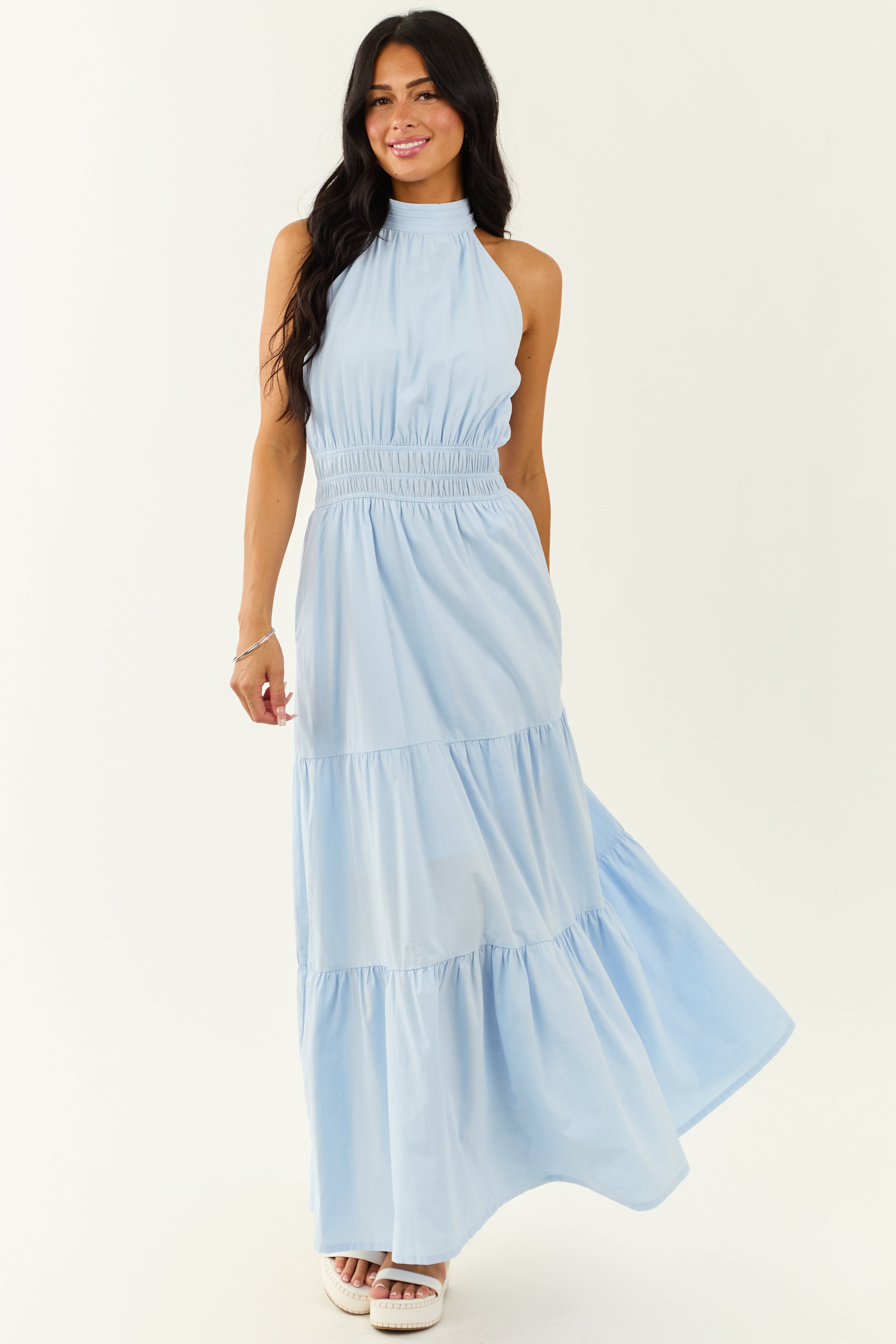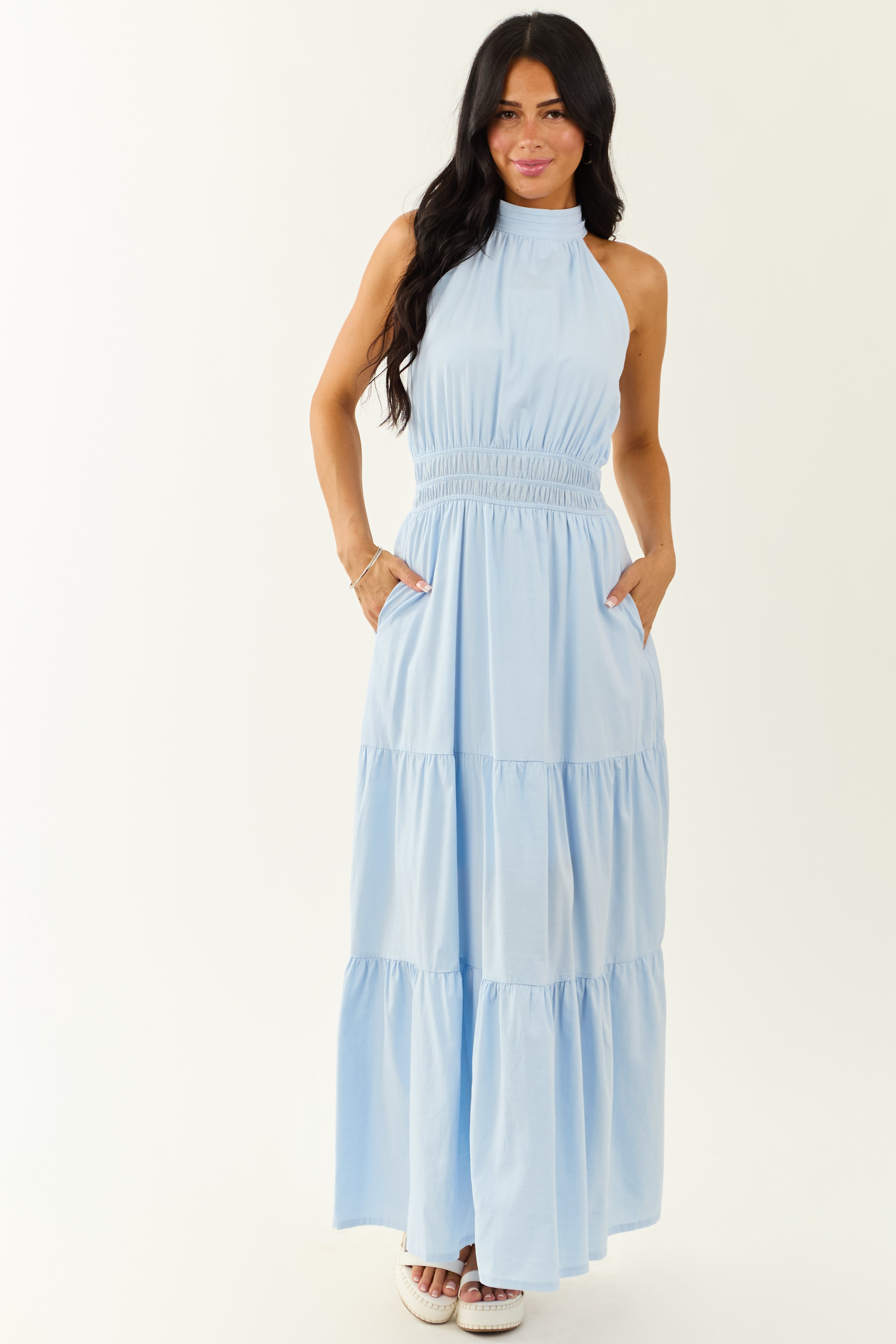 Dress to impress with our Powder Blue Halter Maxi Dress for women in sizes S, M, and L. Made of a breathable cotton blend, this dress features a mock neck halter, fitted waist, loose blouson bodice, and a tiered skirt with hidden side pockets. Perfect for summer, this stunning dress is adorned with a halter neckline and a keyhole back cutout, exuding grace in every step you take. Feel confident and stylish in this non-stretchy cotton blend dress with a stretchy smocked waist and a lining made of 100% polyester. Model is 59″ tall, wearing a size Small.