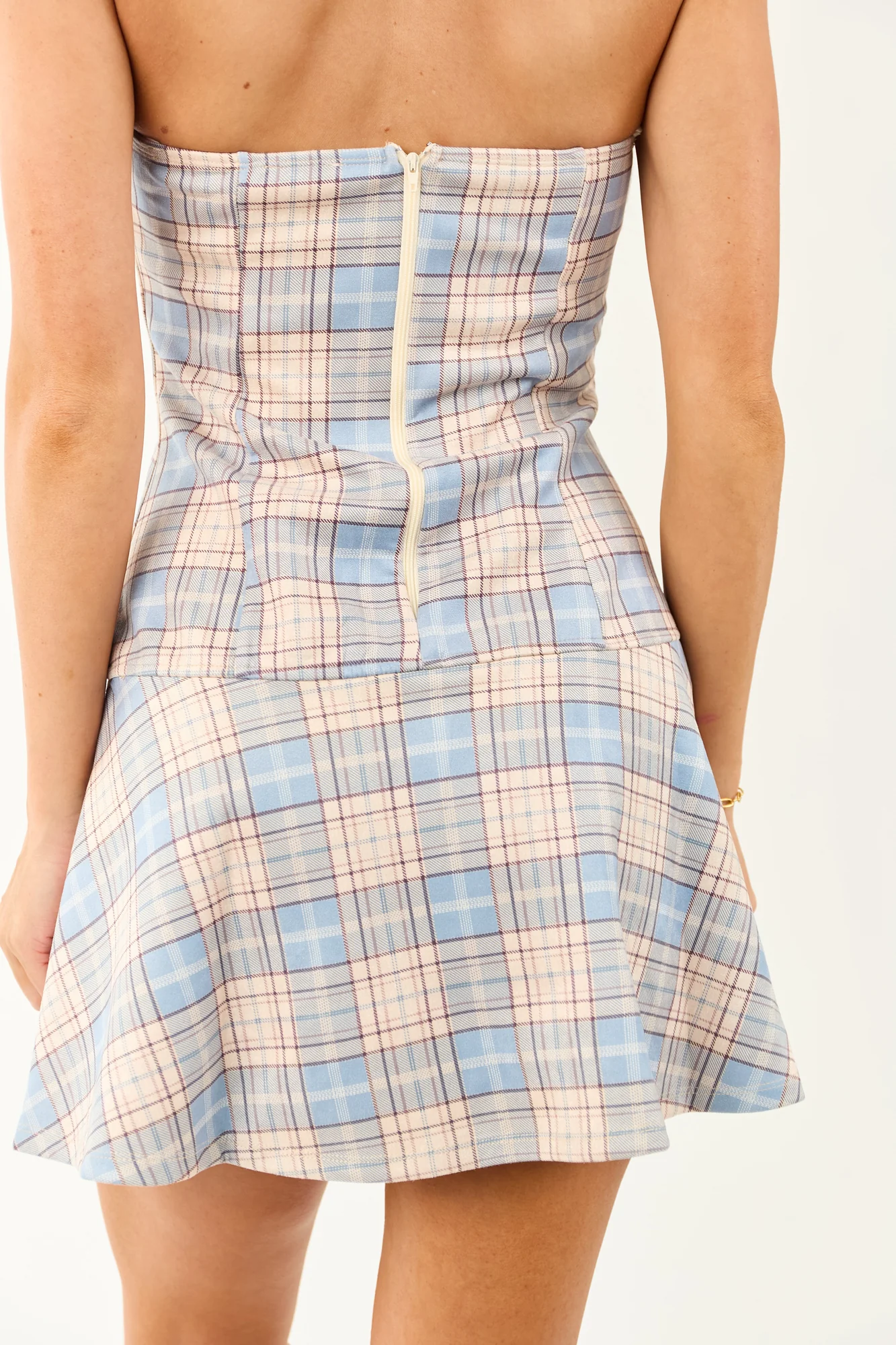 Indulge in comfort and style with this powder blue plaid strapless mini dress . Crafted from buttery soft, stretchy knit fabric, featuring shades of powder blue, chocolate, and more. Perfect for summer outings with an elastic neckline and a back zipper for added convenience. Available in sizes XS to XL. Please note that print variations may occur due to cutting and sewing processes. Model is wearing size Small.