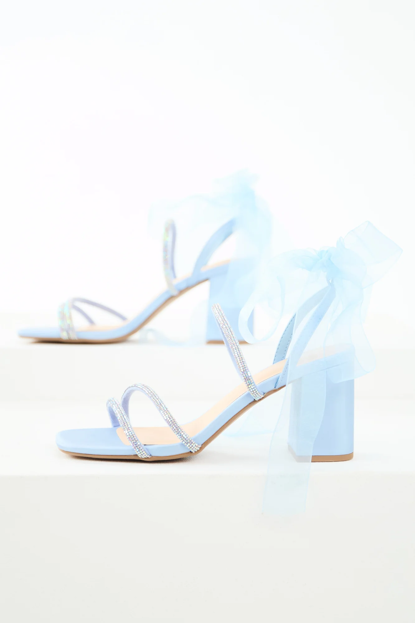 Dazzle in style with these powder blue block heel sandals featuring multi-colored rhinestones. Designed with a square open toe, ankle buckle strap, and ribbon ankle tie for a chic look. The chunky heel provides comfort, while the slightly cushioned insole ensures all-day wear. Heel height: 3.5 inches. Shaft height: 3.5 inches. Adjustable circumference. Imported.