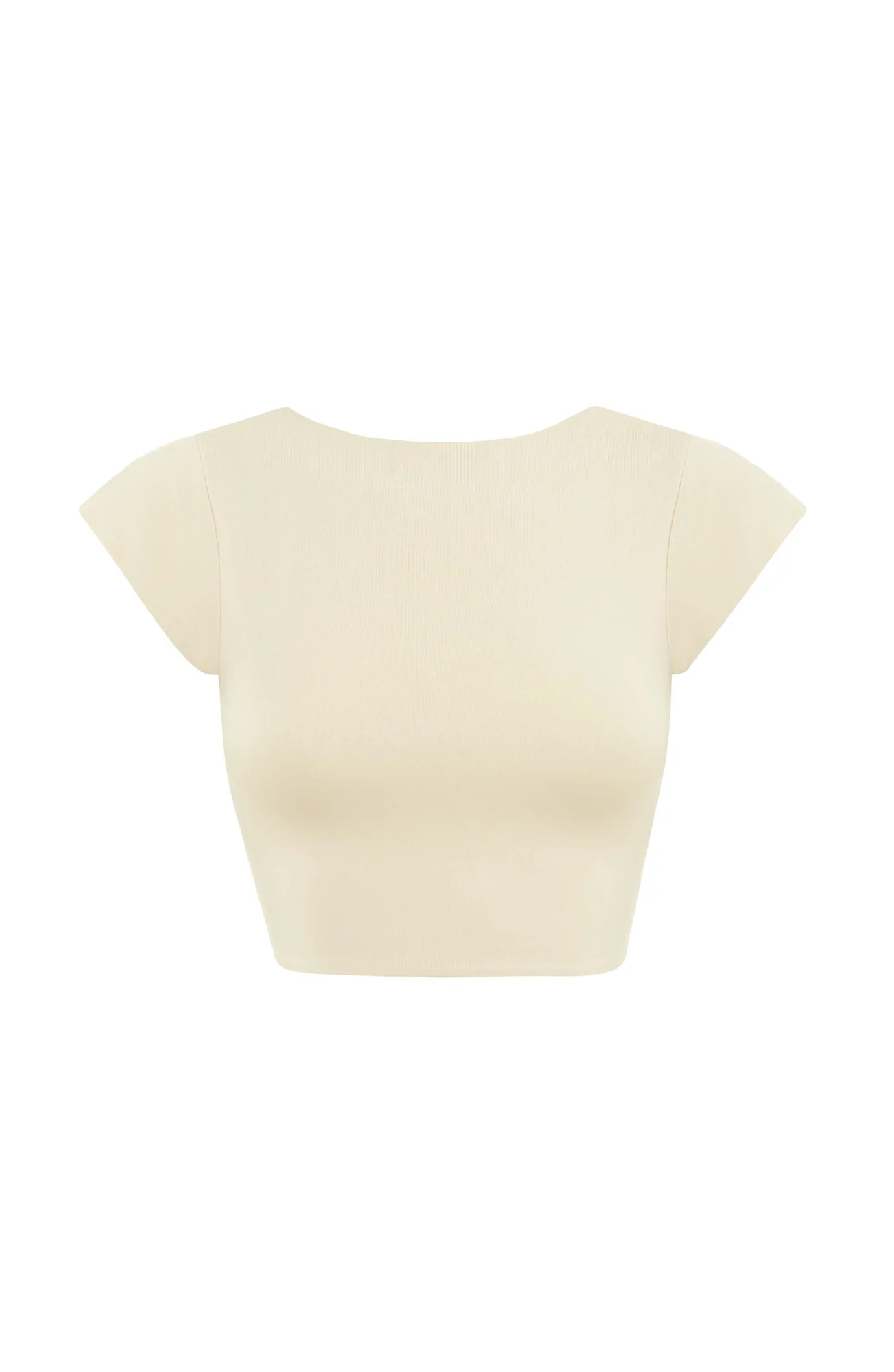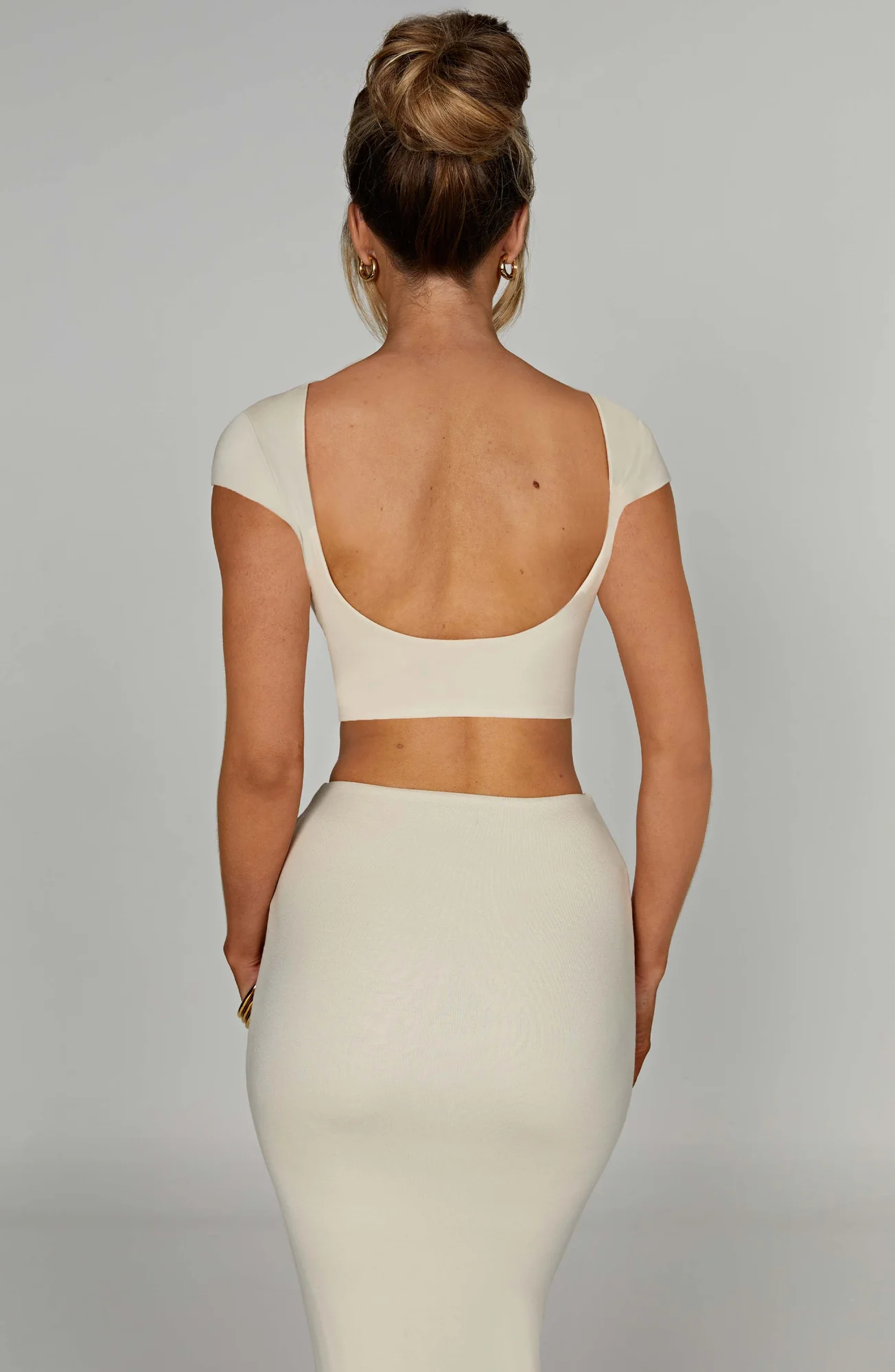 Indulge in luxury with our double-lined cream modal crop top featuring a buttery soft, second skin feel. The Anika style contours to your body, with stretch and shape retention that molds and moves with you flawlessly. This high-neck design boasts flattering cap sleeves and a chic low scoop back for a sophisticated touch. Elevate your outfit by pairing it with our Yasmin maxi for the ultimate dreamy look. Experience the comfort of this premium modal fabric thats soft, stretchy, and oh-so-stylish. Make a fashion statement effortlessly! Model is wearing size XS. Available in XS to XXL sizes.