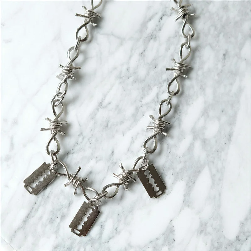 Make a bold statement with our Punk Rock Razor Blades Statement Chain Necklace. Embrace ultimate punk rock vibes with a thorny barbed wire link chain adorned with killer razor blade-style embellishments. This unique necklace features a chain length of 19.9 inches (50.5 cm) and is crafted from durable stainless steel alloy for long-lasting wear and edgy style.
