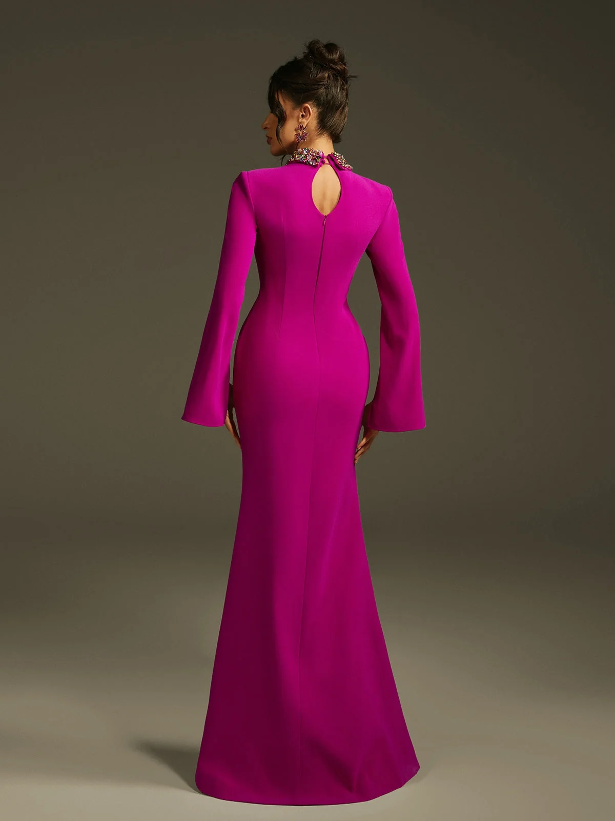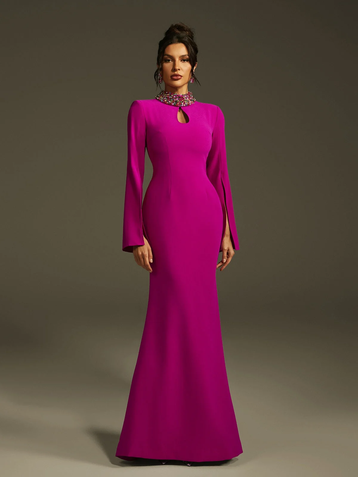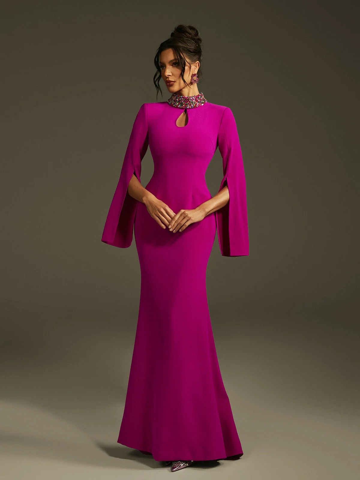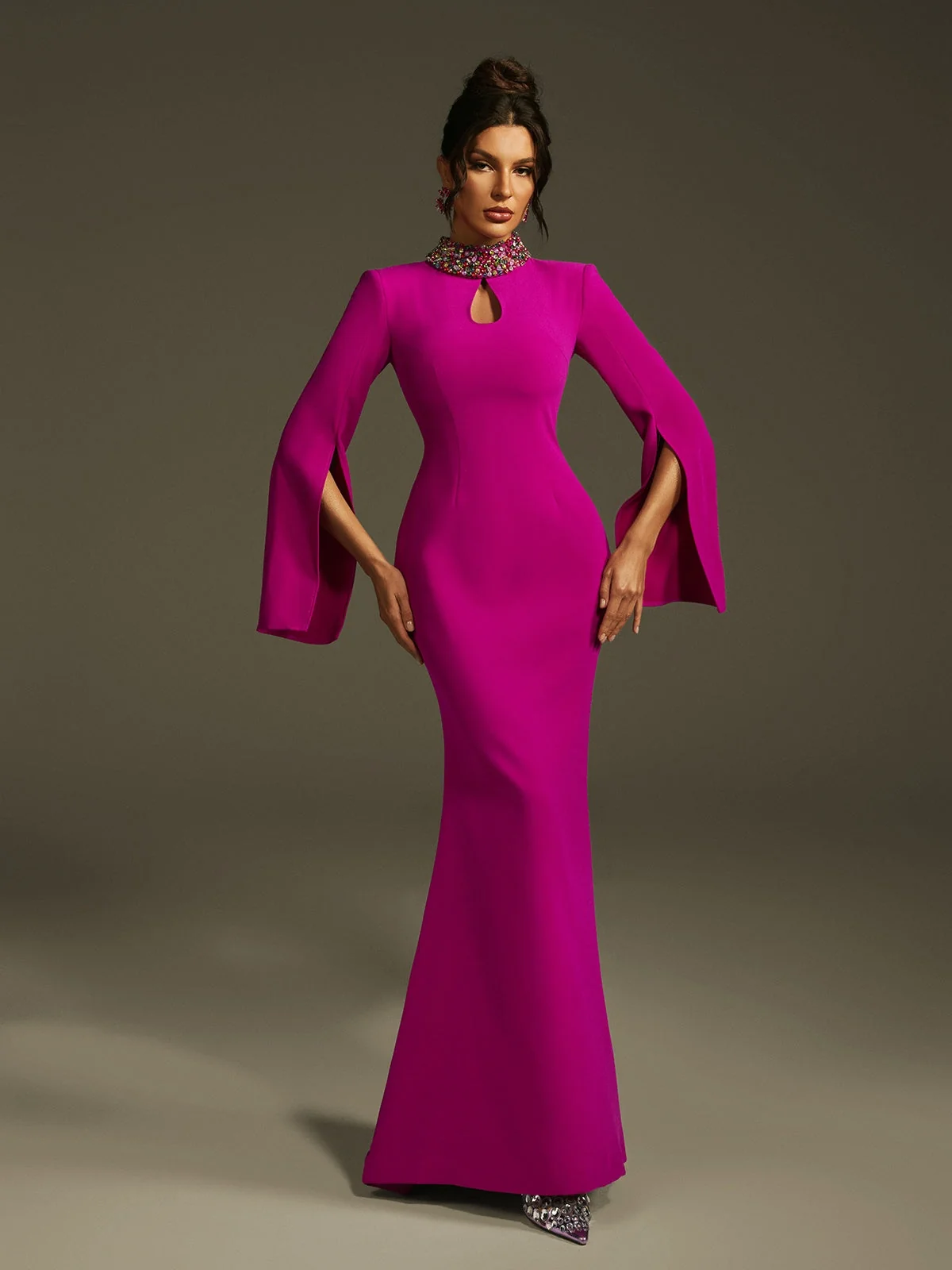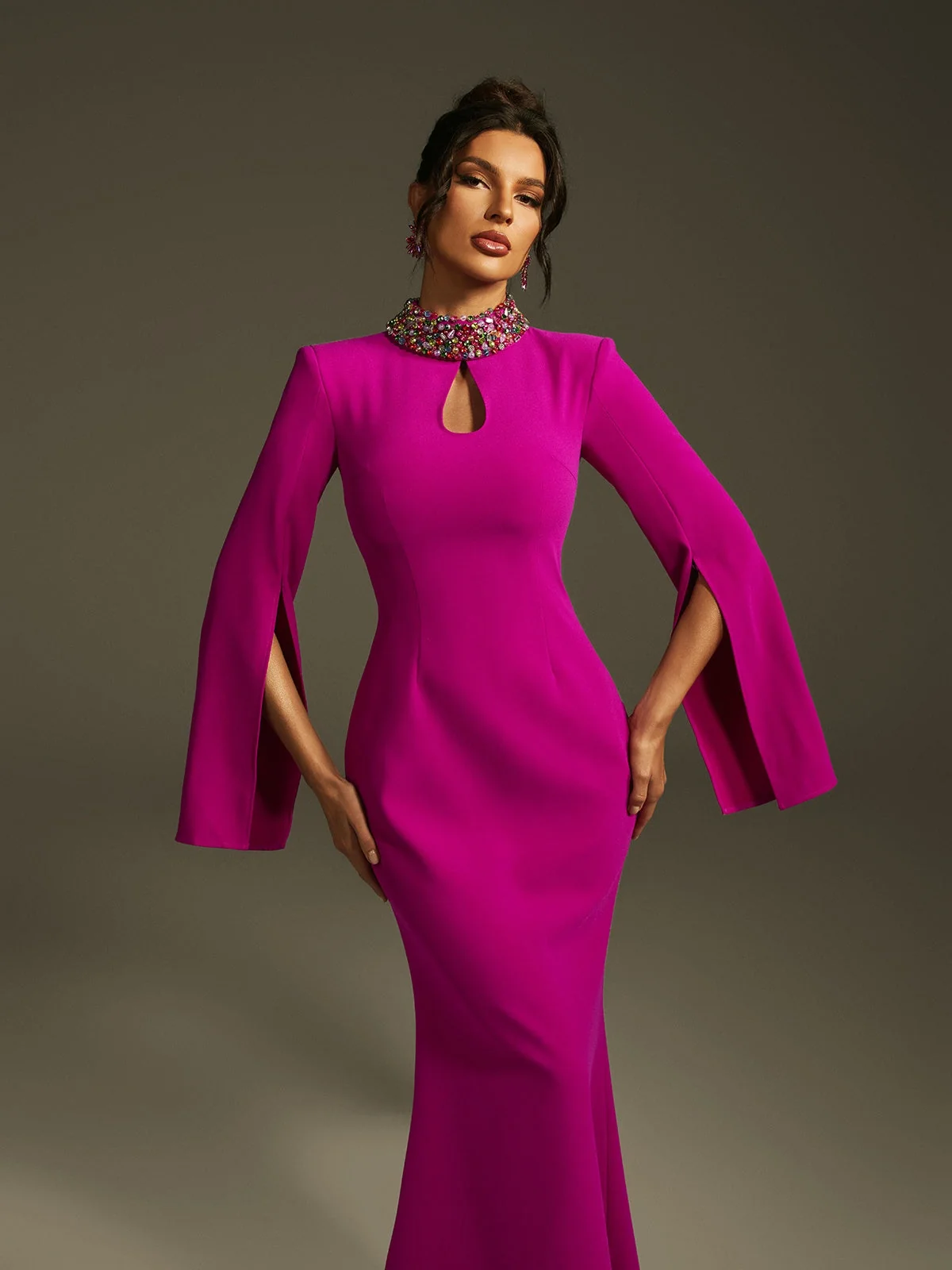 Make a striking impression with the Laksha Purple Cape Sleeve Maxi Dress. This elegant dress features stylish cutouts, flowy maxi length for a flattering silhouette, and a perfect blend of sophistication and contemporary flair. Crafted from 100% Polyester with a slight stretch, this statement piece exudes bold elegance. Dry clean only. Color may vary in different lighting. Available in sizes S, M, L, XL, XXL.