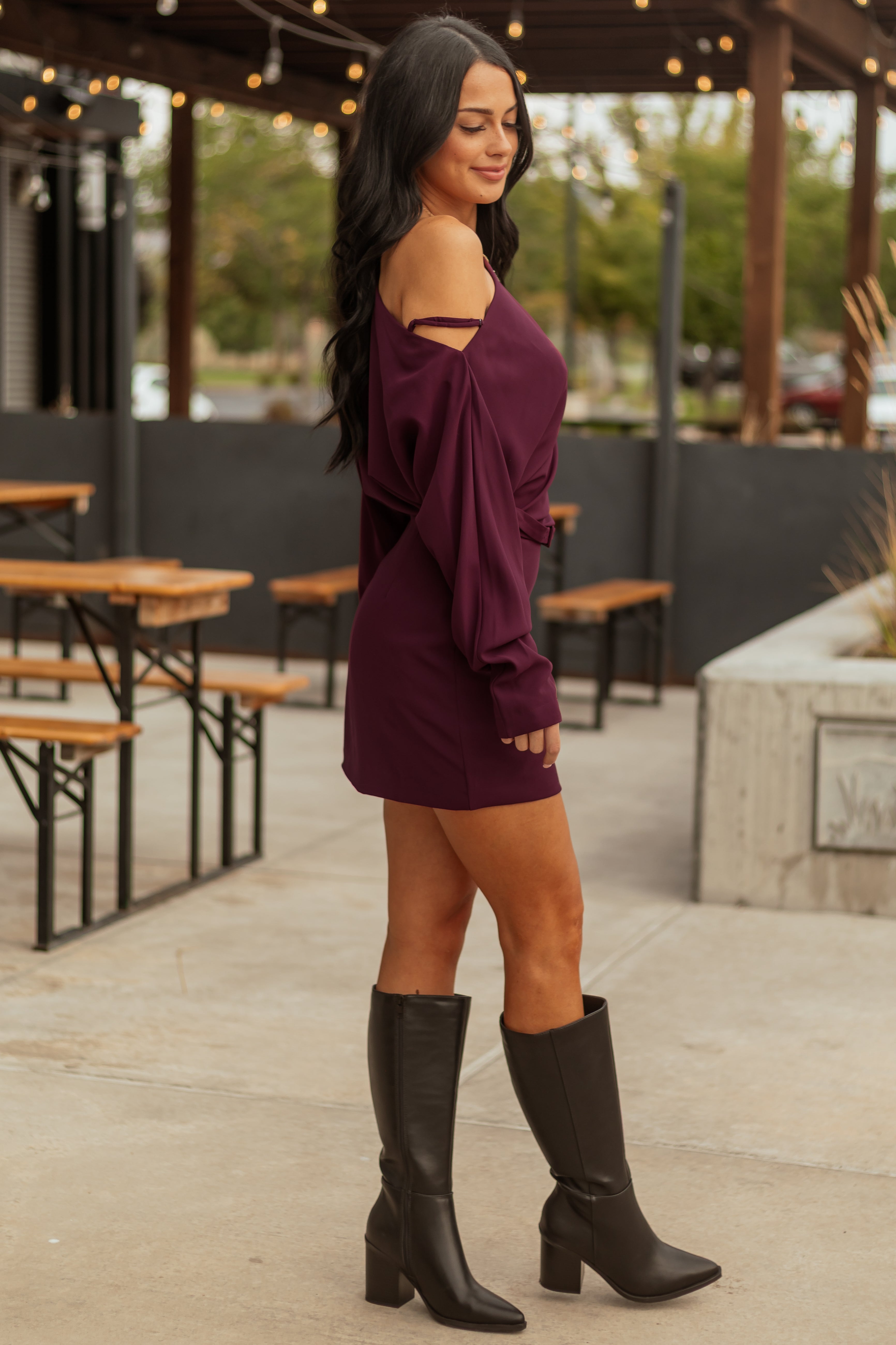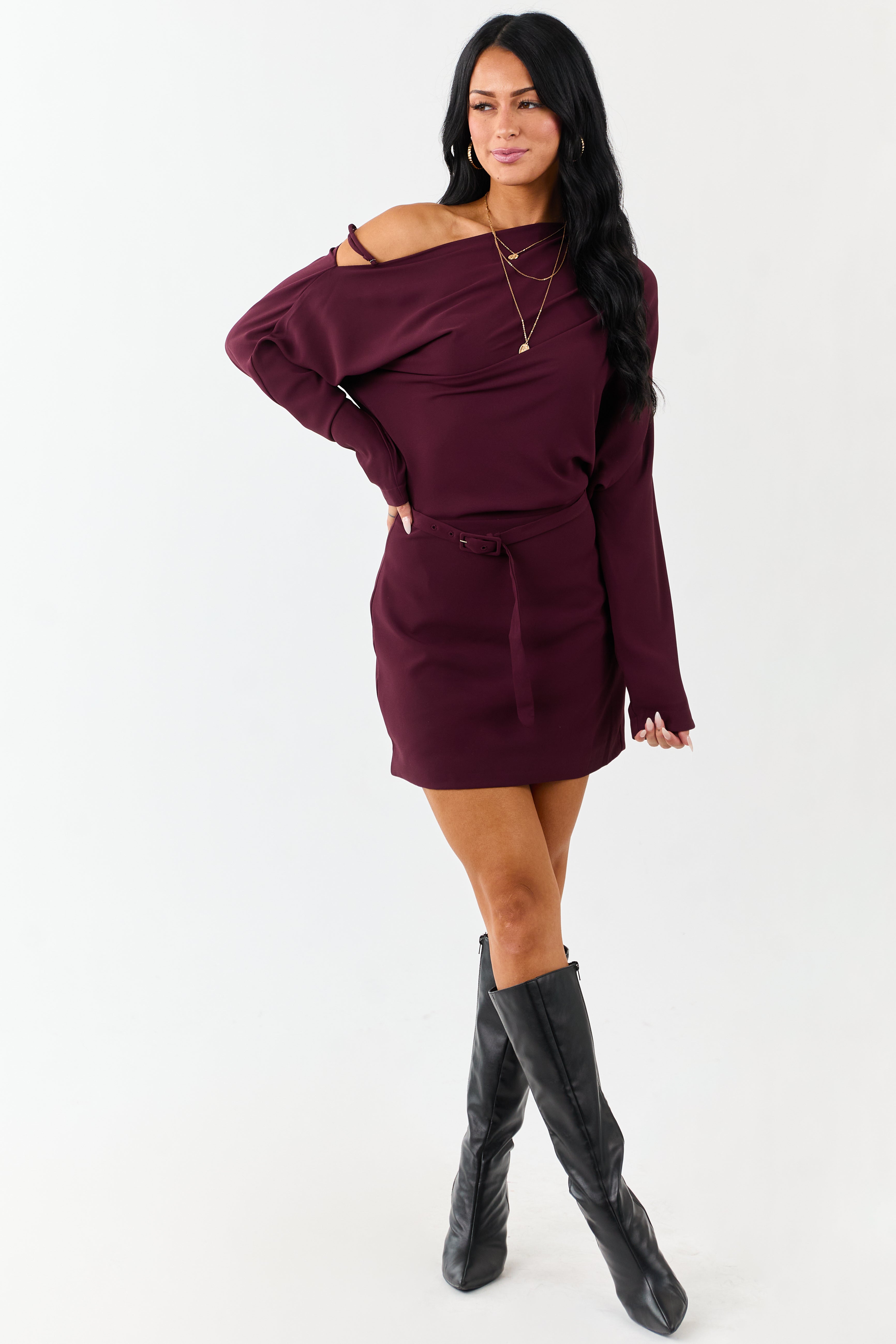 This trendy purple one-shoulder mini dress exudes chic asymmetry with its draped dolman sleeves and loose blouson bodice that flatters every curve. Stay stylish and comfortable with this true-to-size garment, featuring a one-shoulder design, adjustable strap, ruched shoulder, dolman sleeves, hidden side zipper, and a lined skirt made of 100% polyester. Perfect for fall and winter seasons. Optional belt included. Imported. Model is wearing size Small. Size chart: XS – XL. Show off your fashionable side with this versatile piece! Offered .