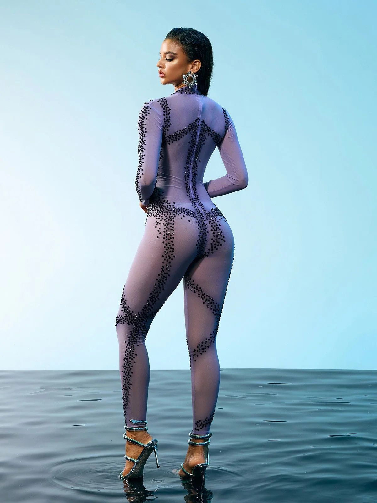 Elevate your style with the Purple Rhinestone Embellished Jumpsuit. This eye-catching piece features intricate rhinestone detailing and a bold print that ensures you stand out from the crowd. Made from high-quality 100% Polyester for both style and comfort. The invisible zipper at the back adds convenience, and the slight stretch offers a flattering fit. Dry clean only. Please note that colors may vary due to lighting. Model showcased wearing size S.