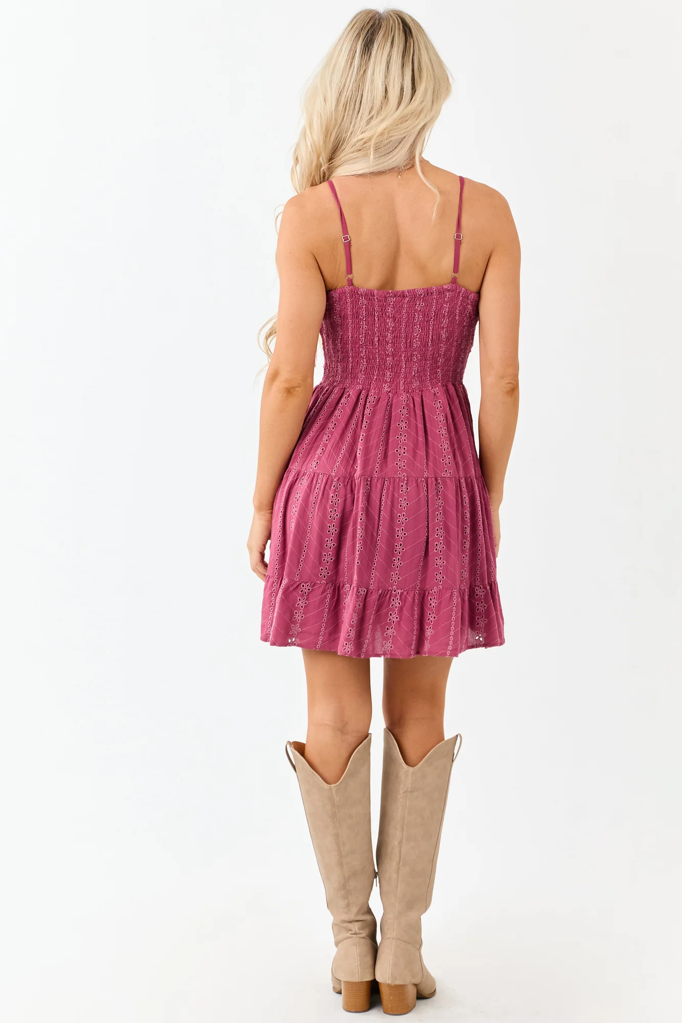 Indulge in the charming appeal of this purple eyelet mini dress detailed with a twist bust, front cut-out, and adjustable spaghetti straps for a playful and flattering silhouette. Crafted from 100% Rayon with a stretchy smocked back, this dress is both stylish and comfortable. The lined bust and skirt along with the garment specs ensure a perfect fit for sizes XS to XL. Ideal for casual outings, parties, or special events, this imported dress exudes elegance and style.