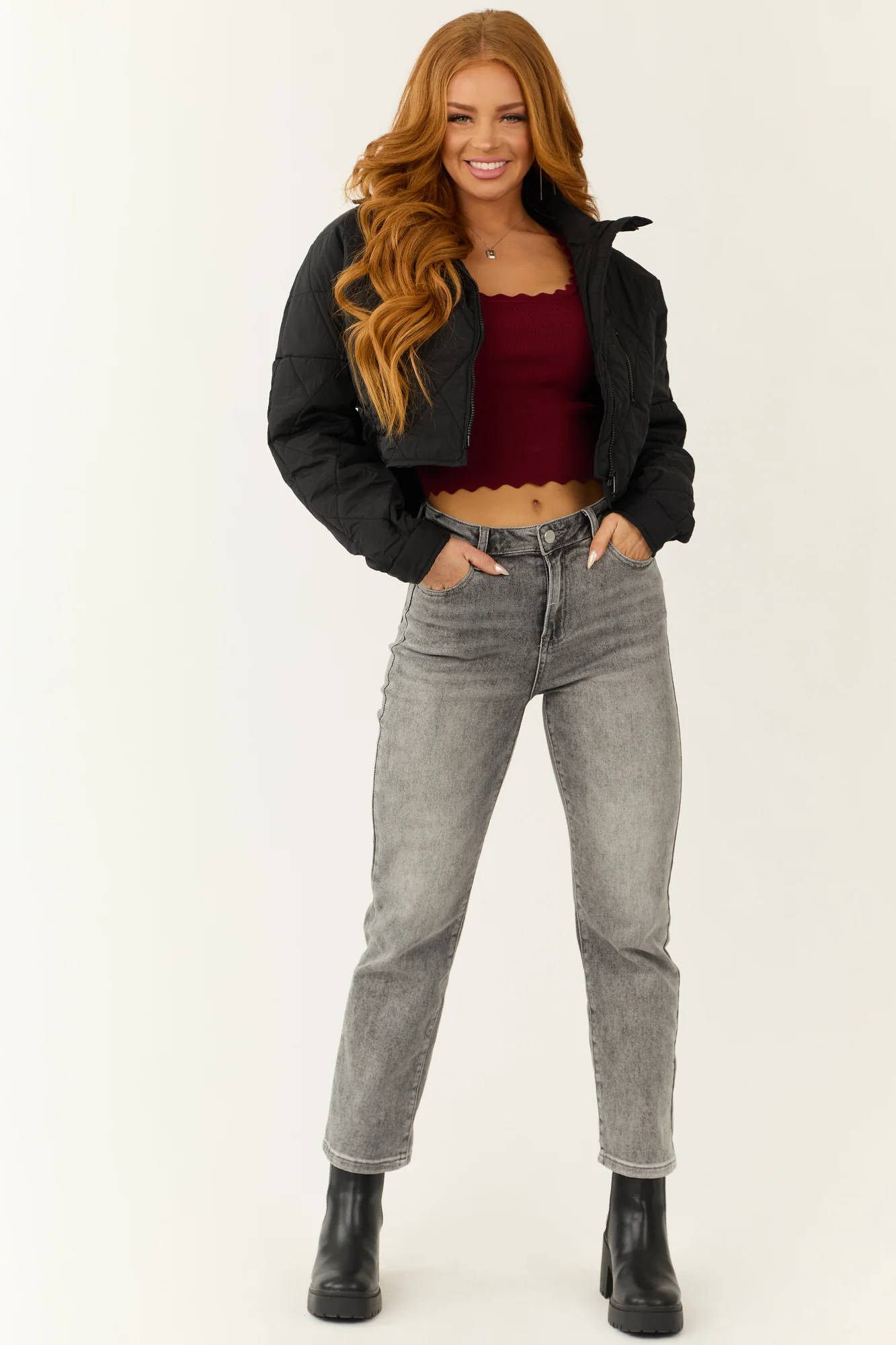 Stay warm and stylish with our Black Quilted Puffer Cropped Winter Jacket. Made of 100% Polyester, this jacket features a unique high low hem, button banded cuffs, and a cozy collar. With a non-stretchy woven fabric, zipper chest pocket, and fully lined interior, this jacket is perfect for chilly days. Available in sizes S, M, and L. Care instructions: Hand wash cold, hang dry. Model is wearing a size Small. Models measurements: Height 55″, Bust 33″, Waist 24″.