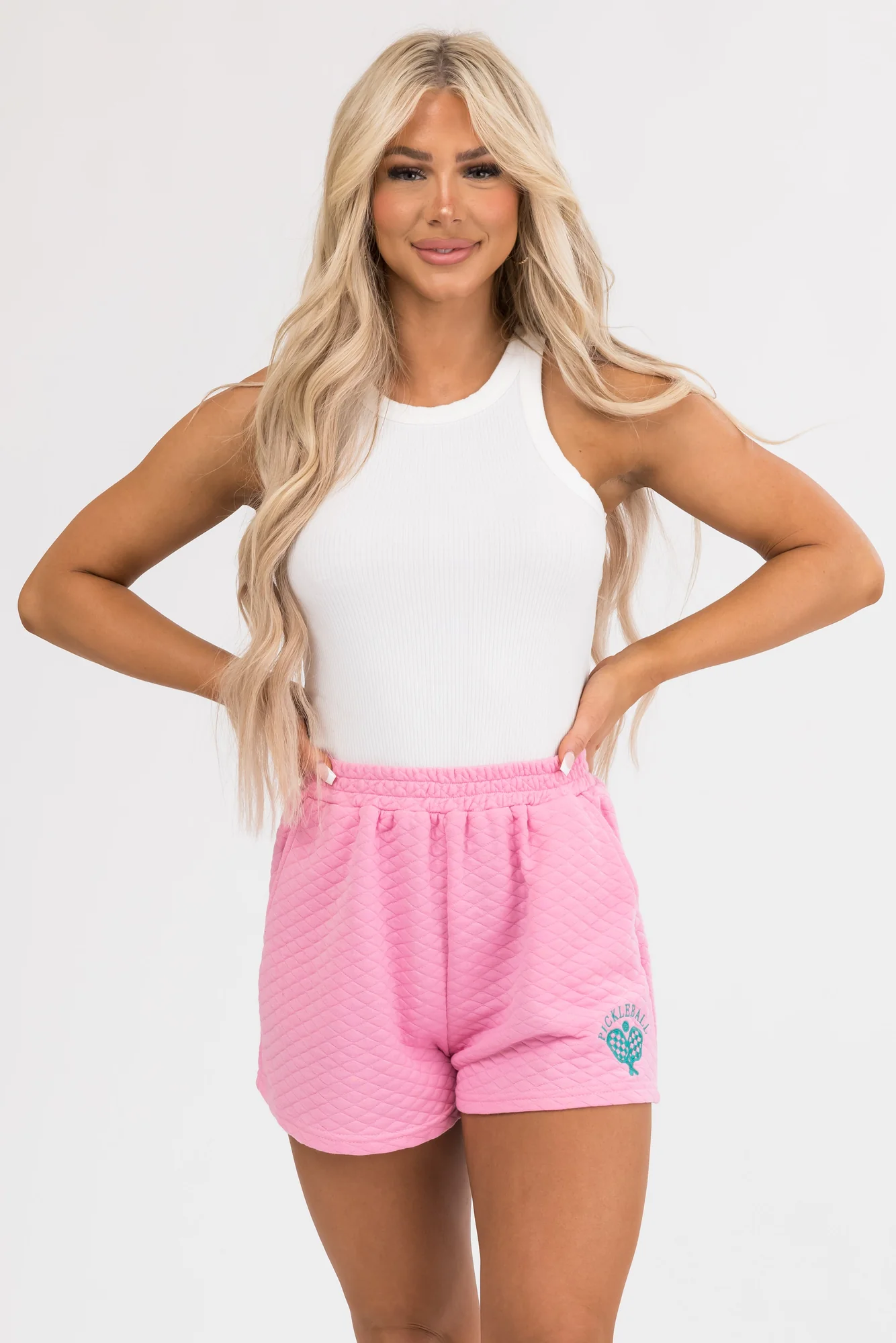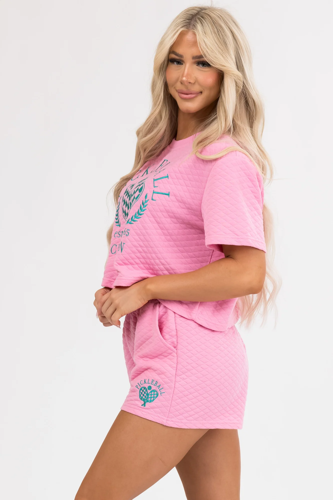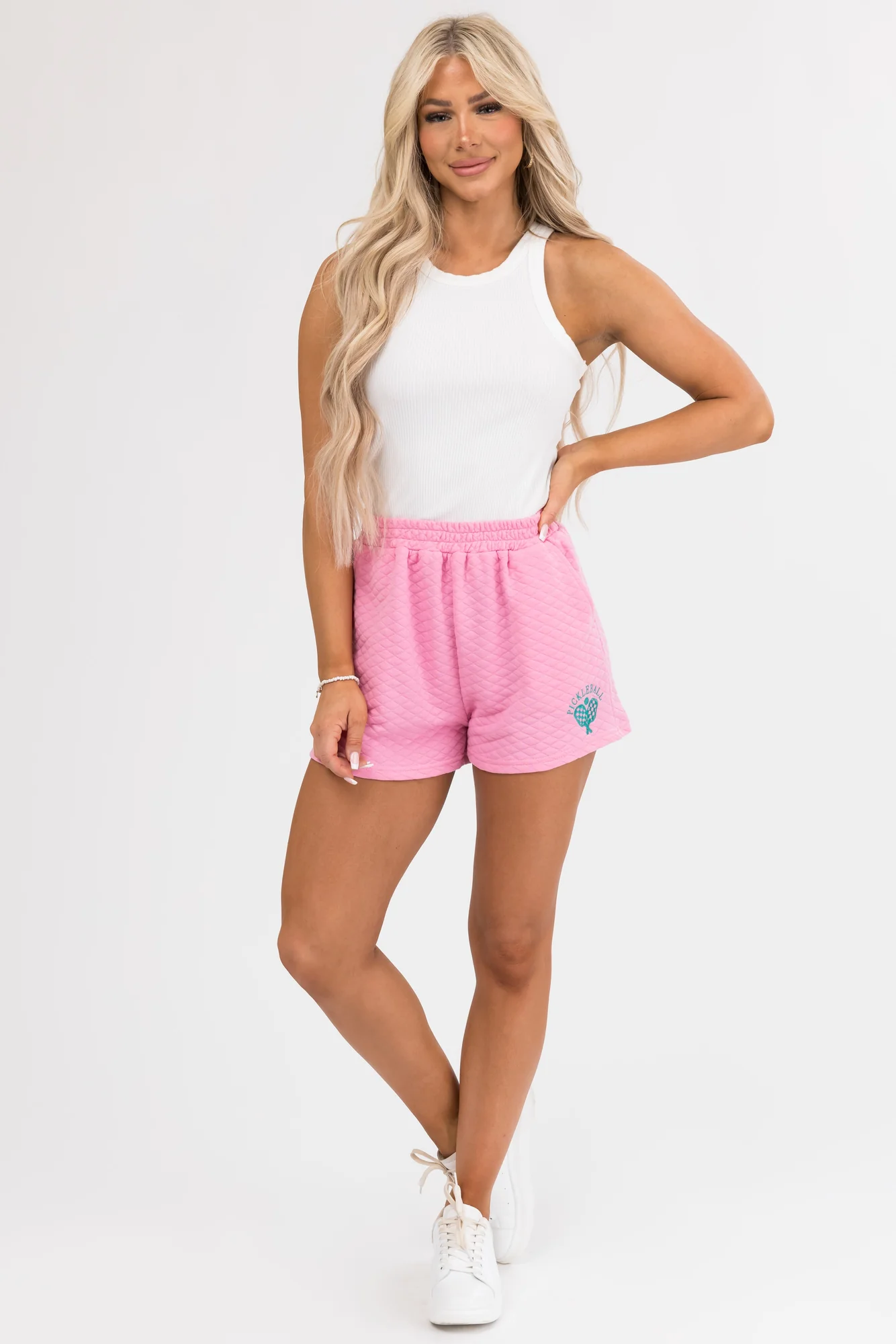 Discover ultimate comfort and style with our Quilted Juniper Graphic Elastic Waist Shorts. Made from semi-stretchy quilted knit, these shorts feature an elastic waistband for a casual fit and extra room. The shorts come with pockets and an exclusive graphic design in the shade of juniper. Ideal for everyday wear, these shorts are versatile and fashionable. Take care of your garment by hand washing cold, laying flat to dry, and cool ironing if needed. Available in sizes Small, Medium, and Large.