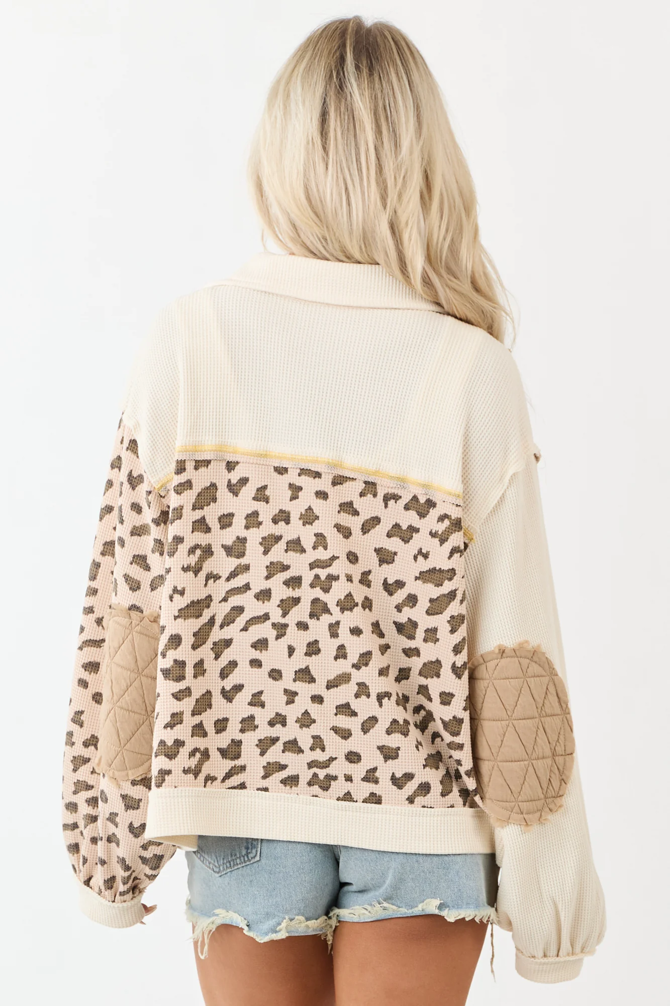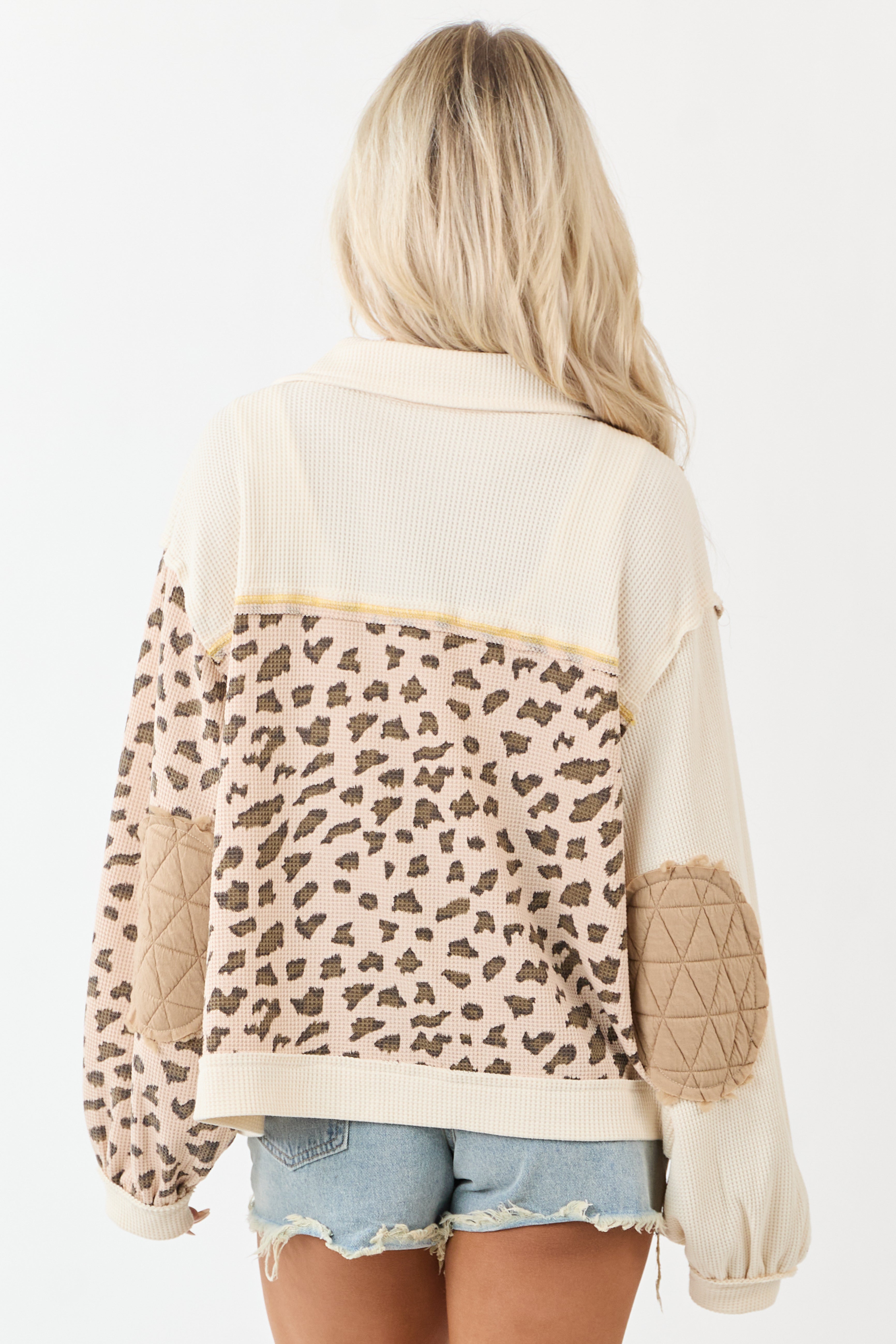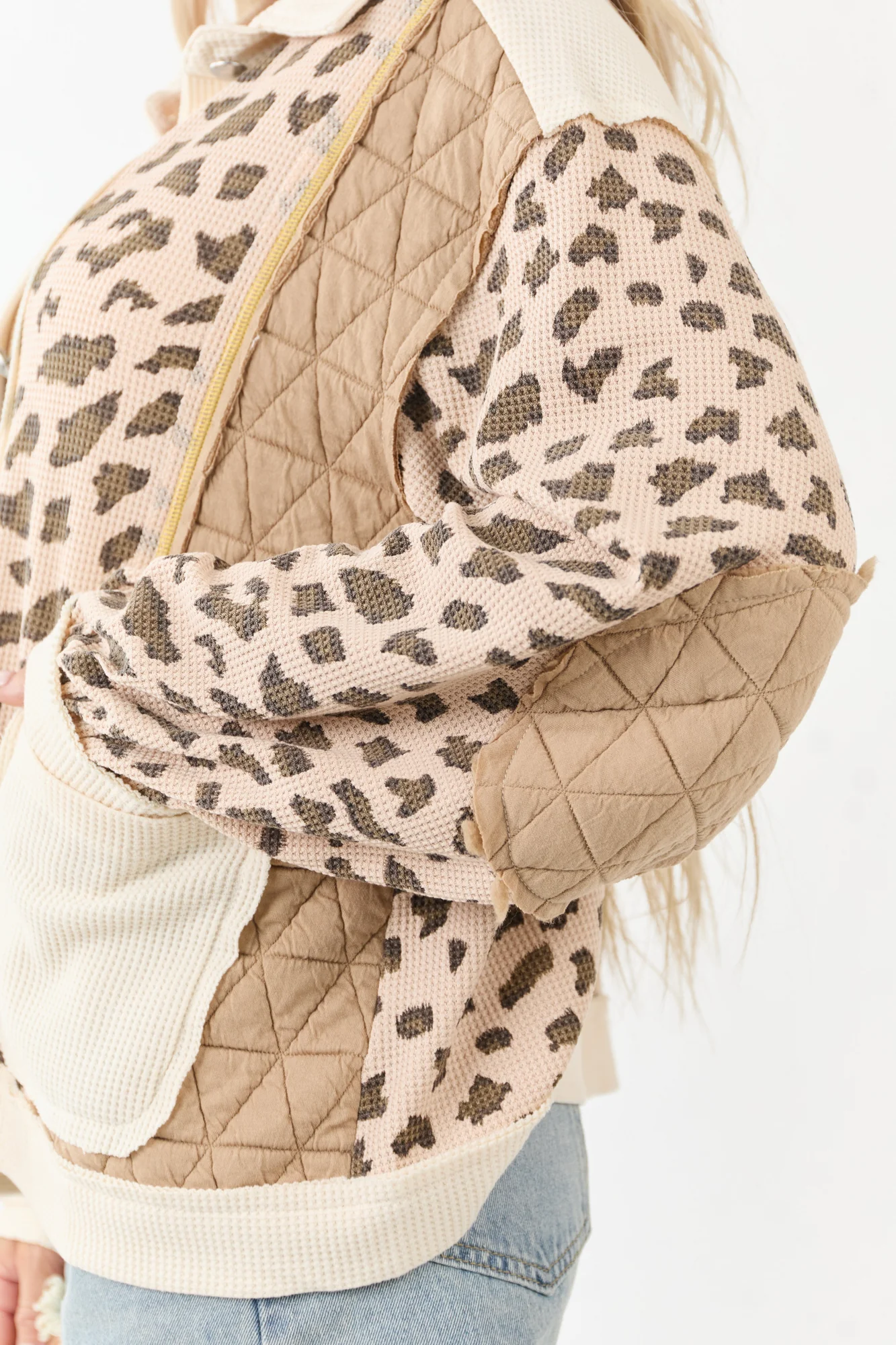 Unleash your wild side with our charming Quilted Patchwork Leopard Print Jacket in lovely Latte and Cream shades. This statement piece blends leopard print accents with cozy knit paneling for a unique textured look. The oversized fit, front pockets, elbow patches, and raw seams add a touch of playfulness to your style. The semi-stretchy knit ensures comfort while keeping you on-trend in shades like Light Rose Taupe, Cocoa, Coffee, and Canary Yellow stitching. Embrace individuality with this 100% Polyester imported piece. Model measurements: Size 3, Height 57″, Bust 35″, Waist 26″