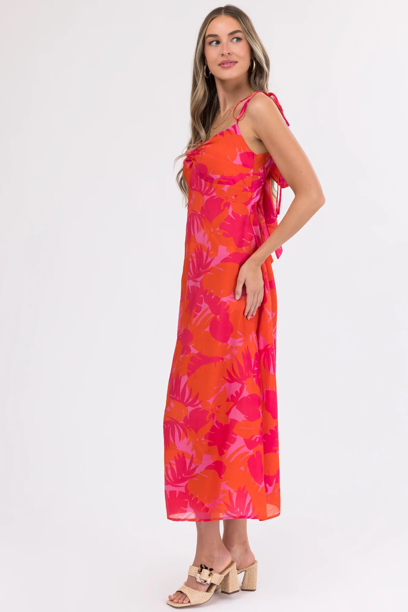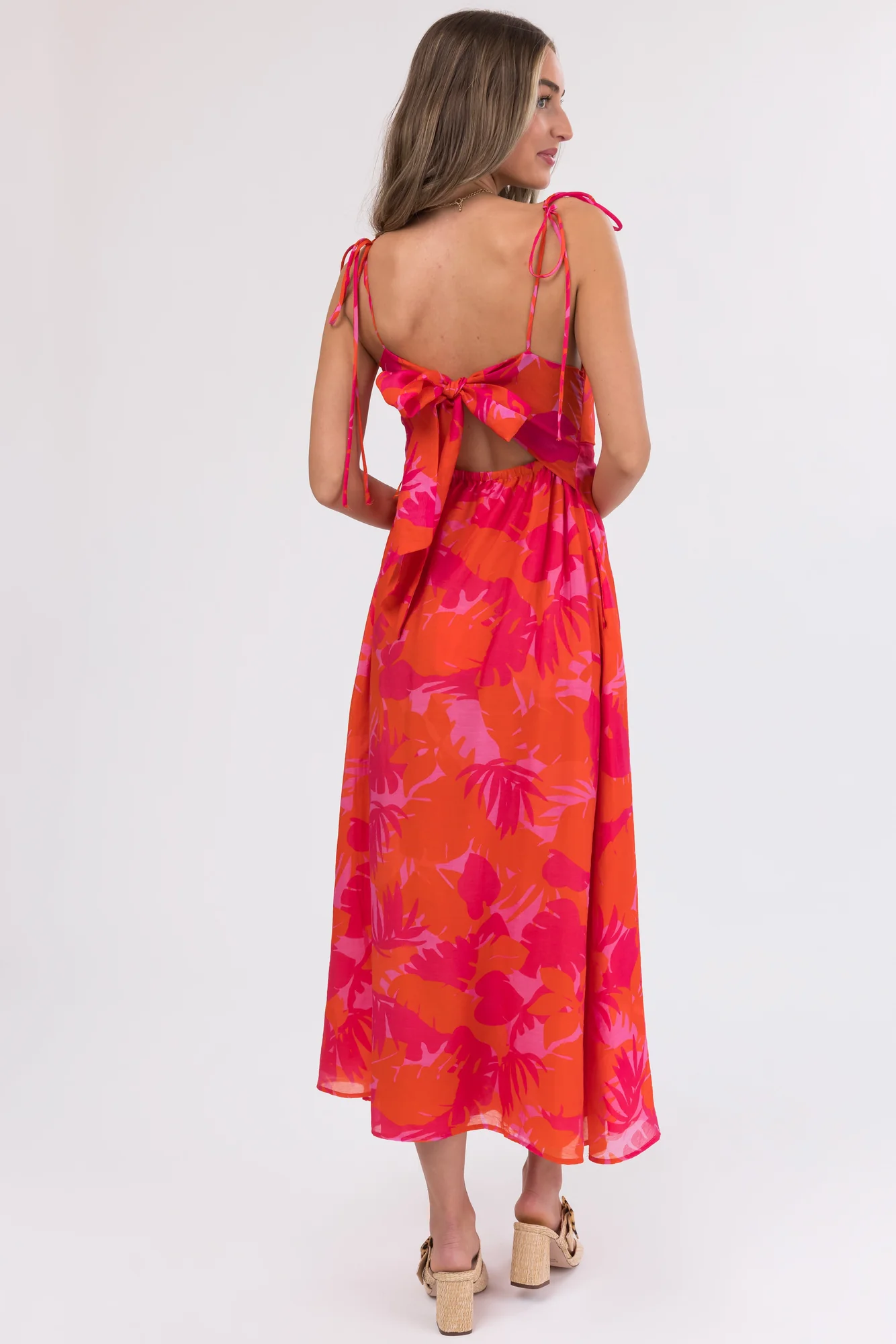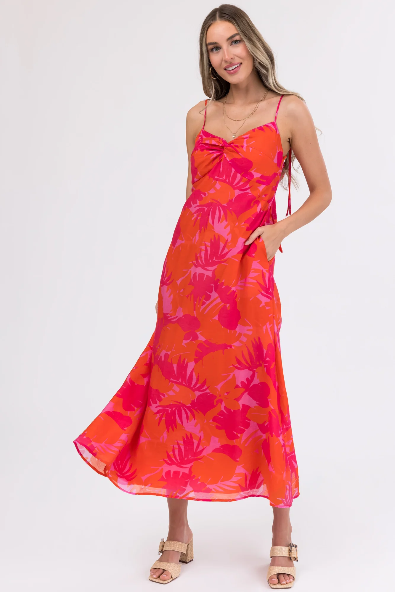 Achieve a stunning look with our Raspberry Leaf Print Maxi Dress featuring adjustable tie straps, back cut out with tie, and elastic waistband. This dress in shades of Raspberry, Baby Pink, Fire, and Dark Salmon boasts a loose fit, non-stretchy woven fabric, side pockets, and a front twist sweetheart neckline. Stay comfortable and stylish in this 82% Tencel, 18% Nylon dress lined with 95% Polyester, 5% Spandex. Perfect for various occasions. Available in sizes S, M, and L. Model is 58″ tall, wearing a size Small.