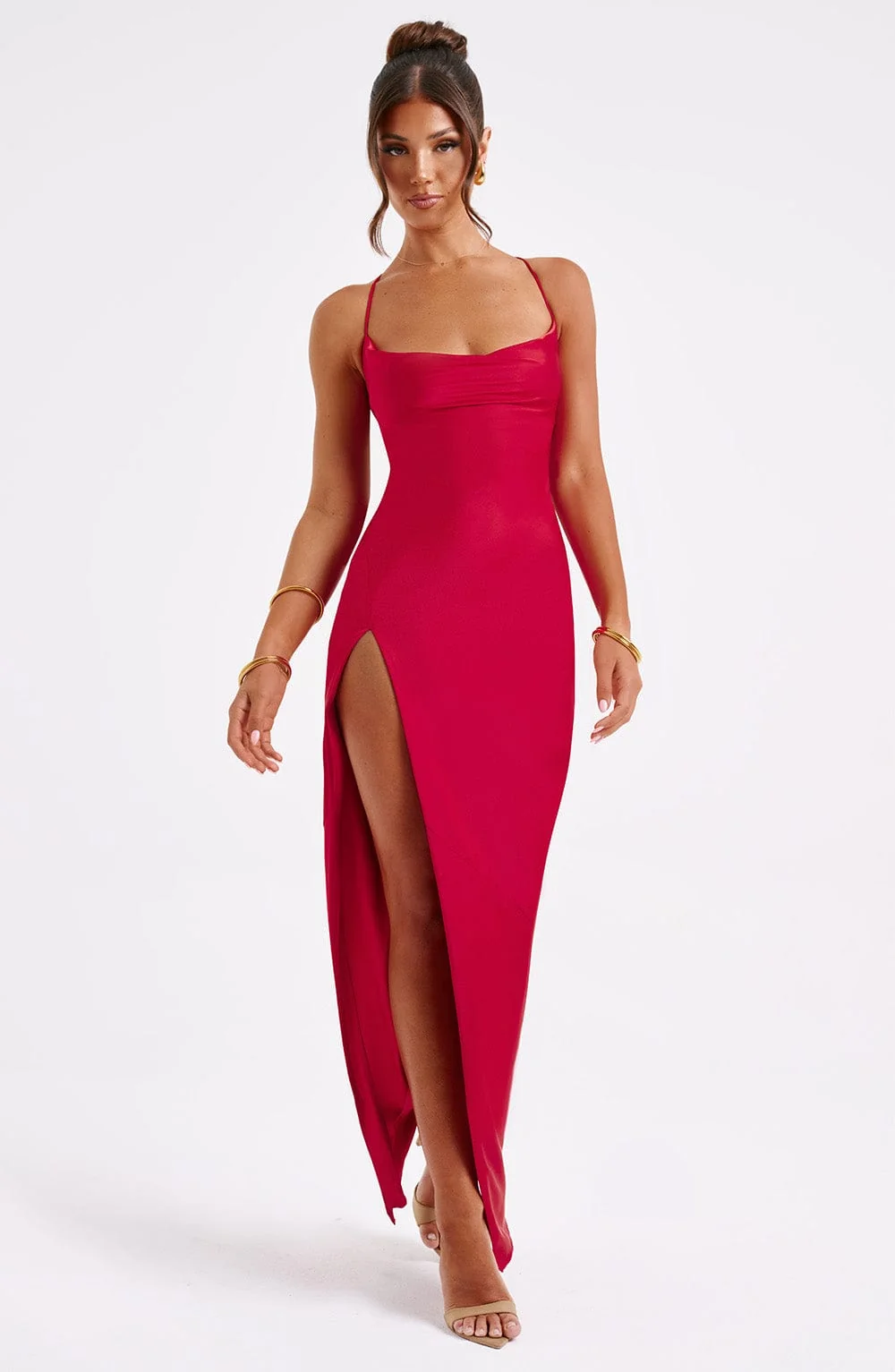 Indulge in luxury with our Red Bias Cut Satin Maxi Dress designed for nights of elegance and charm. Crafted from premium stretch satin, this dress features thin crisscross straps, a tantalizing thigh-high split, and a chic low back design. Enhance your curves in this graceful floor-length attire that exudes sophistication. Fully lined for comfort. Perfect for formal evenings, proms, weddings, and special events. Elevate your style effortlessly!