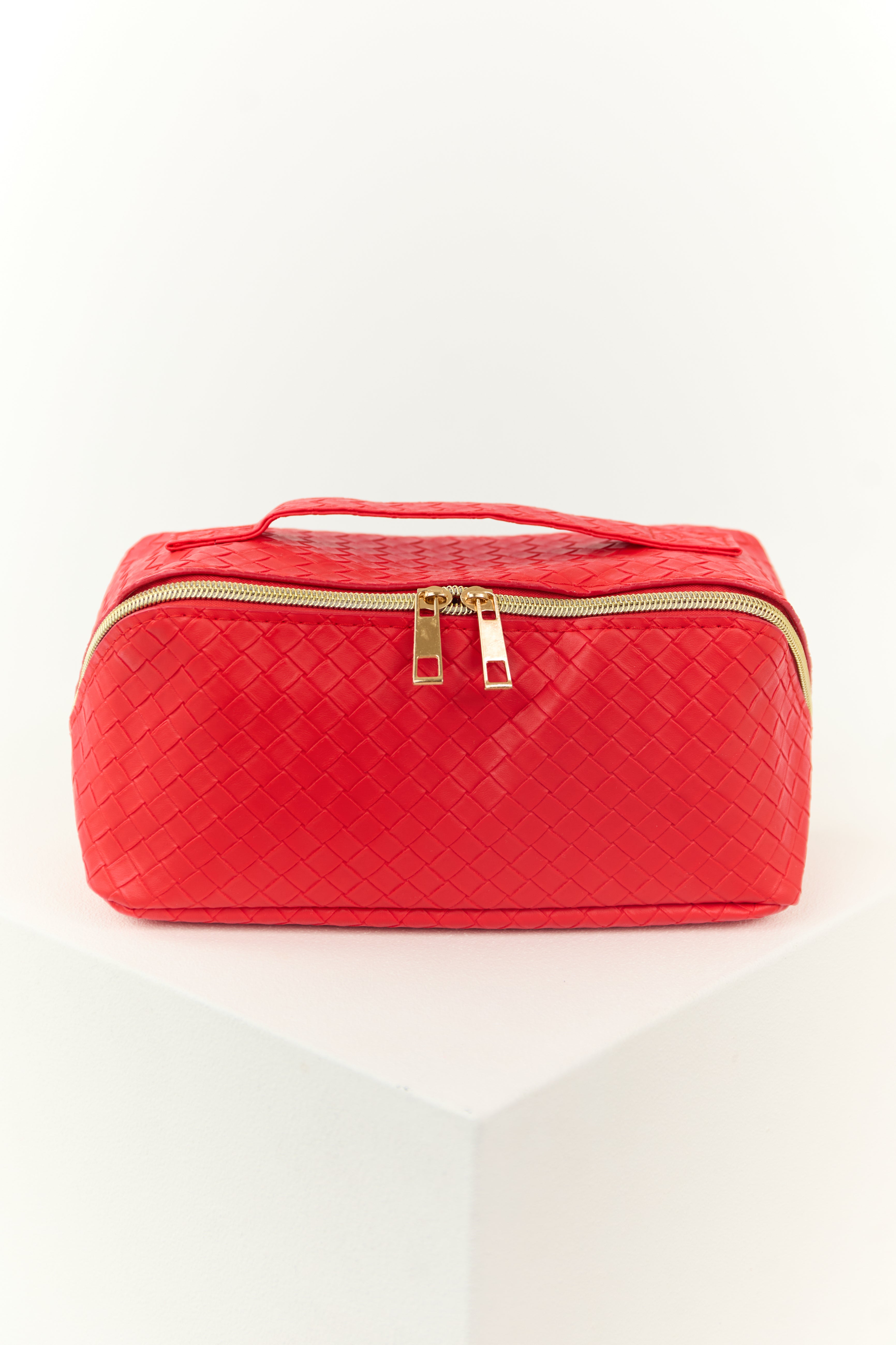 Indulge in luxury with our red braided faux leather makeup bag featuring a zipper opening, top handle, center zipper pocket, multiple inside pockets, and buttercream lining for a touch of elegance. Length: 9 inches, Width: 5 inches, Height: 4 inches. Stay organized in style with this imported accessory.