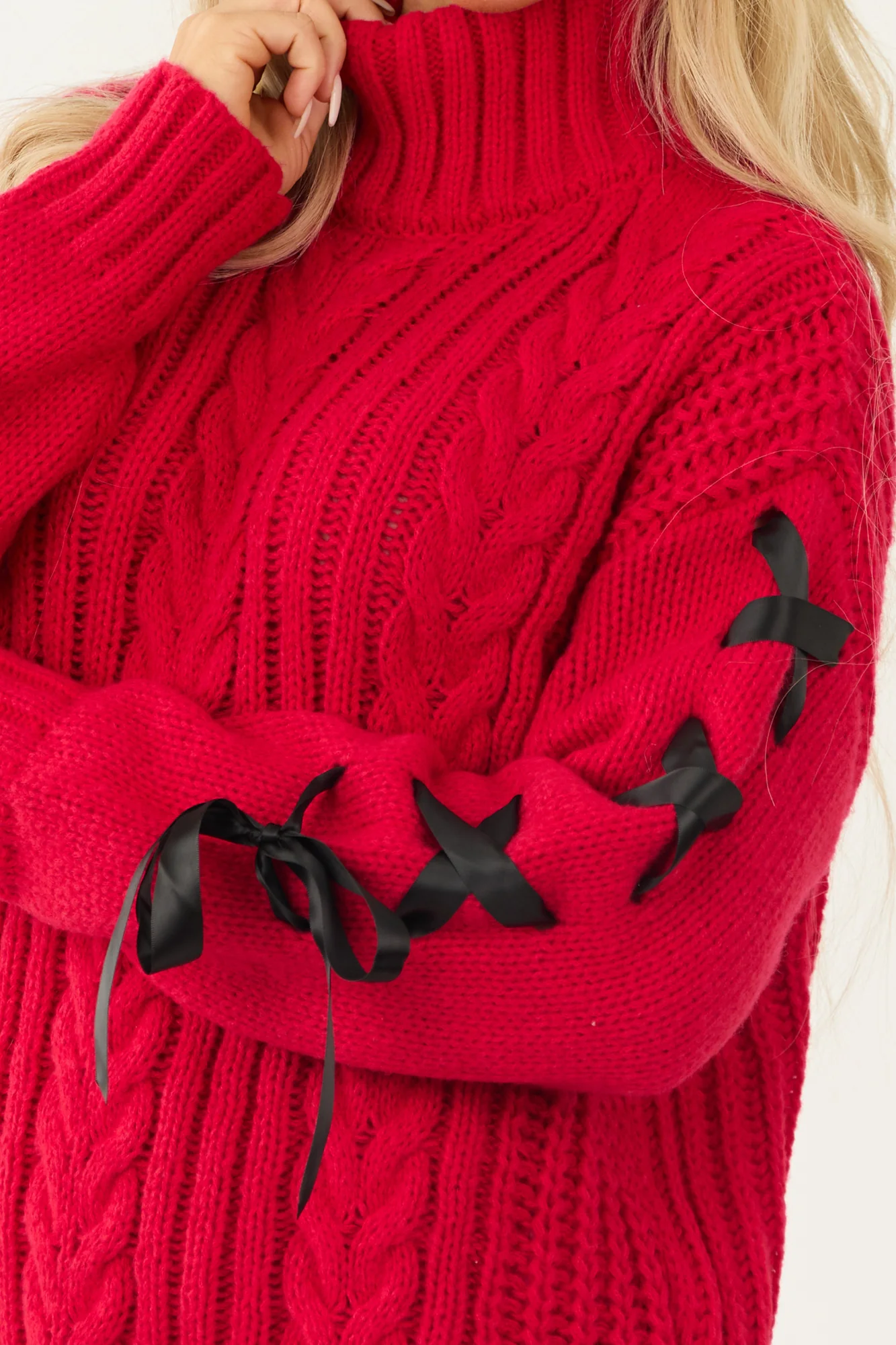 Indulge in chic warmth with our Ruby Cable Knit Ribbon Sleeve Mini Sweater Dress. Available in sizes S, M, and L, this dress features a slightly oversized fit for comfort. Crafted from stretchy cable knit material in a ravishing red hue, it boasts a stylish mock neck and unique ribbon sleeve detail. The lace-up accent with satin ribbon adds a touch of elegance. With a drop shoulder design and ribbed trim, this dress offers a sophisticated yet cozy look suitable for daytime outings or holiday parties. Made of 100% Polyester, this unlined dress should be hand washed cold and laid flat to dry, ensuring lasting beauty. Model is 57″ and wears a size Small.