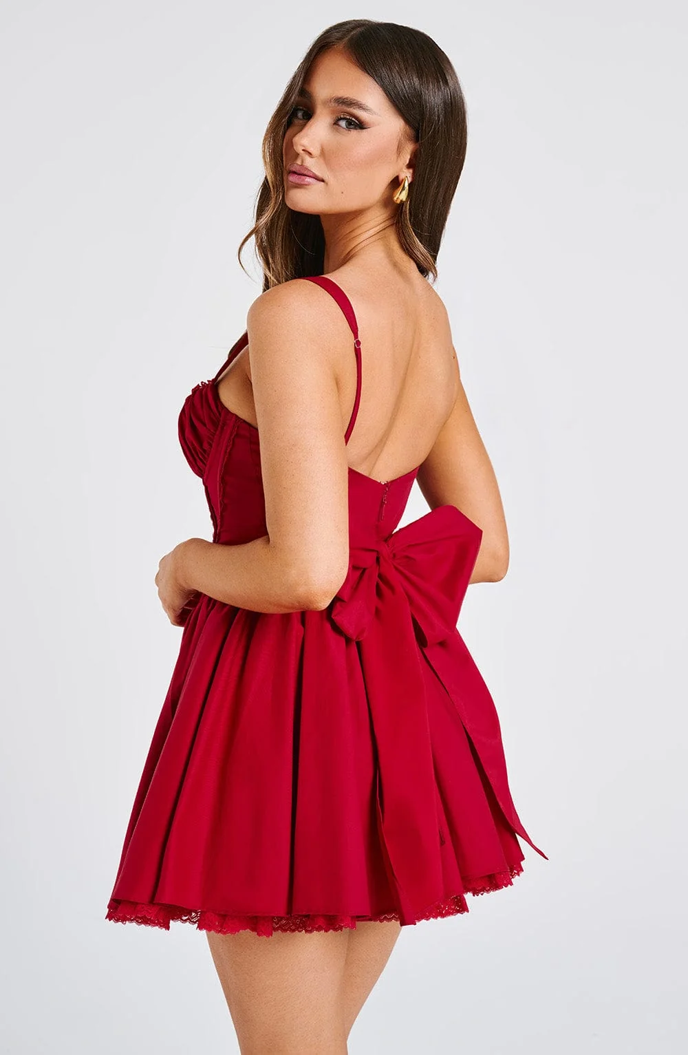 Indulge in elegance with our red mini dress, Josie. Crafted from a premium cotton blend, adorned with delicate lace trims, a charming oversized bow to the back, and figure-enhancing boning for a striking waistline. This flirty design features gather underwired cups, a full skirt, and an invisible zipper. Perfect for date nights, this dress is a must-have for a sophisticated look. Available in sizes XS to XXL. Model wears size XS. Color: Red.