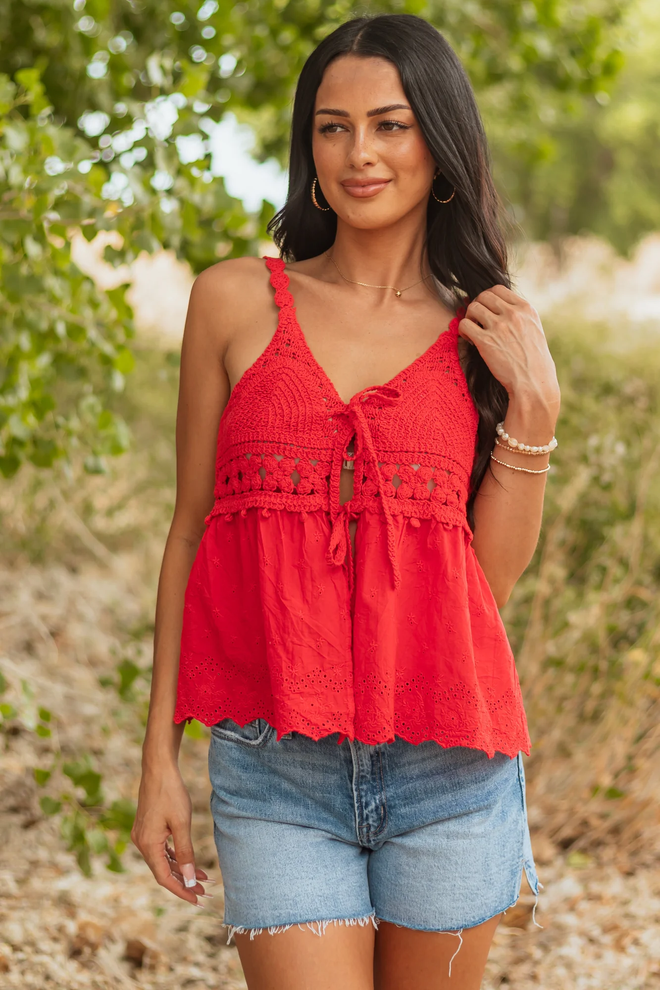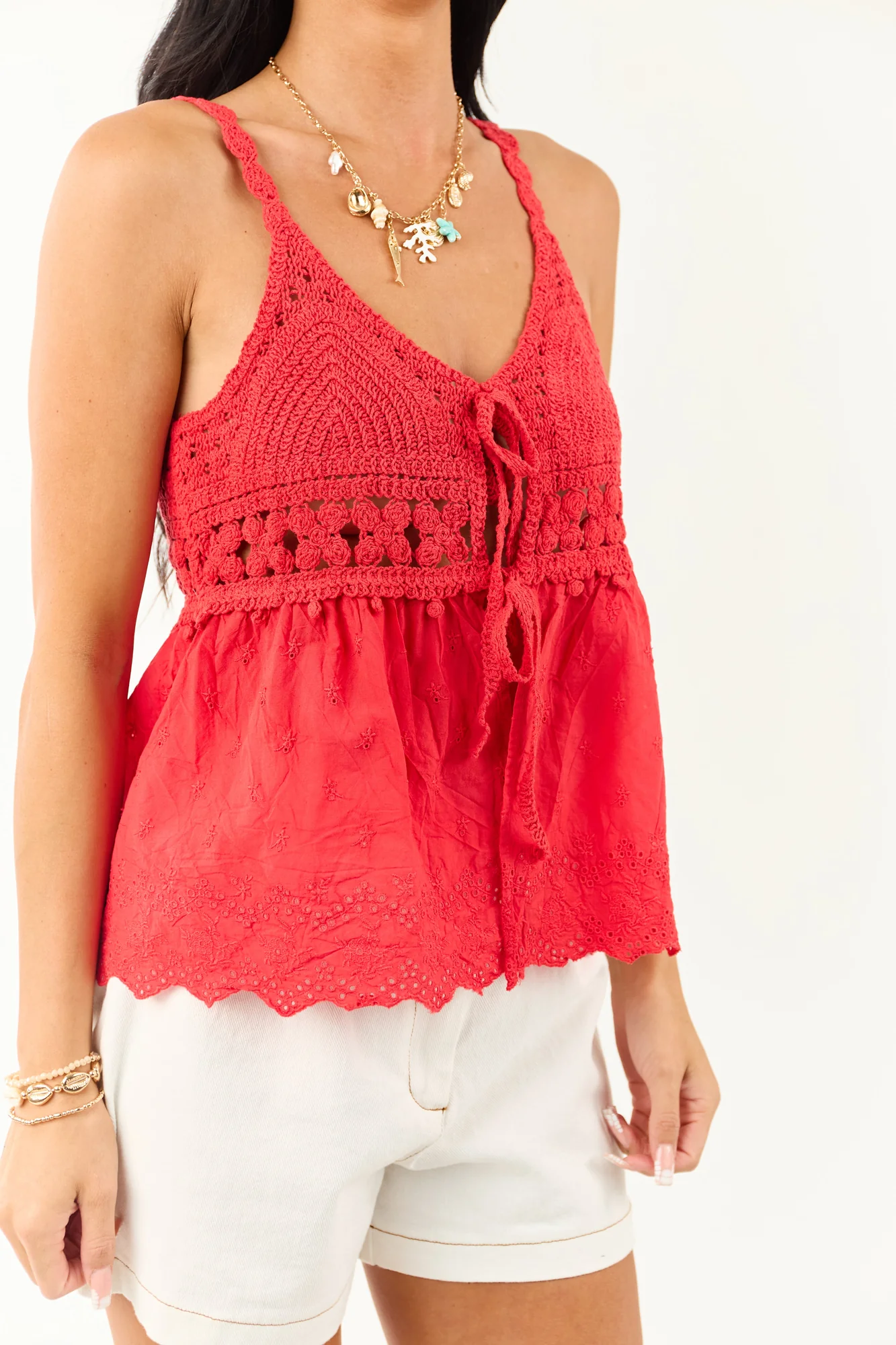 Stand out in a crowd with this adorable bold boho tank top made of non-stretchy lightweight cotton. It features a stretchy open knit contrast, open front with ties, and a scalloped hem for a stylish look. This sleeveless top is perfect for summer days. Available in sizes Small, Medium, and Large. Bust: 36-40 inches. Length: 23-24 inches. Strap width: 0.75 inches.