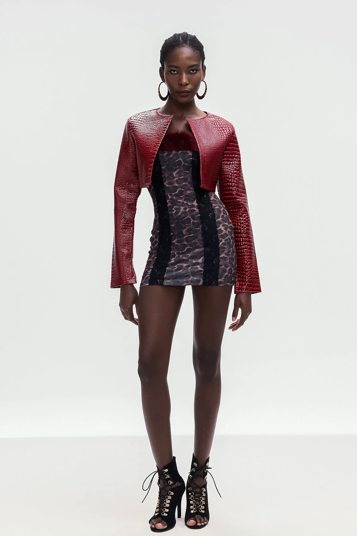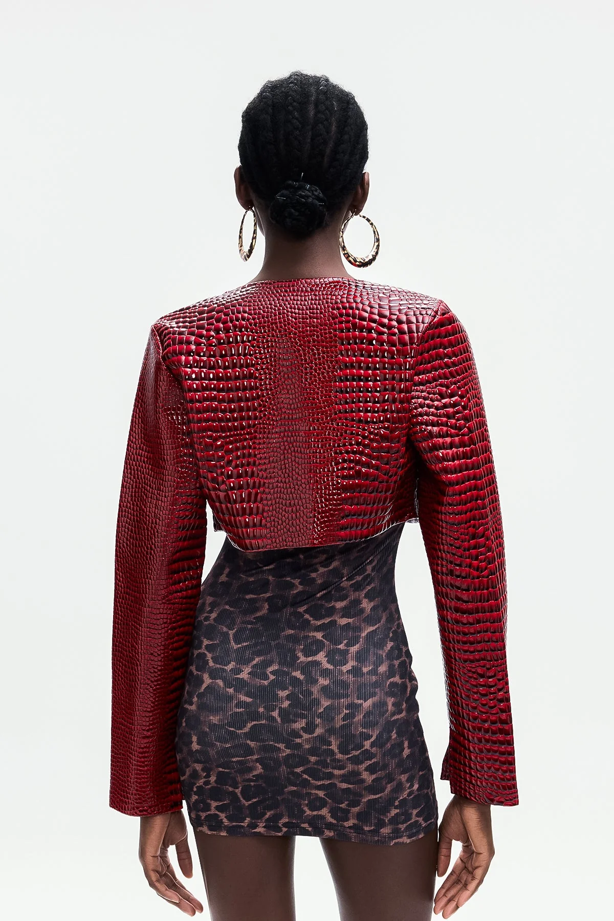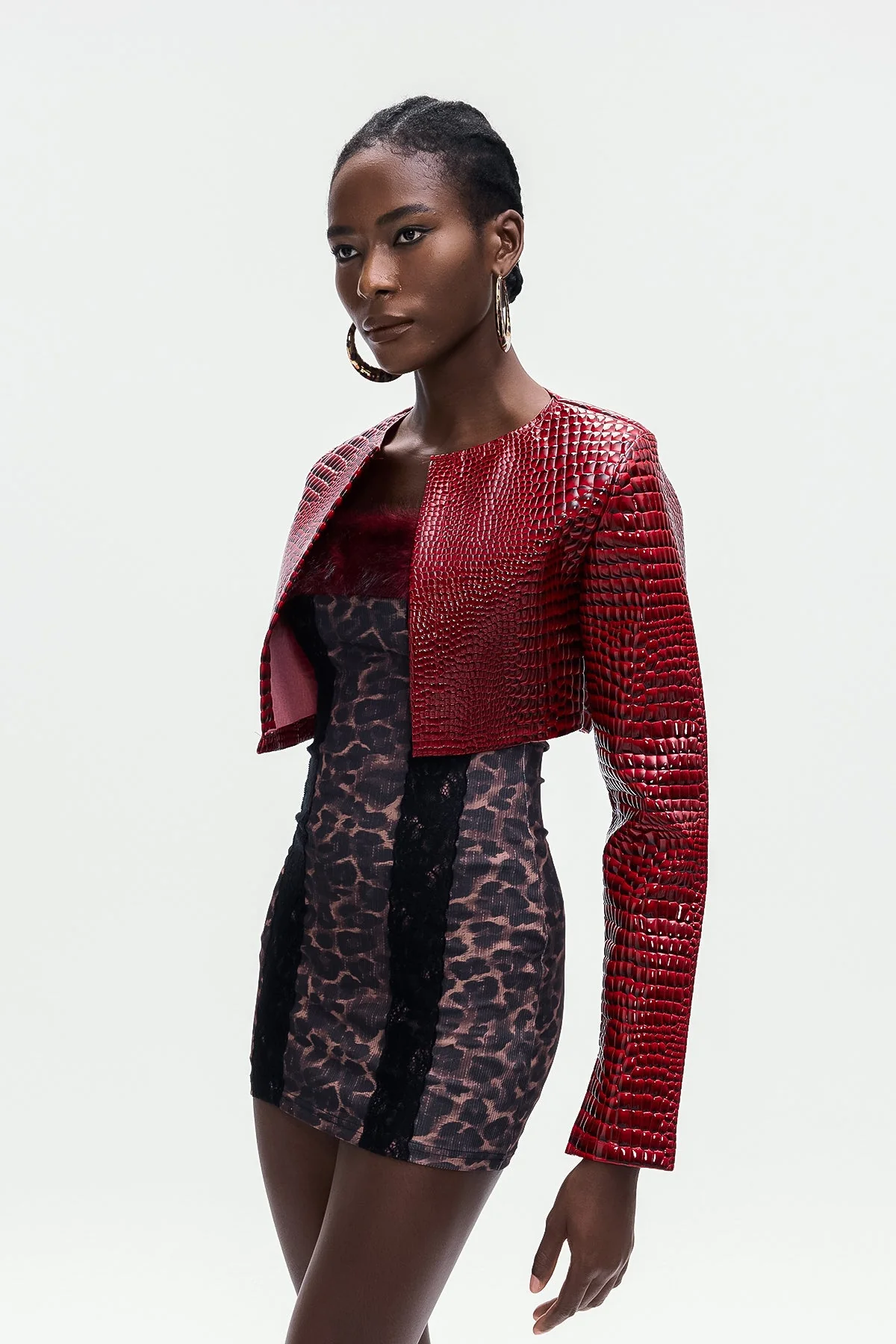 Indulge in the exquisite design of our Red Crocodile Patterned Crop Leather Jacket. This stunning piece features a sleek crocodile pattern and a cropped silhouette, offering both style and function. Crafted from premium leather for durability and a touch of luxury. Elevate your wardrobe with this must-have red jacket. Material: 50% Polyester, 50% Cotton. Stretch Factor: Non-Stretch. Care Instructions: Gentle machine wash. Please note that colors may vary due to lighting. Discover the perfect balance of elegance and edginess with this urban-chic jacket.