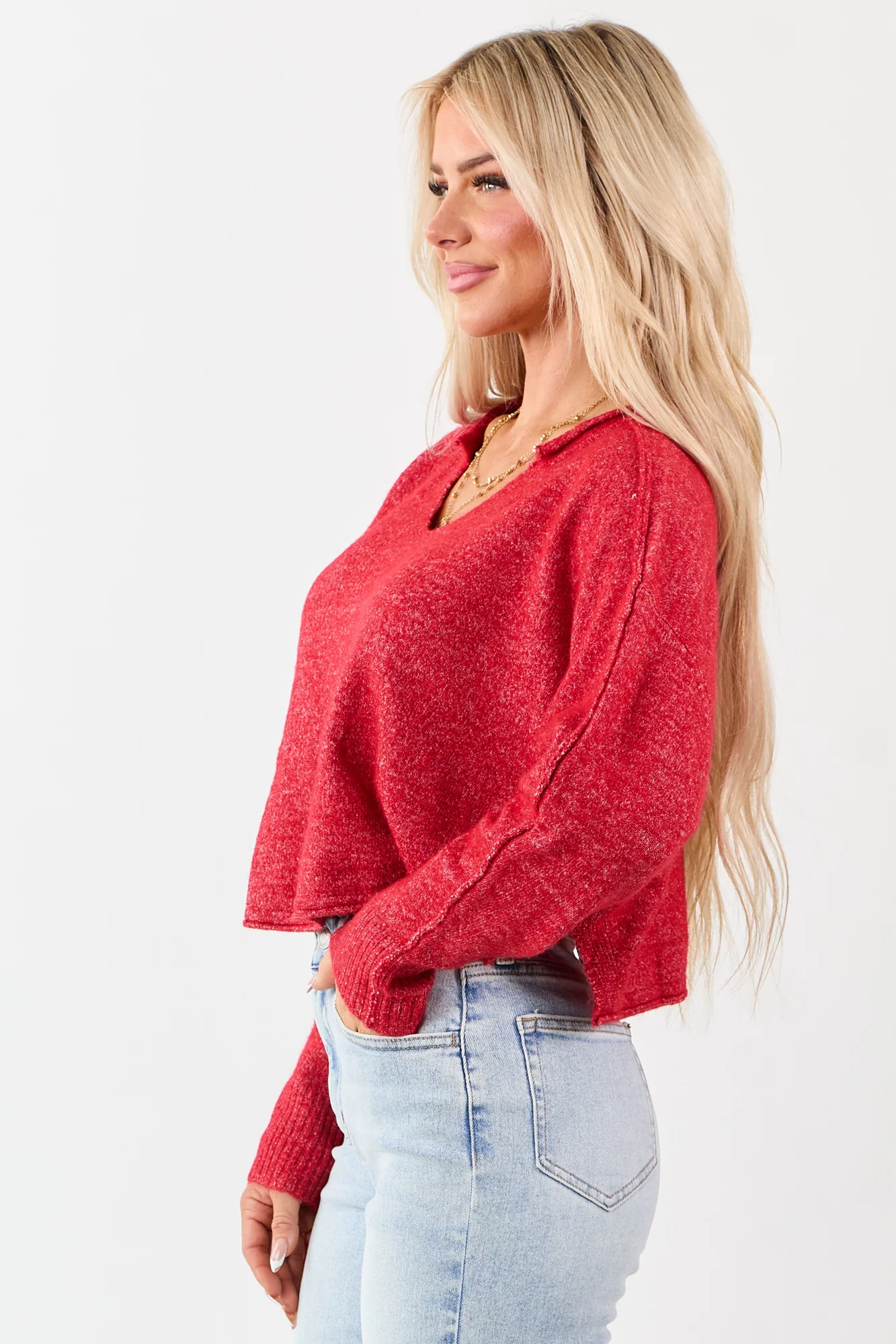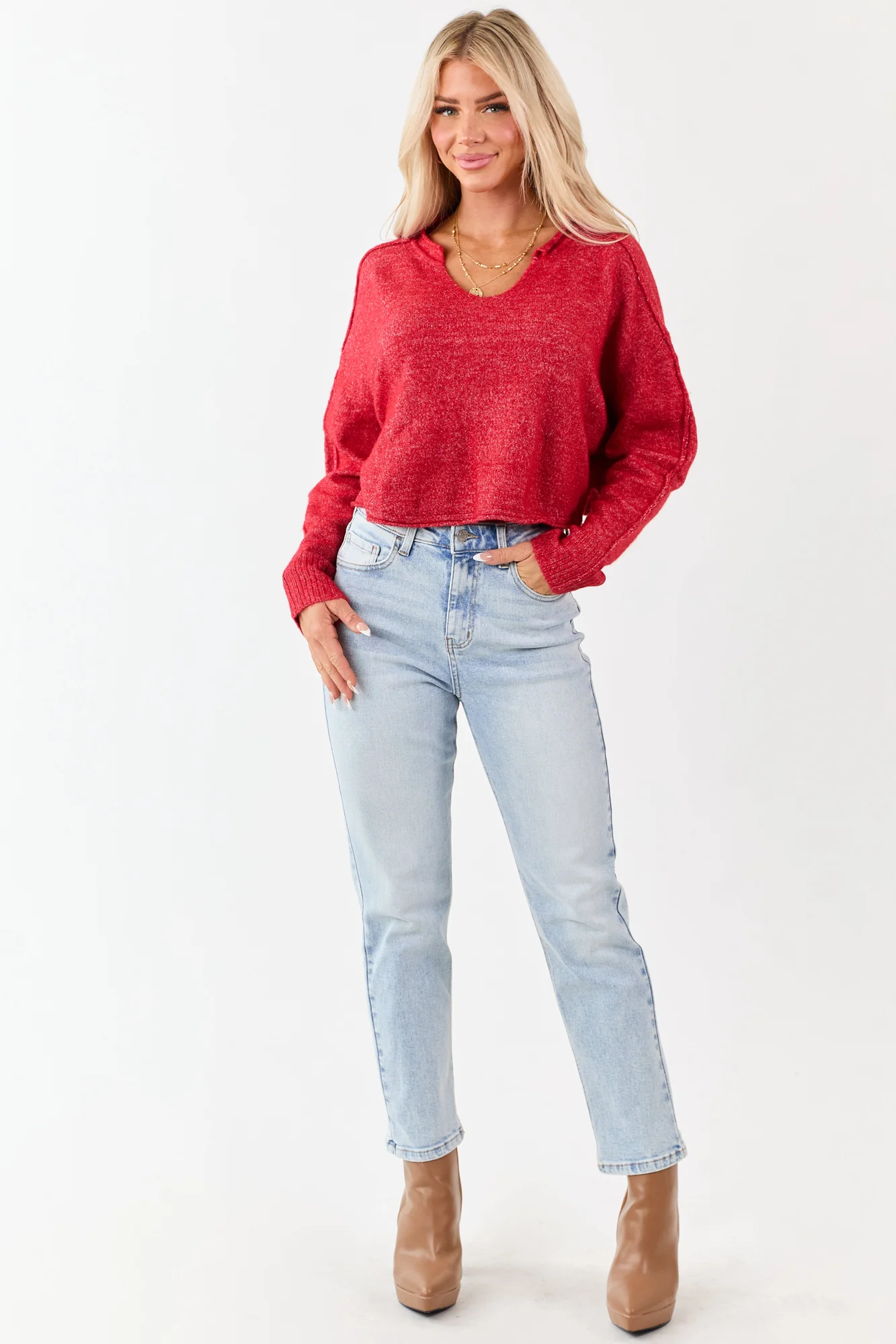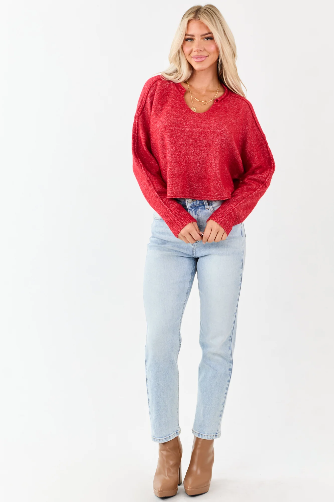 Experience the perfect blend of coziness and style with our red cropped V-neck sweater. Crafted from a soft wool blend, this boxy sweater features an oversized fit, stretchy ribbed knit, semi-cropped design, raw trim, drop shoulder, and side slits for a trendy look. Made with 50% recycled polyester, 15% polyester, 13% nylon, 13% acrylic, and 6% wool. Available in sizes Small, Medium, and Large.