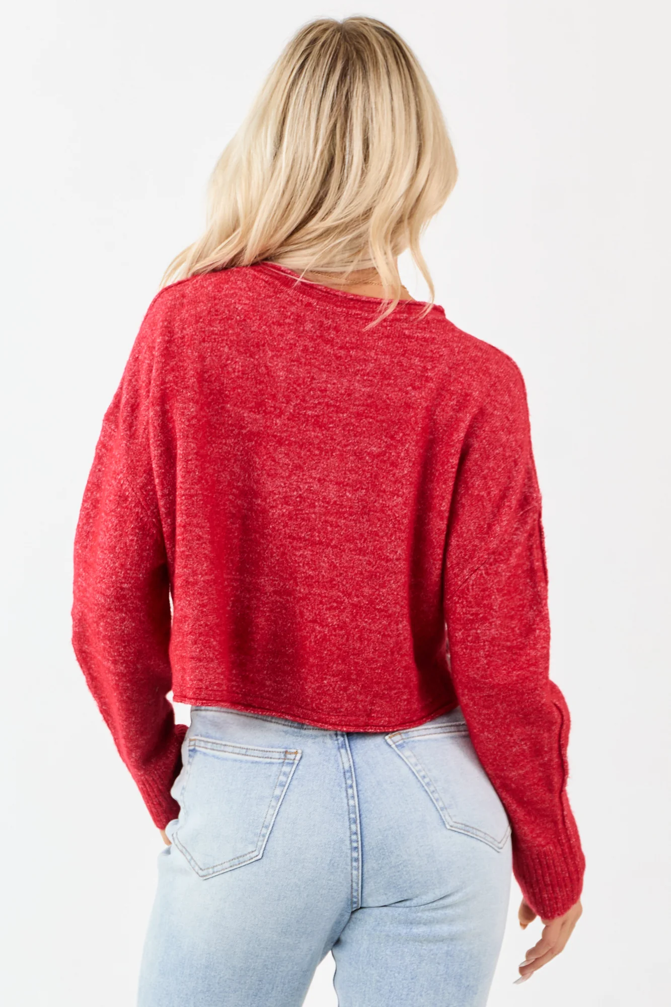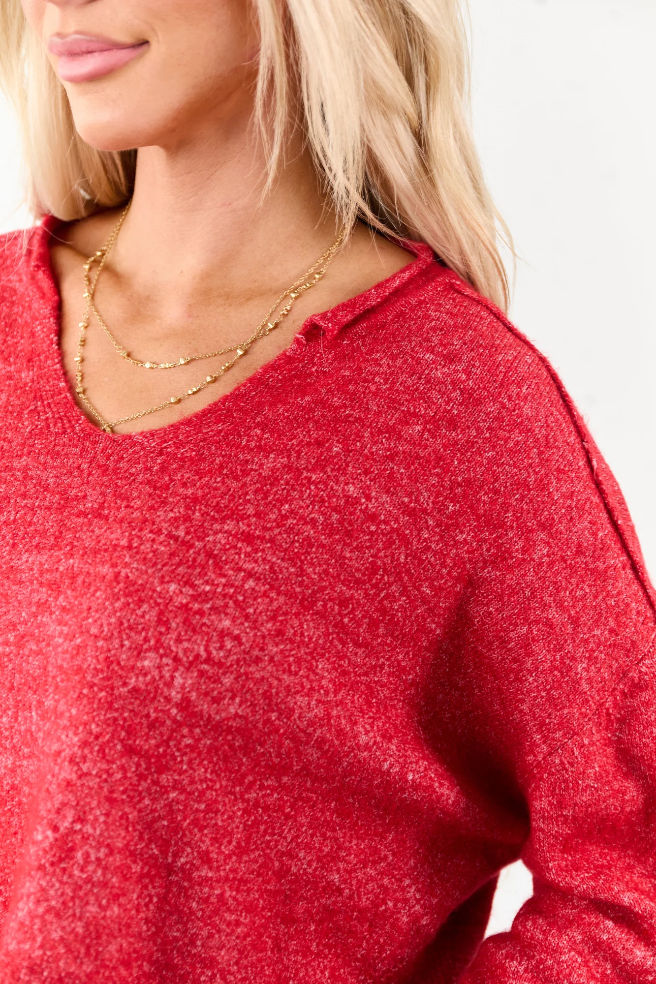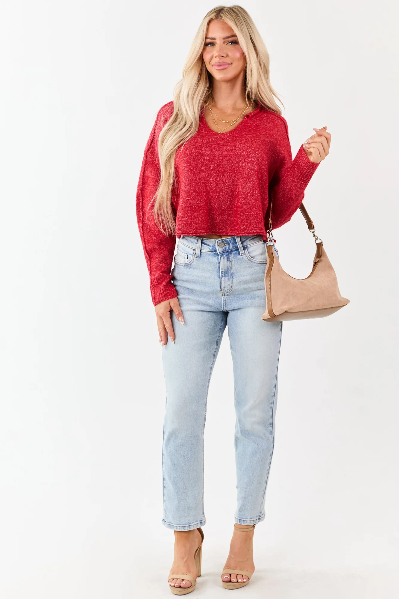 Experience the perfect blend of coziness and style with our red cropped V-neck sweater. Crafted from a soft wool blend, this boxy sweater features an oversized fit, stretchy ribbed knit, semi-cropped design, raw trim, drop shoulder, and side slits for a trendy look. Made with 50% recycled polyester, 15% polyester, 13% nylon, 13% acrylic, and 6% wool. Available in sizes Small, Medium, and Large.