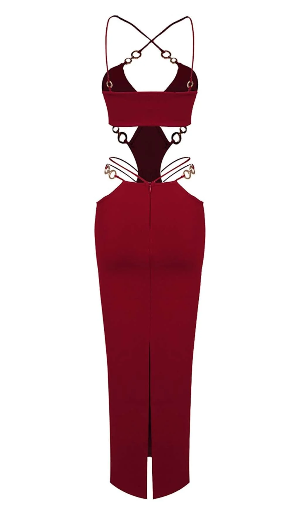 Elevate your evening look with this fiery red maxi dress featuring sultry front cut-outs and glinting draped chain details. Feel confident and sexy in this red-hot maxi dress styled with skin-baring cut-outs. This exquisite dress is perfect for special occasions and cocktail parties. Gentle dry clean only. The color may vary slightly due to lighting in images. Our dress runs true to size chart with close attention to detail, ensuring the perfect fit. Refer to our size chart for the best sizing guidance.