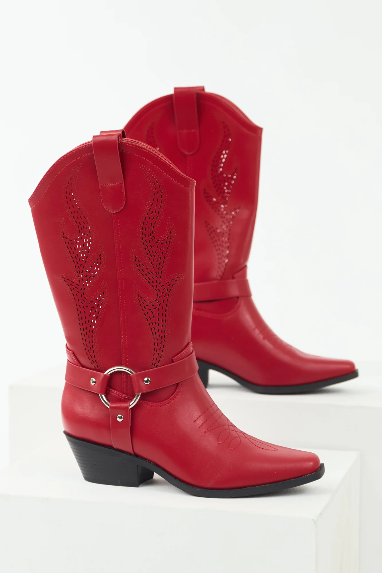 These Red Embroidered Riding Strap Heeled Boots are crafted from non-stretchy faux leather with a squared toe design, featuring easy pull-on straps, a trendy ankle riding strap adorned with silver hardware, and a stylish block heel measuring 2 inches. The curved opening adds a unique flair, while the shaft height of 13 inches and circumference of 15 inches offer a comfortably snug fit. Imported and available in multiple sizes to suit your style needs.