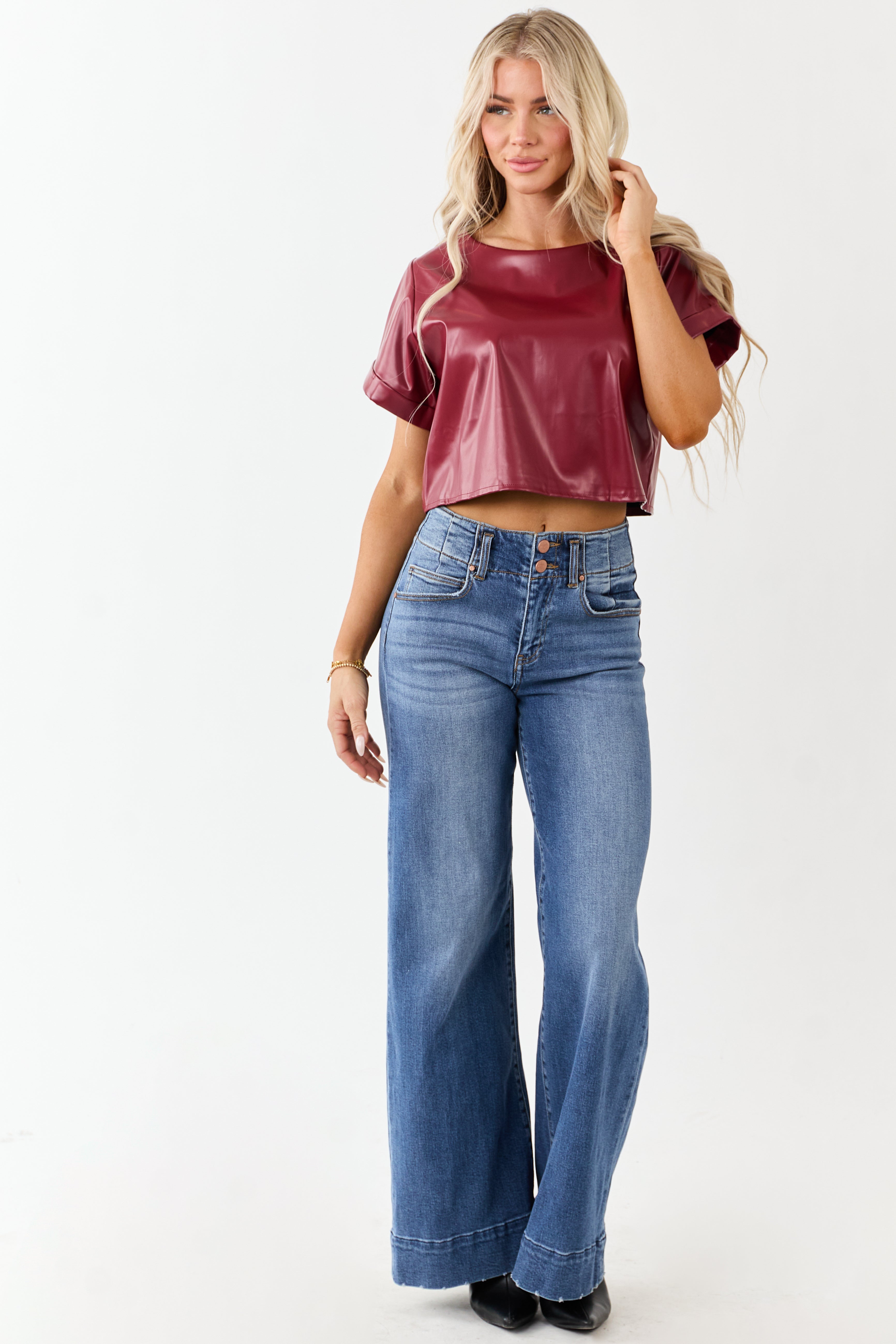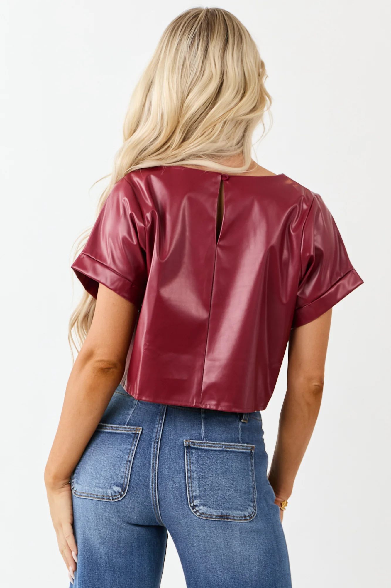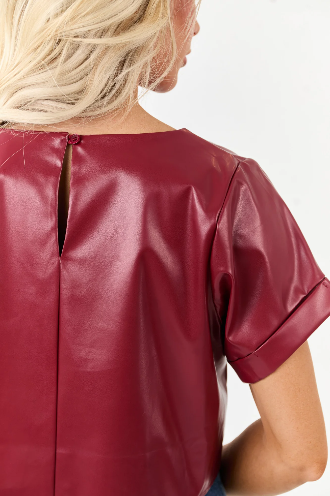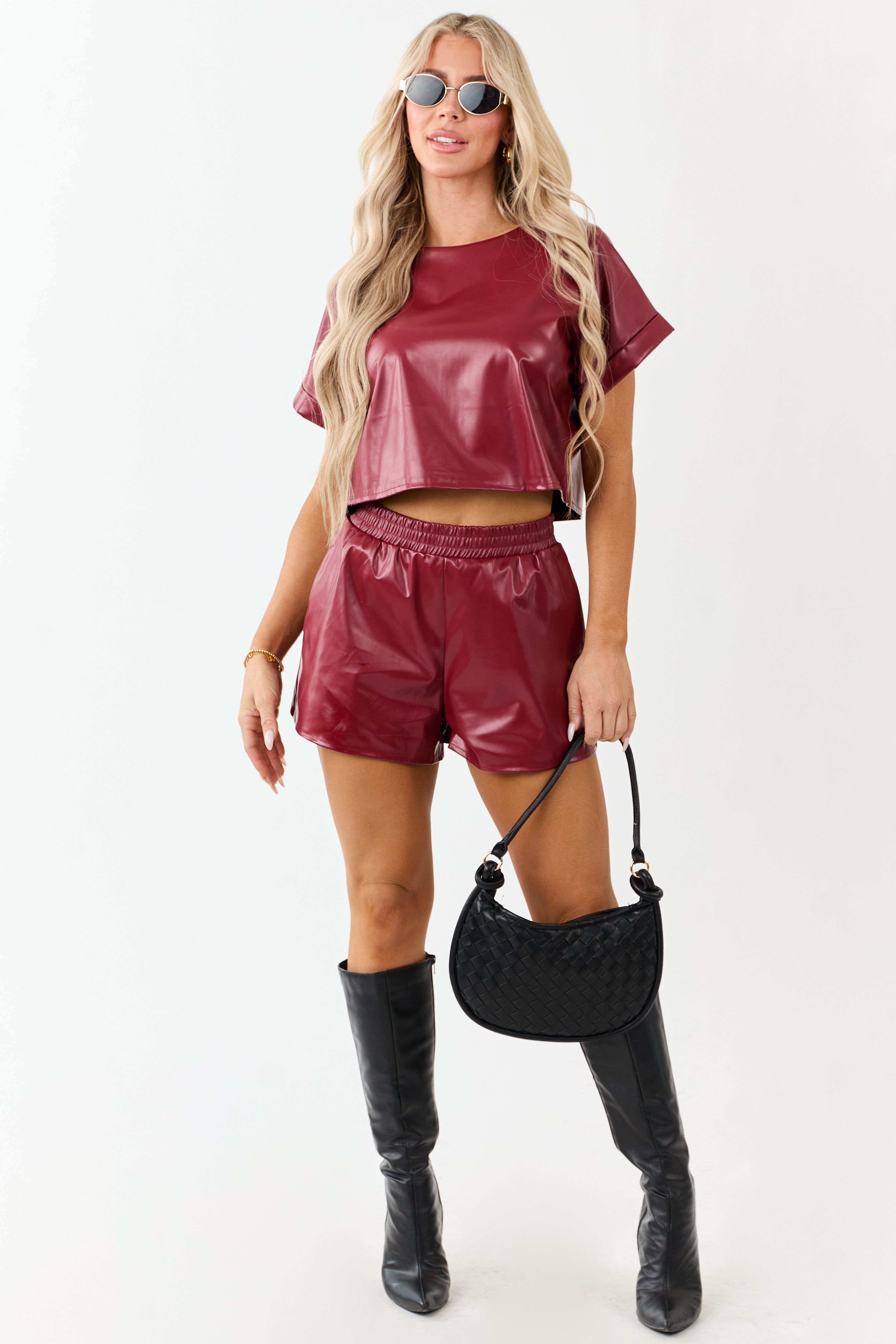 Add some edge to your wardrobe with this stunning red faux leather boxy crop top. The top features sewn cuff sleeves, a back keyhole with button closure, and is made of 60% Polyester and 40% PU. Perfect for a bold and chic look. Pair with matching Cherry Faux Leather Elastic Waist Shorts for a complete outfit. This non-stretchy top comes in sizes S, M, and L. Model is wearing a size Small. Model’s Profile: Size 3, Height 57″, Bust 35″, Waist 26″