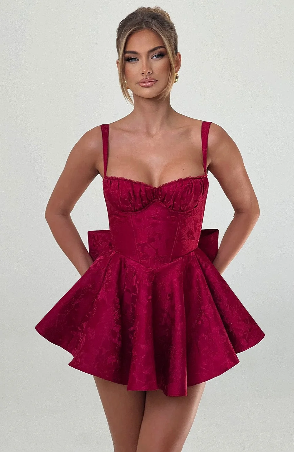 Indulge in the elegance of the Red Floral Jacquard Playsuit offering a premium jacquard fabric with an all-over floral design. This stunning piece features a cinched waist, flared skirt with in-built shorts, underwired balconette bust, and delicate lace trim. Complete with a removable oversized bow at the back, this mini-length playsuit boasts adjustable straps, boning in the bodice, and invisible zipper closure for a perfect fit. Make a bold statement at any event with this chic ensemble.