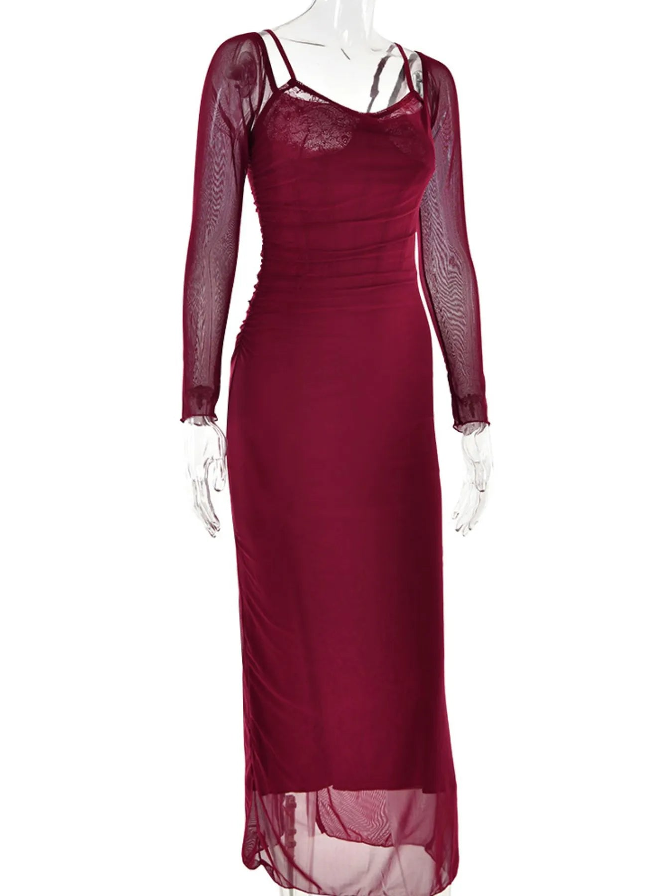Indulge in the sophistication of the Red Lace Bodycon Maxi Dress. Featuring a luxurious sheer fabric with an elegant slit and ruched detailing, this dress offers a flattering silhouette. Made from 100% polyester, it ensures comfort and style. Machine wash cold and tumble dry low for easy care. Perfect for date nights or special occasions. Available in sizes S, M, and L.