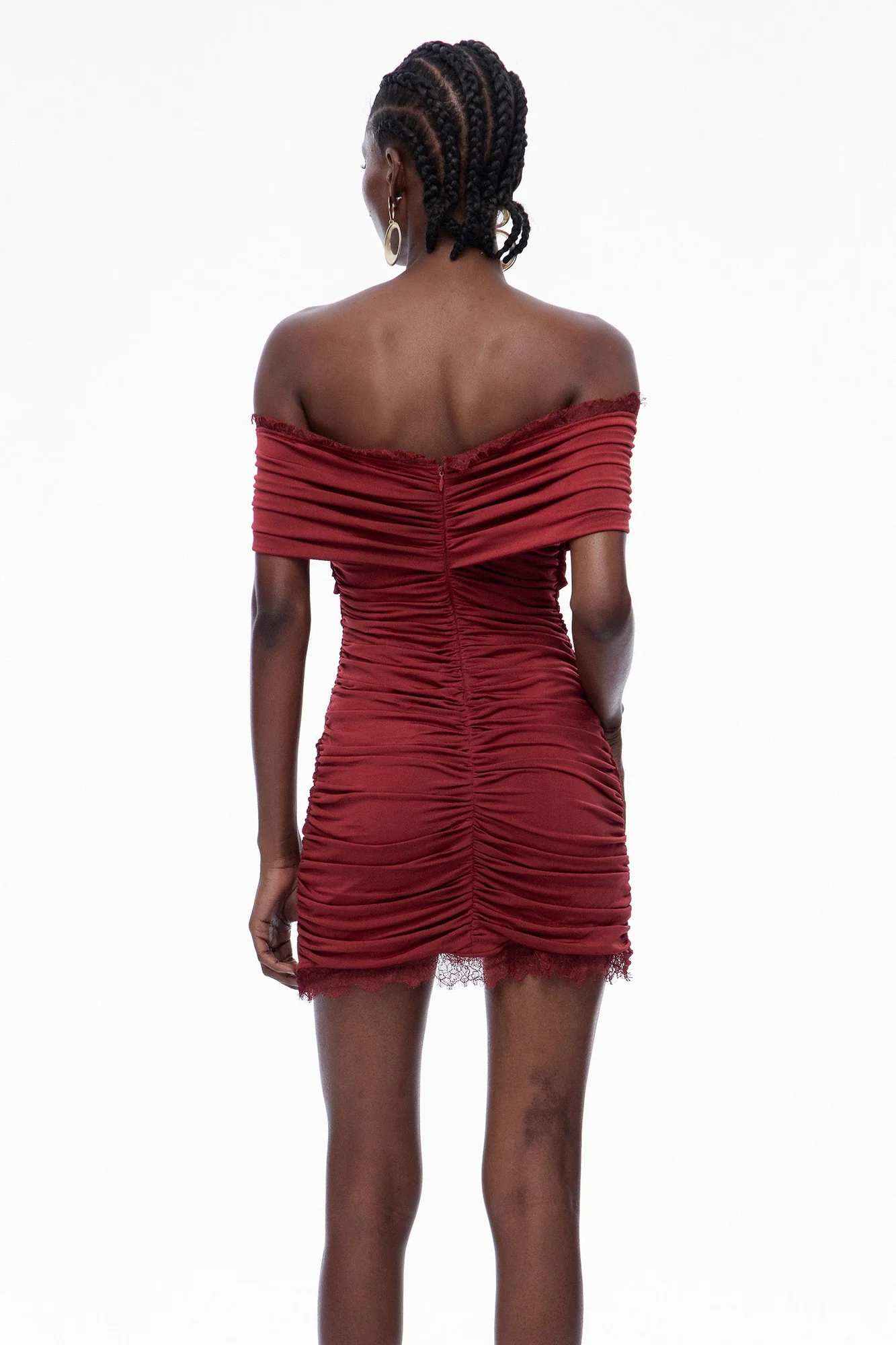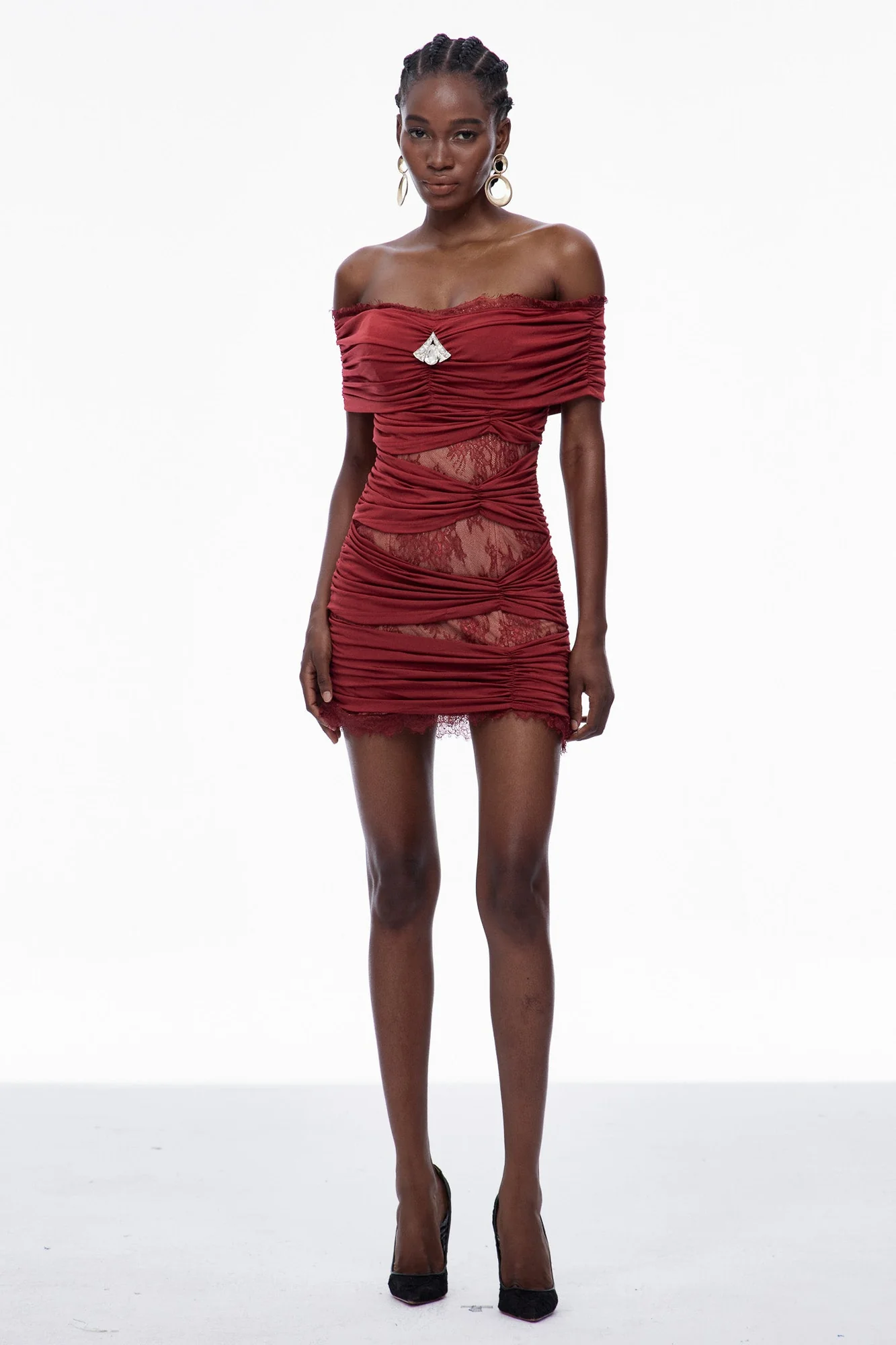 Elevate your style with the Red Lace Off Shoulder Mini Dress featuring delicate lace, an off-shoulder silhouette, and flattering ruching. This dress combines elegance with a modern vibe, accentuating your waist while offering comfort and style. Perfect for various occasions, the slight stretch ensures a great fit. Add this chic essential to your wardrobe today and make a statement. Gentle machine wash recommended. Please note, color may vary slightly due to lighting. Available in sizes S, M, and L.