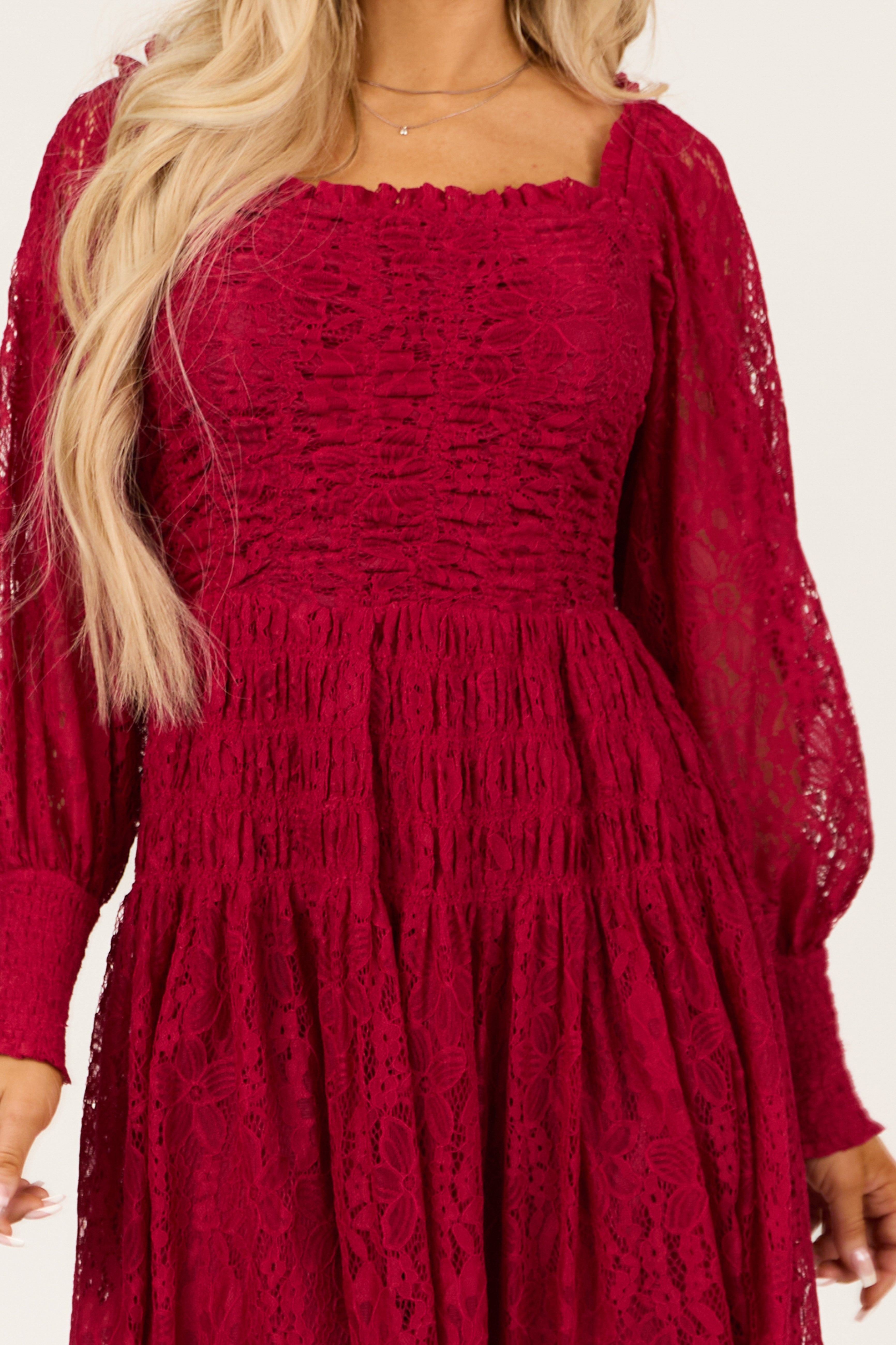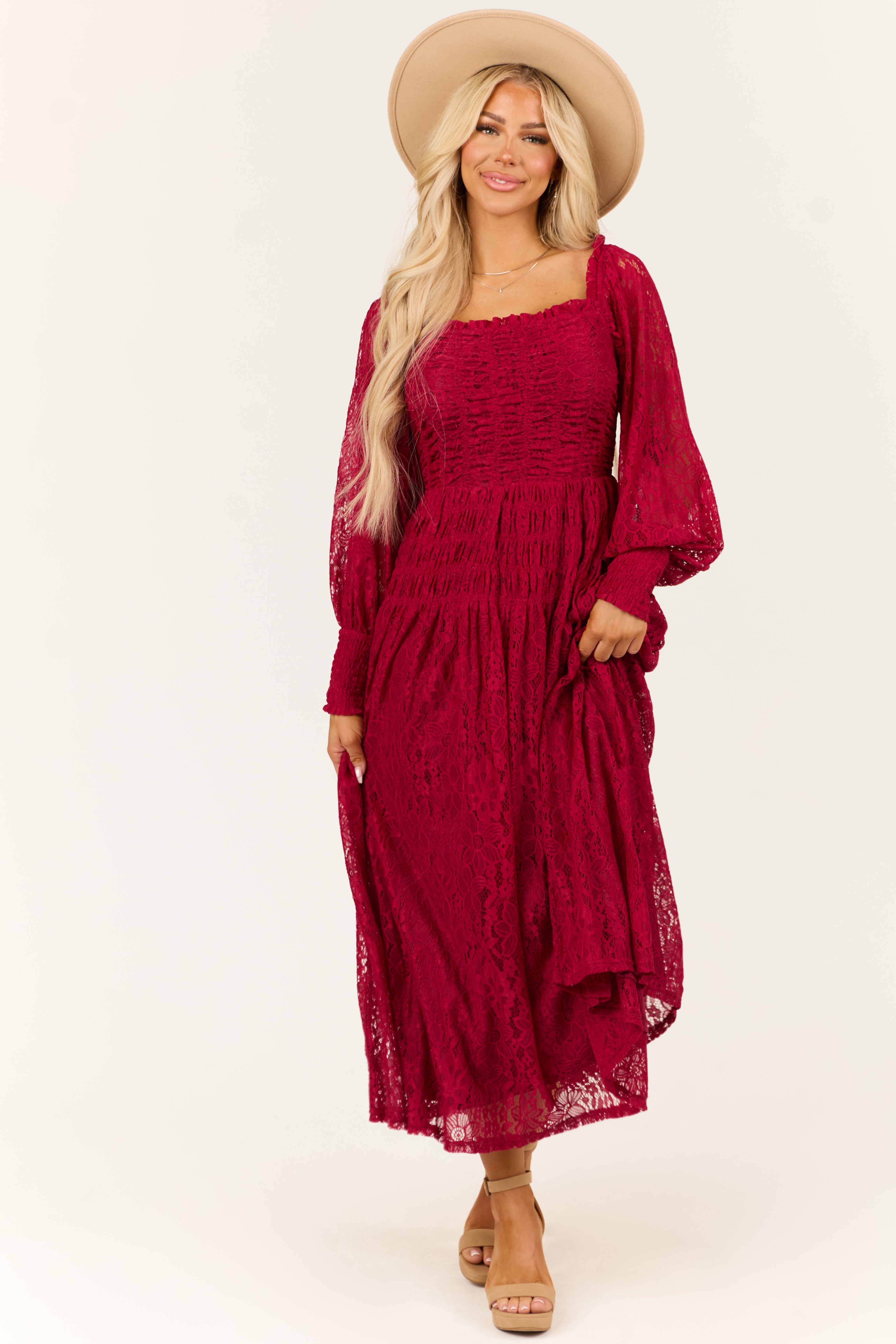 Indulge in the elegance of our Red Lace Smocked Bubble Sleeve Maxi Dress, a timeless piece that effortlessly combines style and comfort. Crafted with a Semi-stretchy woven fabric, this dress features long open lace bubble sleeves with fitted smocked cuffs and a square frill neckline. The smocked elastic bodice ensures a flattering fit while the lining guarantees both quality and discretion. Perfect for various occasions, this dress measures Bust: 30″ 32″ 34″, Waist: 26″ 27″ 28″, Sleeve: 28″ 29″ 30″, Length: 53″ 54″ 55″. Available in sizes Small, Medium, and Large. Get yours today!