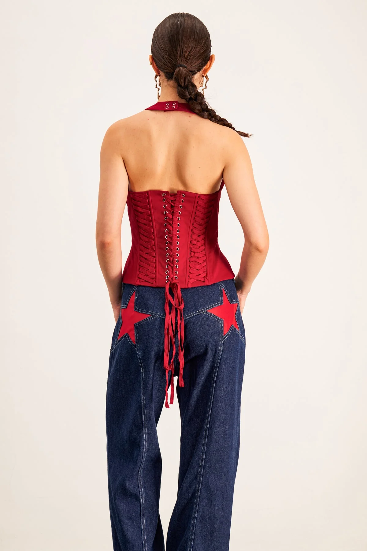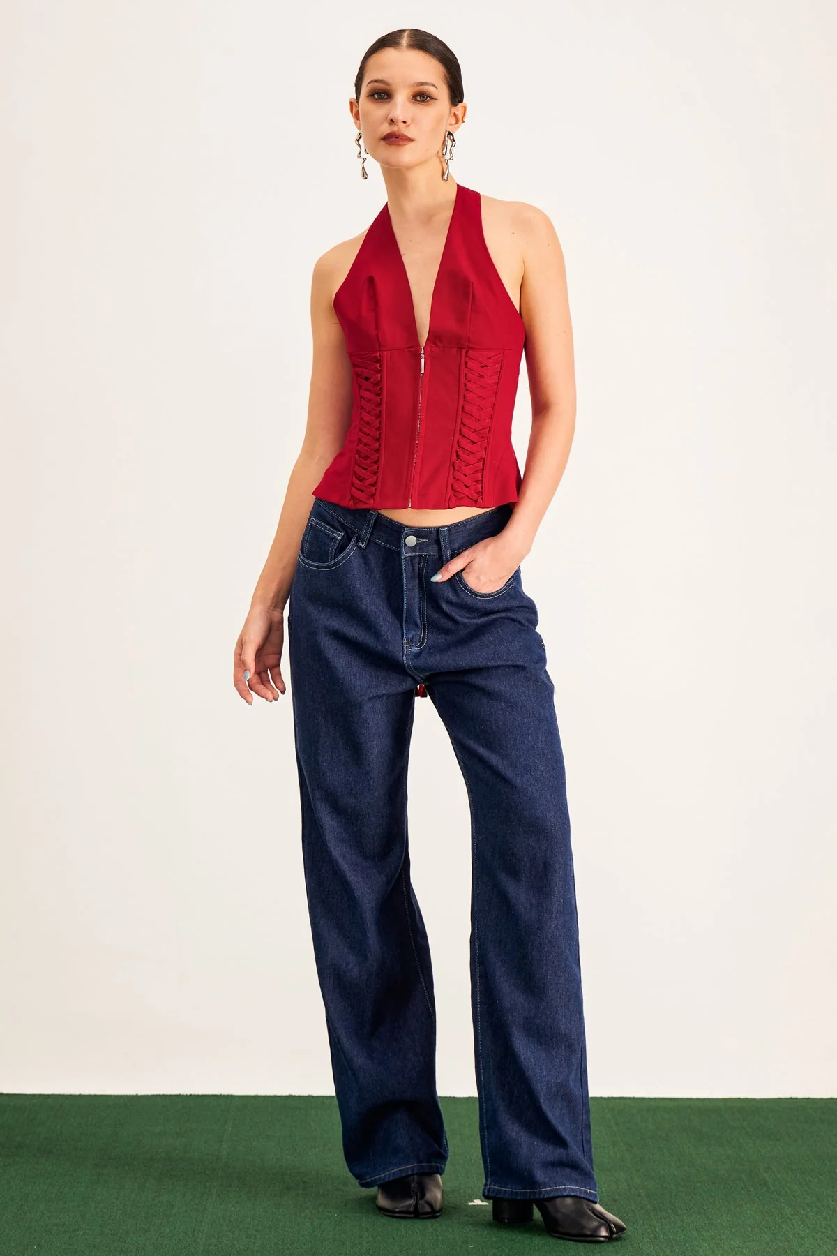 Elevate your wardrobe with the Red Lace Up Halter Neck Corset Top . This elegant top features a lace-up design and halter neckline, adding sophistication to any outfit. Crafted with 50% Polyester and 50% Cotton for comfort and style. Perfect for a stylish urban edge look. The color may vary slightly due to lighting. Update your style with this must-have piece.