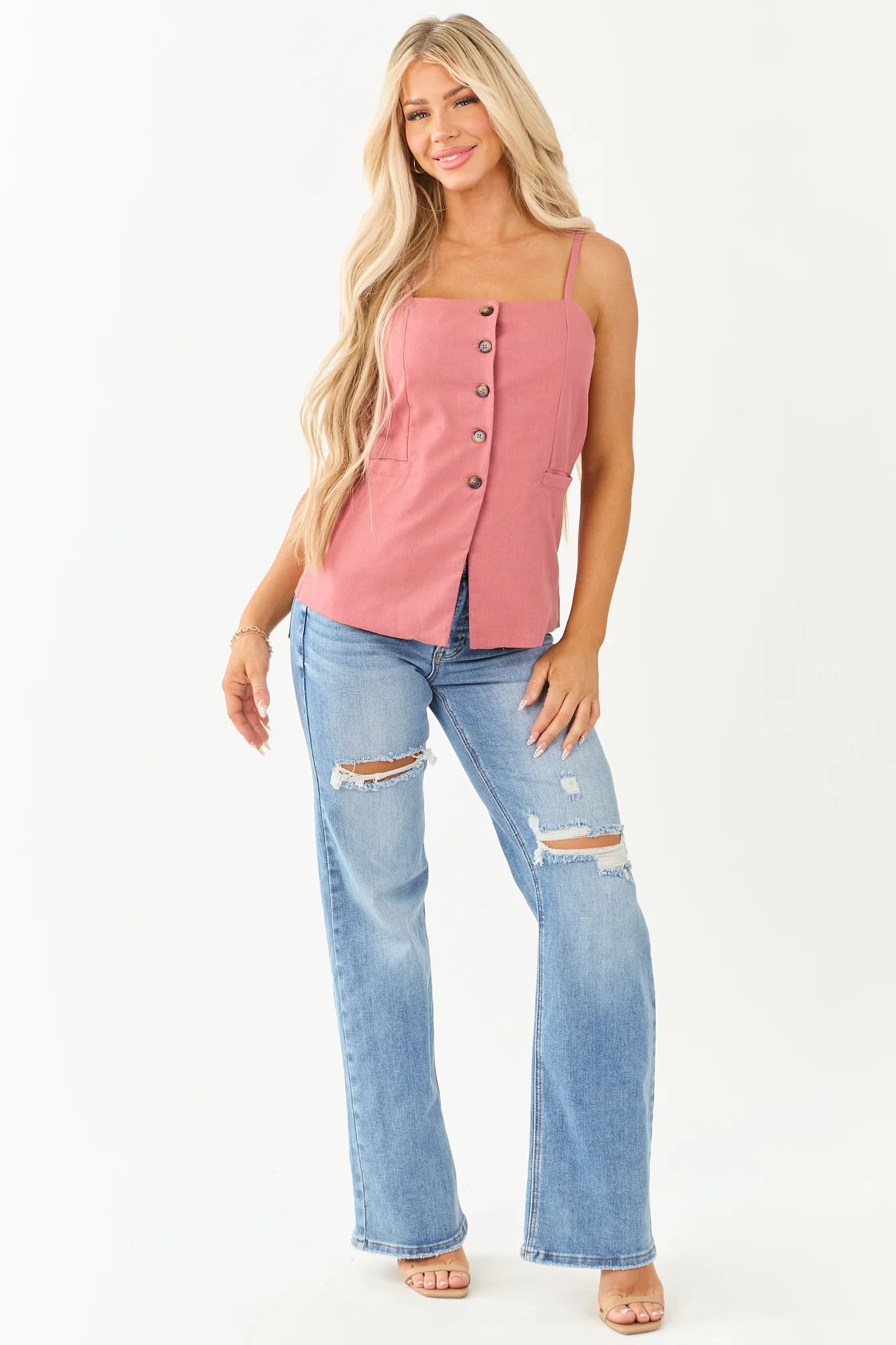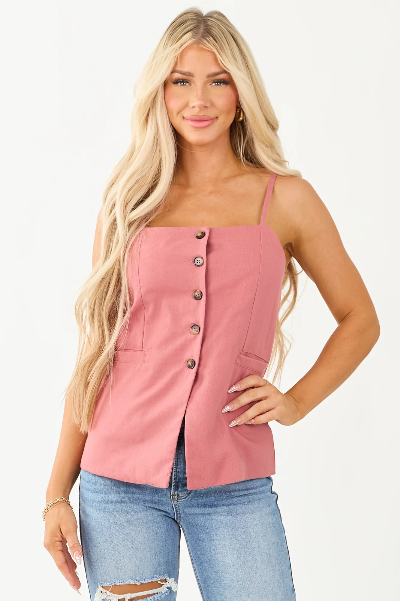 Embrace effortless style with our Red Linen Blend Tank Top. Crafted from a non-stretchy cotton linen blend, this top features front pockets, adjustable straps, and a front hem slit. The breathable fabric blend ensures a comfortable fit, making it perfect for all-day wear. Lined for added quality. Ideal for casual outings or layering under a jacket. Available in sizes S, M, and L.