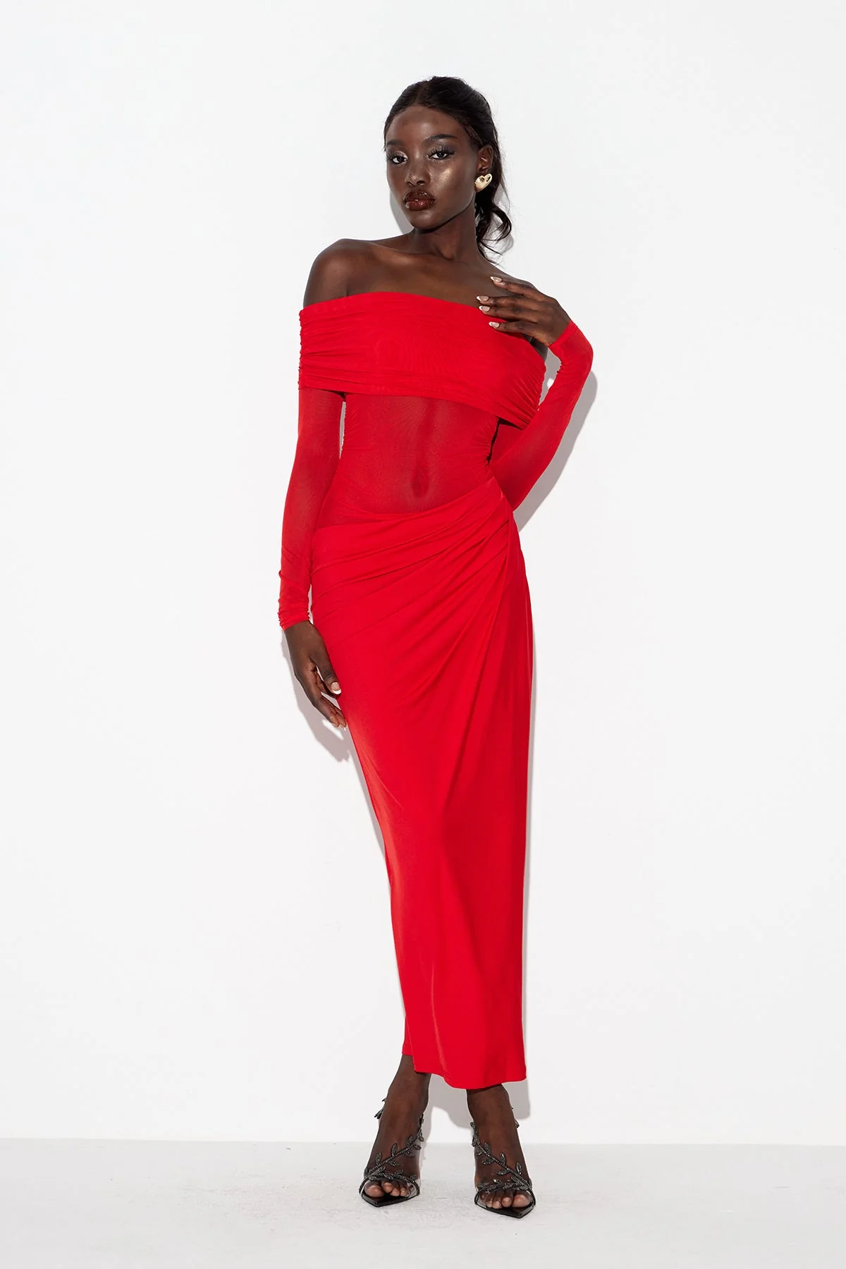Indulge in elegance with our Red Mesh Off Shoulder Maxi Dress. Crafted from lightweight mesh, this dress features delicate ruching, an off-shoulder neckline, and a flowing maxi length for graceful movement. The vibrant red hue adds sophisticated charm, perfect for evening occasions. Feel confident and stylish in this timeless yet contemporary statement piece. Slight Stretch. Recommended: Gentle machine wash to maintain color vibrancy. Color may vary due to lighting conditions.