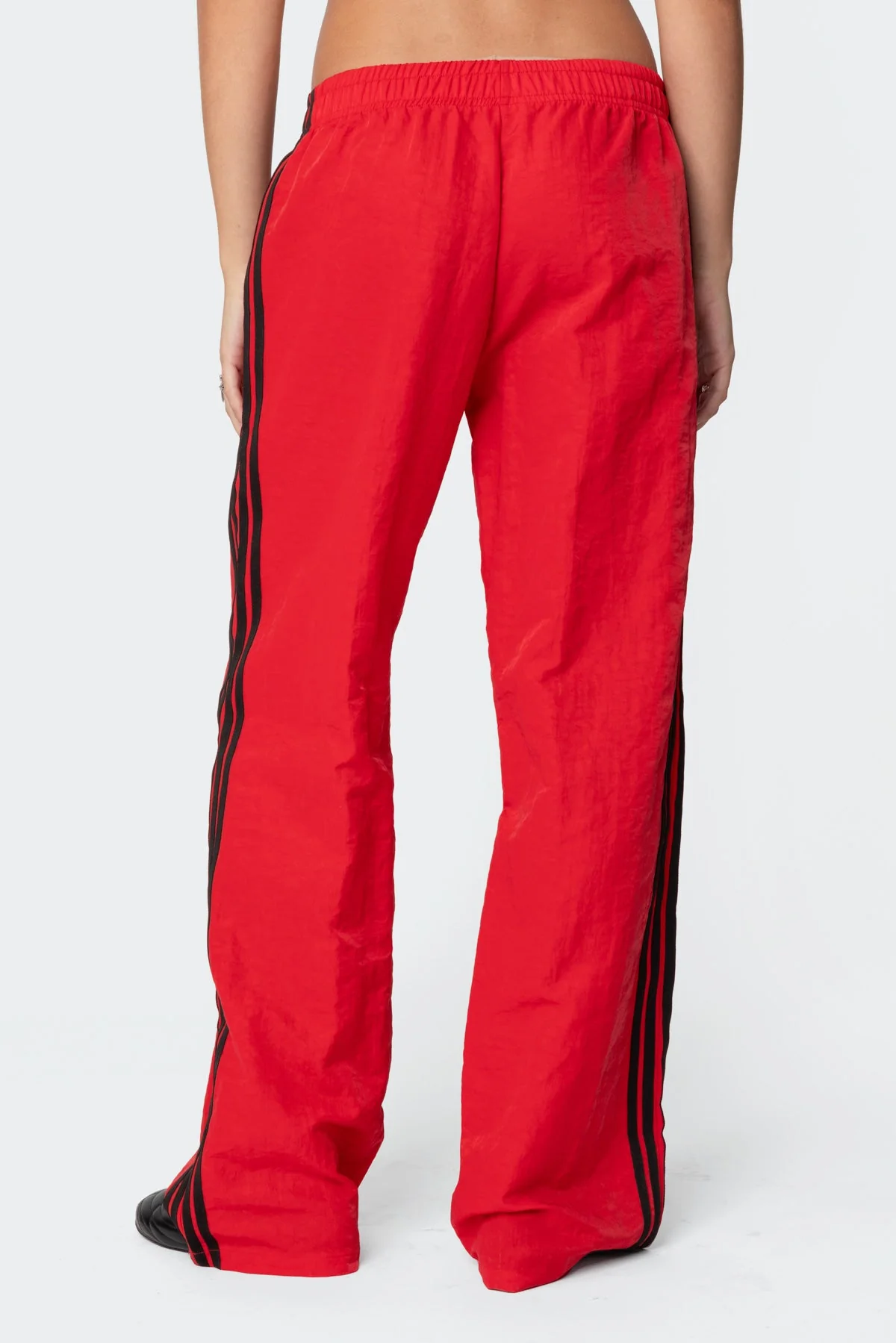 Discover ultimate comfort and style with our Red Nylon Elastic Waist Track Pants. Featuring side stripe detail for a trendy look and an elastic waistband for the perfect fit. Crafted from high-quality nylon fabric, these track pants are a must-have for your everyday wardrobe. Stay fashionable effortlessly. Model wears size S. Model height is 58. Care Instructions: Machine wash with similar colors.