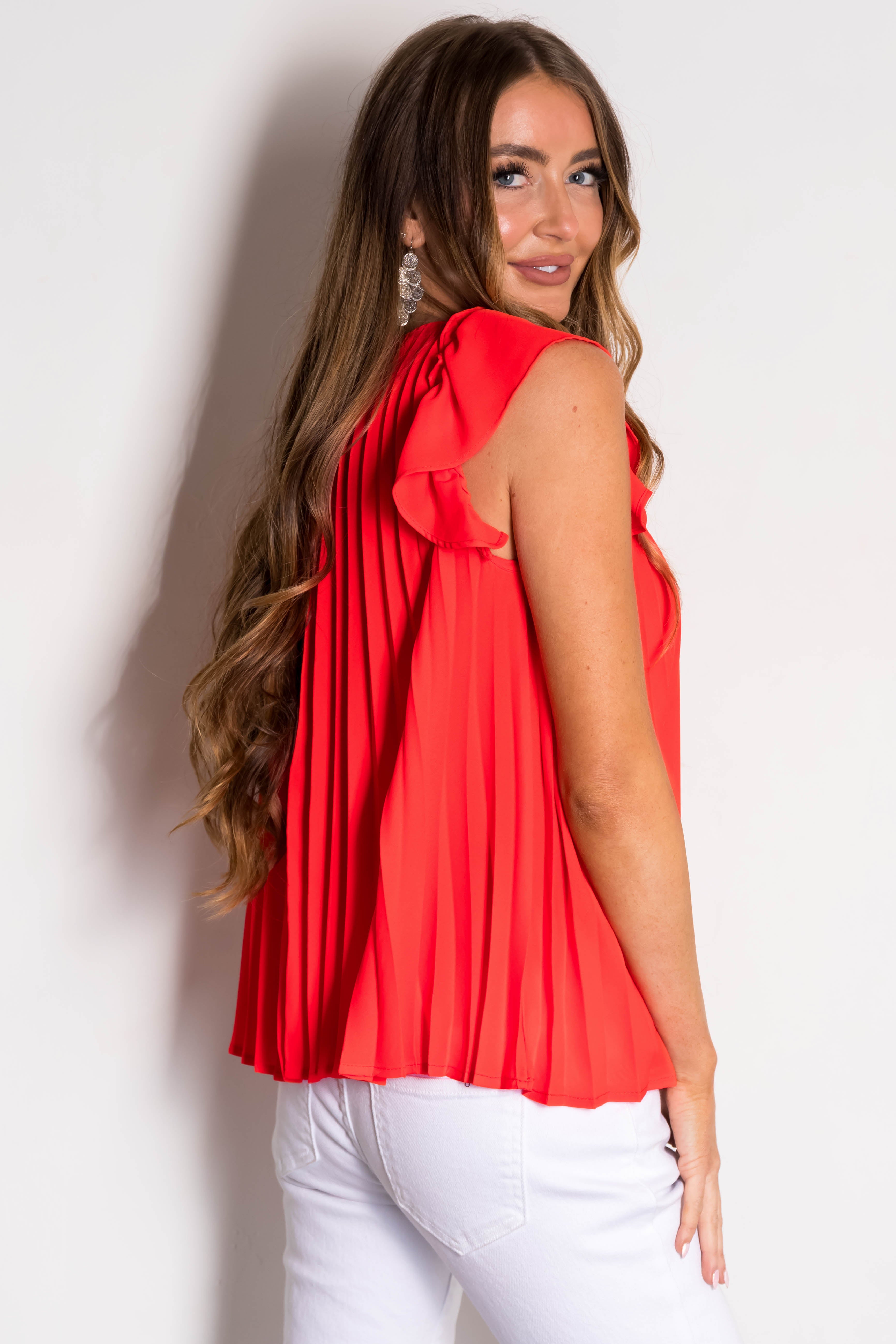 Indulge in chic elegance with our Scarlet Pleated Ruffle Short Sleeve Woven Top for women. Crafted for style and comfort, this top features an oversized fit, non-stretchy woven fabric, back keyhole with button closure, and charming ruffle details on the sleeves. Unlined and made in the USA from 100% Polyester, add a touch of sophistication to any outfit. Whether youre out for brunch or a casual evening, this versatile top is a must-have in every fashion-forward womans wardrobe. For care, hand wash cold with like colors, do not bleach, and wash separately to maintain the vibrant red hue. Model is wearing a size Small. Model Profile: Size 2, Height 58″, Bust 32″, Waist 25″.